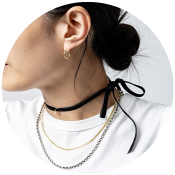 ゴールドとシルバーのミックスが存在感を出してくれます。程よくボリュームがあるけれど合わせやすく、3連のシルバーのどこにフープを通すかで印象が変わります。3連のシルバーを取ってシンプルなフープだけでつけることもできる優れものです。アリエルというネーミングもかわいい!