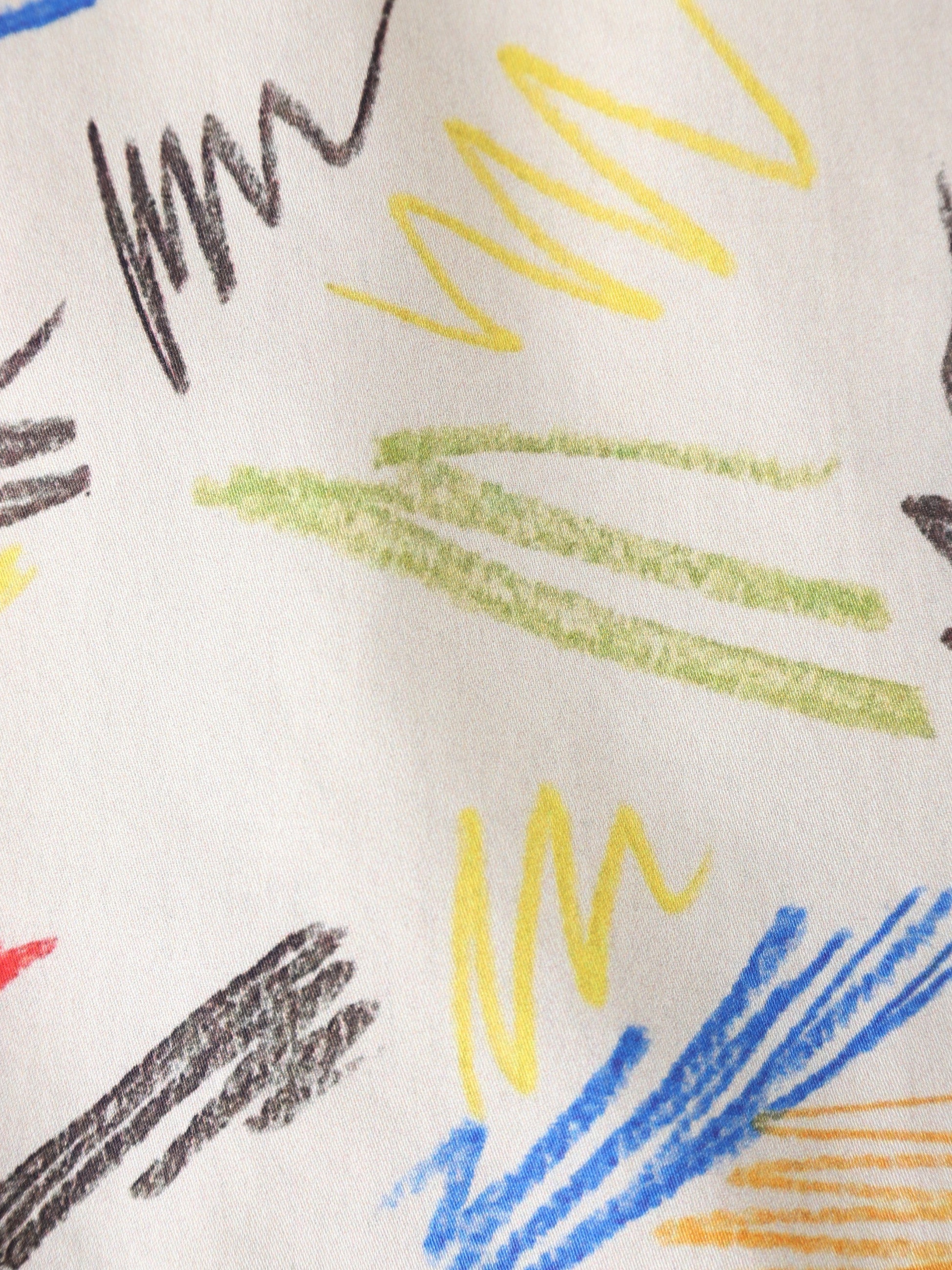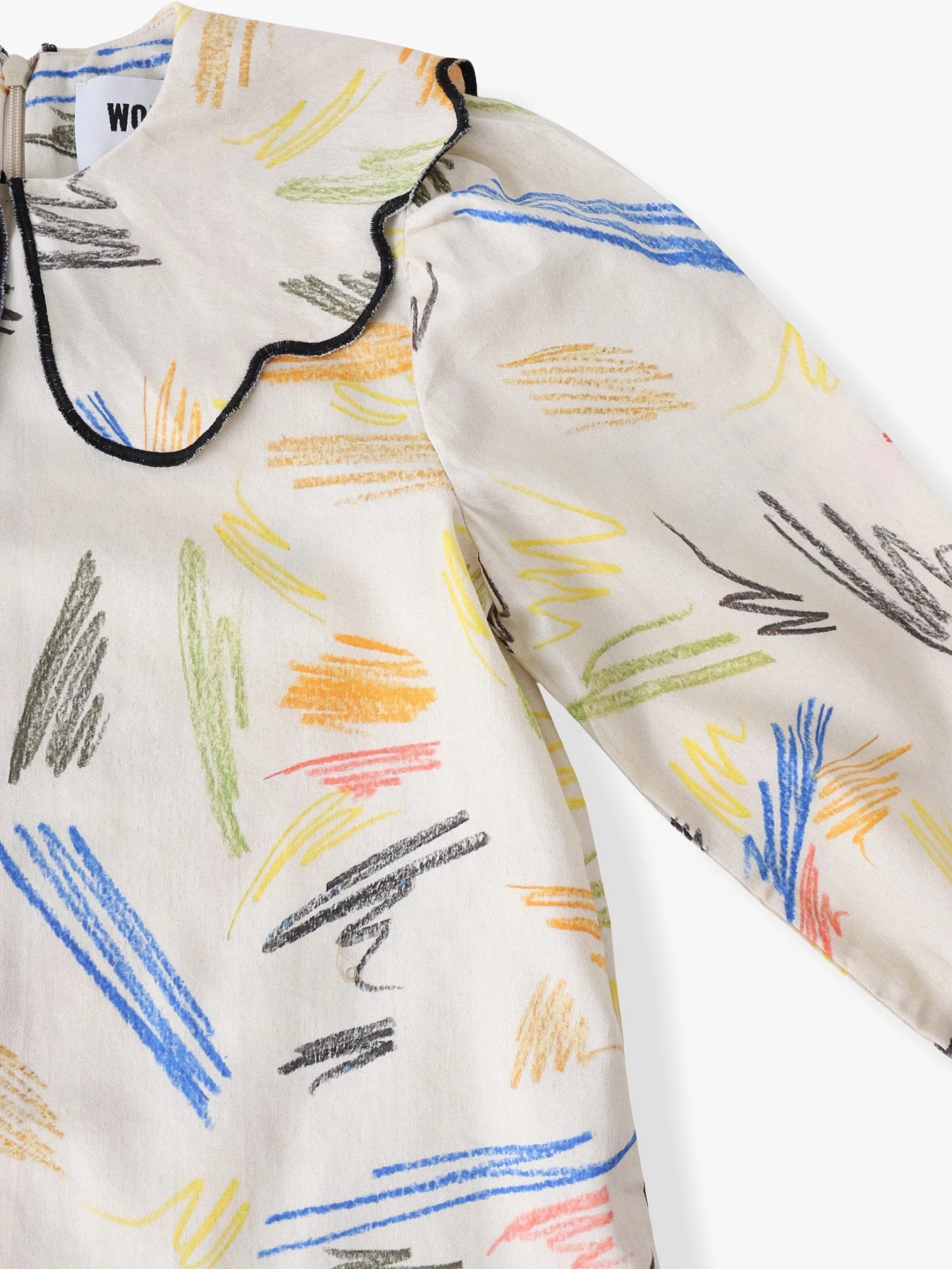 アート柄が華やかなAラインの長袖ドレスは、丸いスカラップカラーもアクセントとなり、全体的にキュートな印象に。袖口には伸縮性があり快適な着心地で、細部までこだわりが詰まったデザインです。