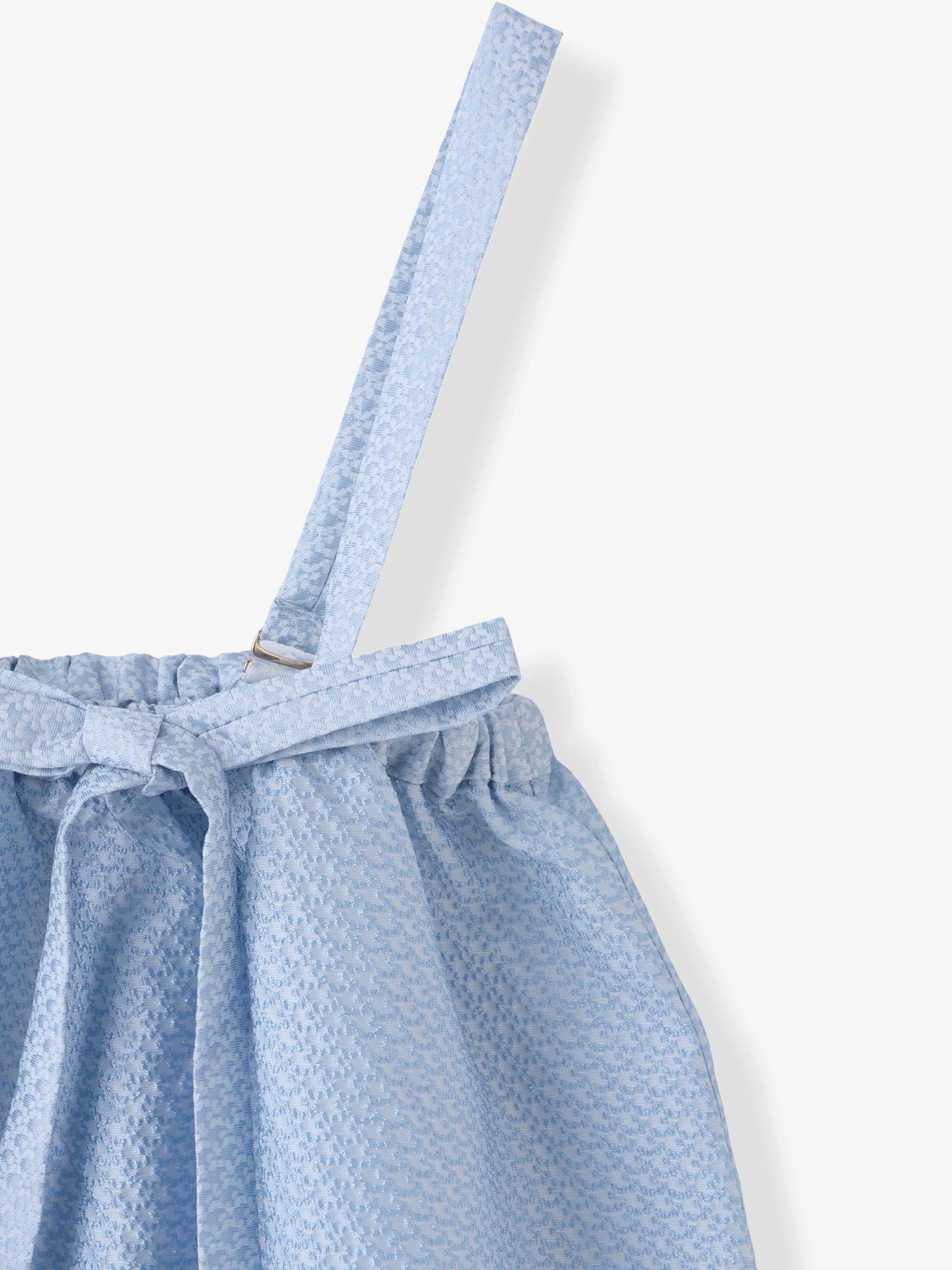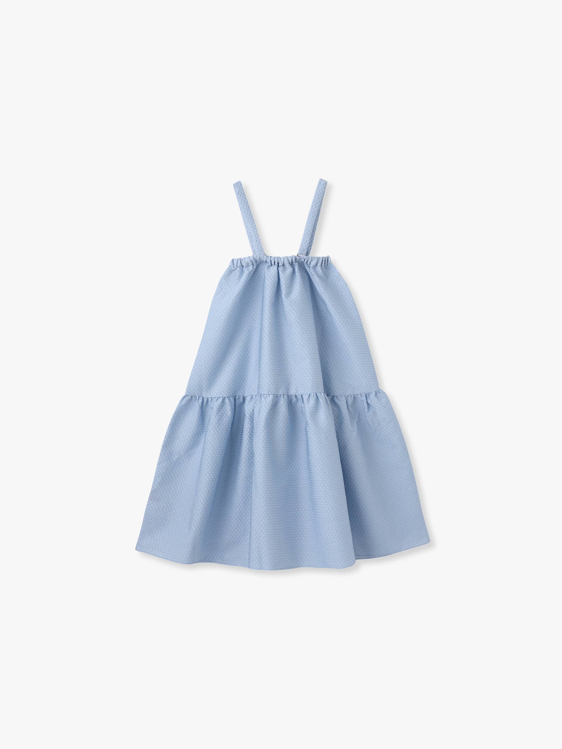 AMICAを代表するCOUTUREシリーズより、上品でクラシカルなブルーのドレスが登場です。ジプソフィル柄のジャカード生地を使用し、繊細な光沢が動くたびに美しく揺れます。甘くなりすぎない上品なフレアシルエットで、デイリー使いから、特別な日にも幅広く活躍します。ワンピースとしてはもちろん、お子さまの成長に合わせてチュニックとしても楽しめるのが魅力です。