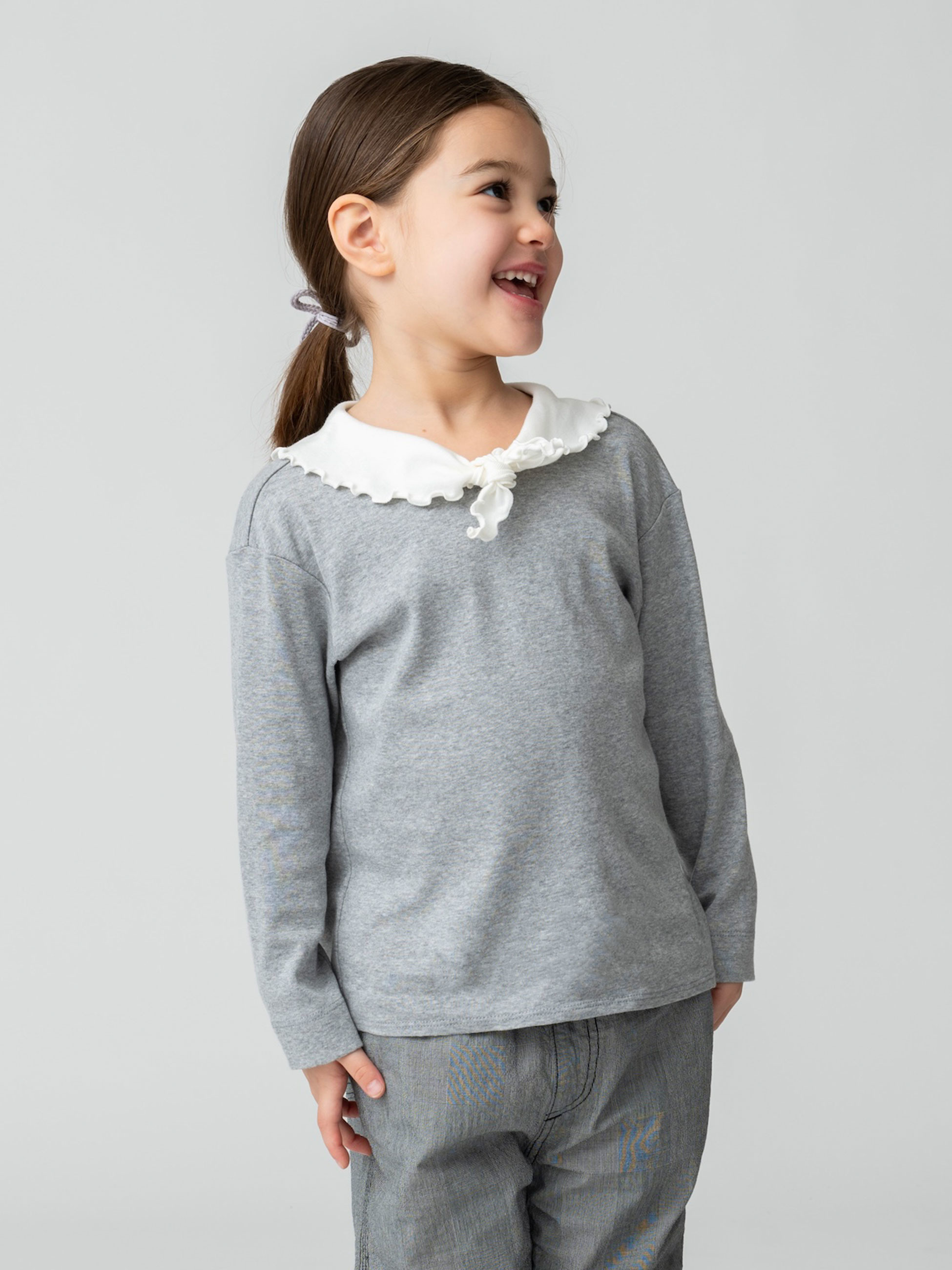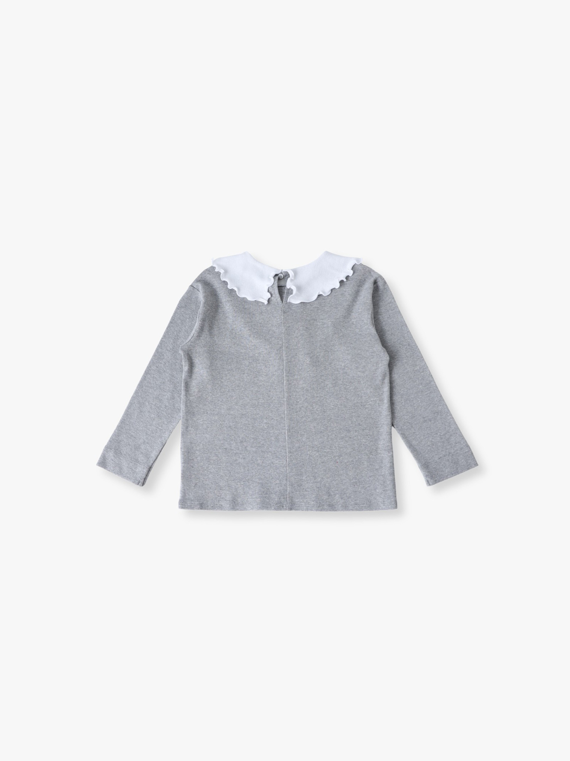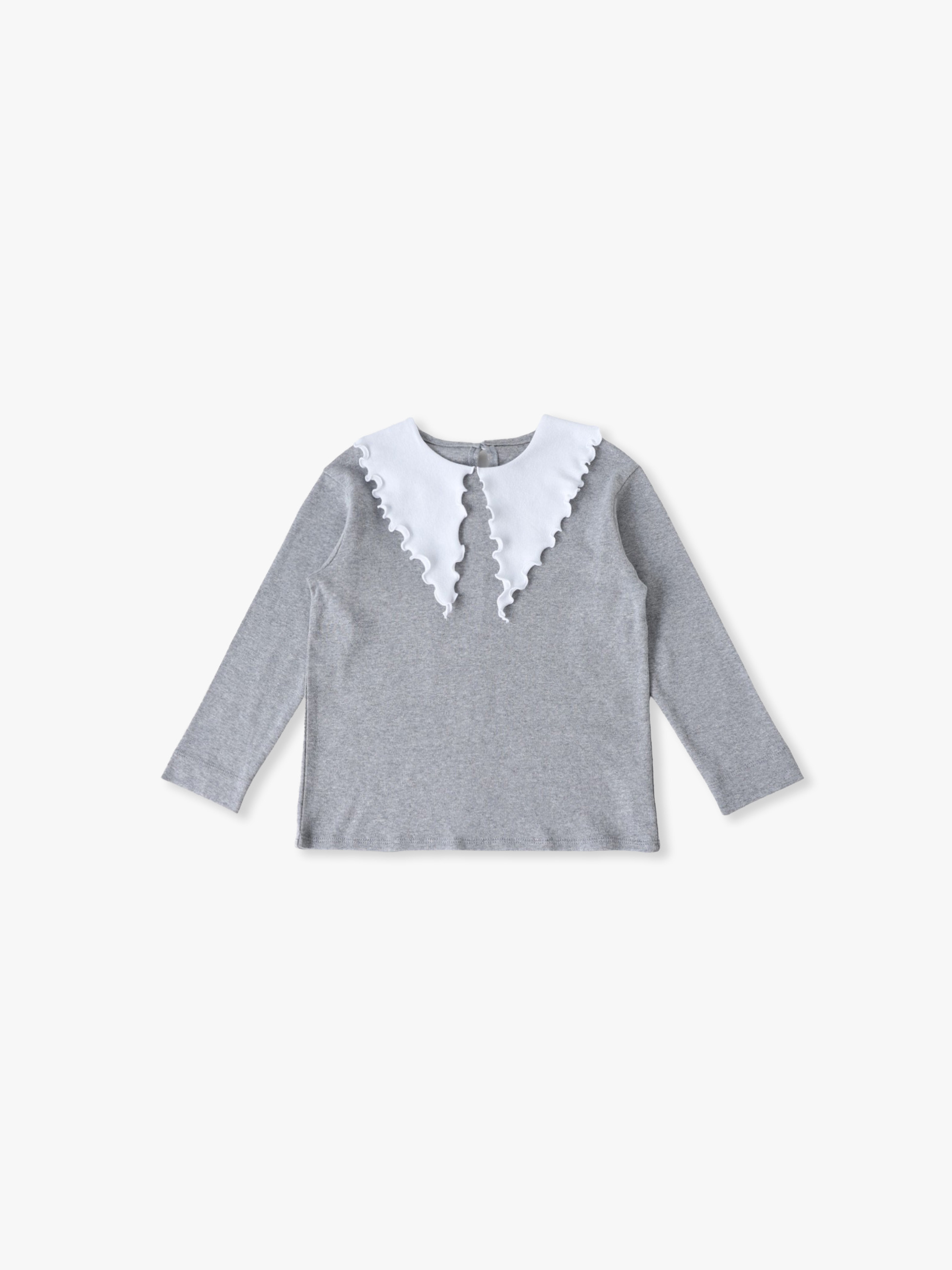 ロンハーマンキッズで別注した特別なアイテムが登場です。ソフト仕上げをしたコットンジャージー素材を使用し、伸縮性が高く着心地も抜群です。可愛らしいフリルの大きな襟は、襟先を結ぶと小さなリボンにアレンジができ、さまざまな表情をお楽しみいただけます。ボトムを選ばず、オーバーオールのインナーとしてなど、どんなスタイリングとも好相性です。お子様の成長とともに、長めの袖丈から七分丈へと変化していき、長く着用いただける一着です。