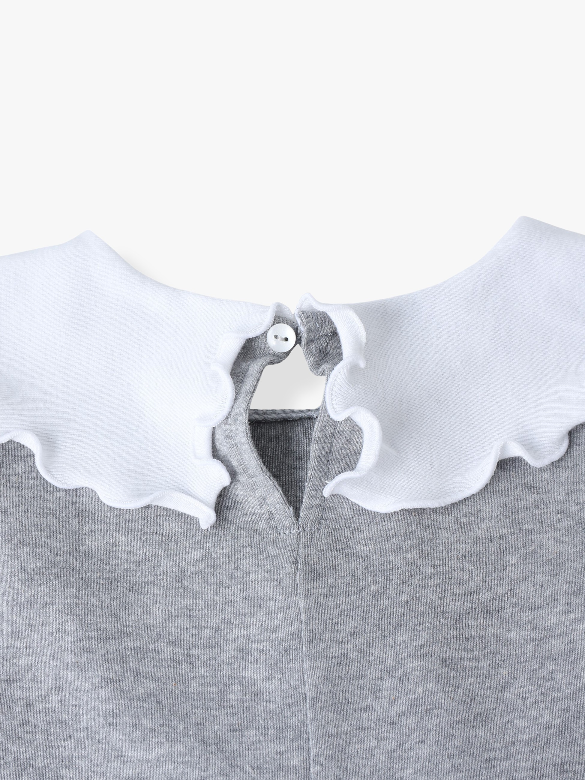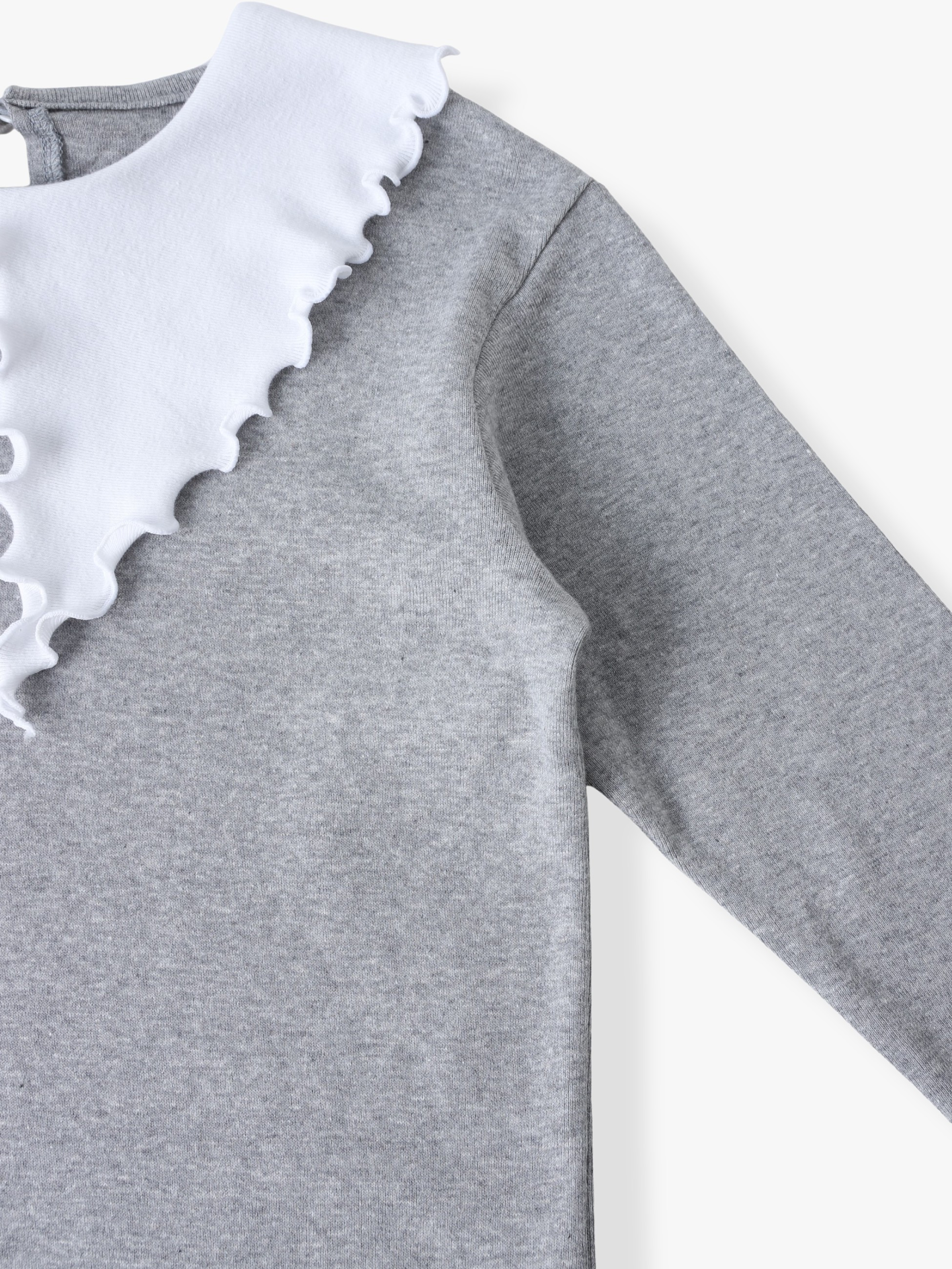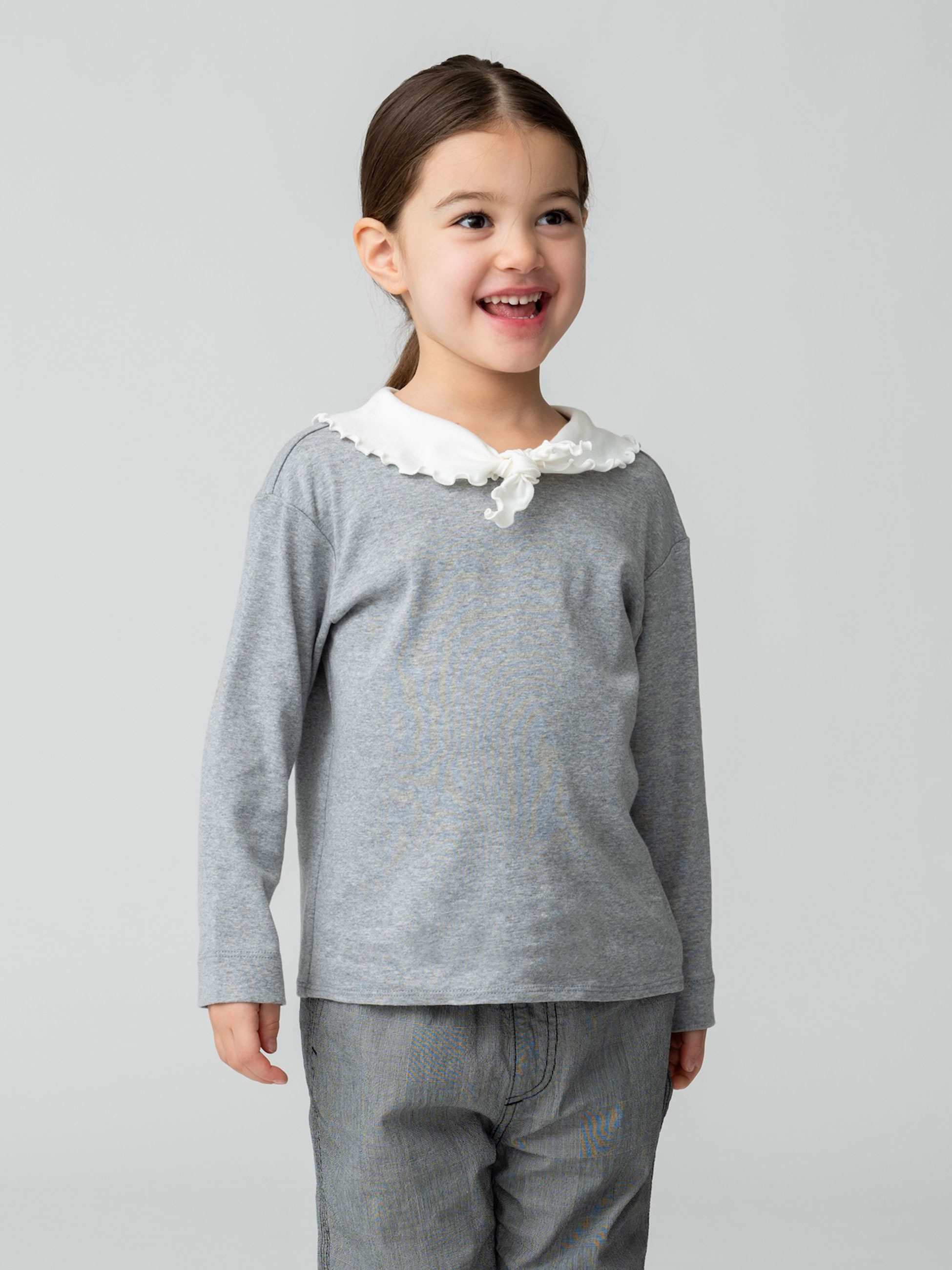 ロンハーマンキッズで別注した特別なアイテムが登場です。ソフト仕上げをしたコットンジャージー素材を使用し、伸縮性が高く着心地も抜群です。可愛らしいフリルの大きな襟は、襟先を結ぶと小さなリボンにアレンジができ、さまざまな表情をお楽しみいただけます。ボトムを選ばず、オーバーオールのインナーとしてなど、どんなスタイリングとも好相性です。お子様の成長とともに、長めの袖丈から七分丈へと変化していき、長く着用いただける一着です。