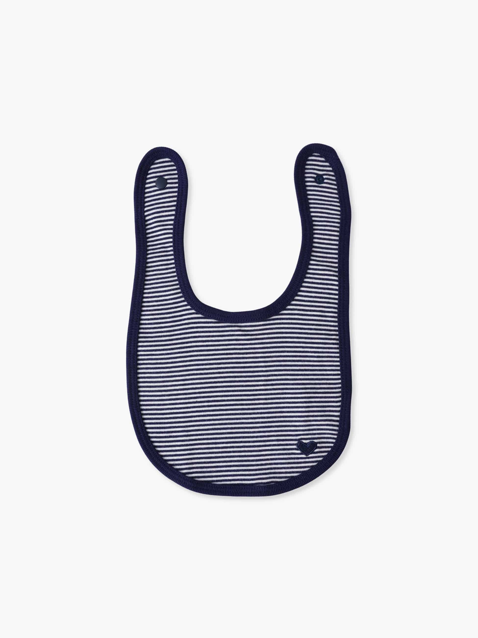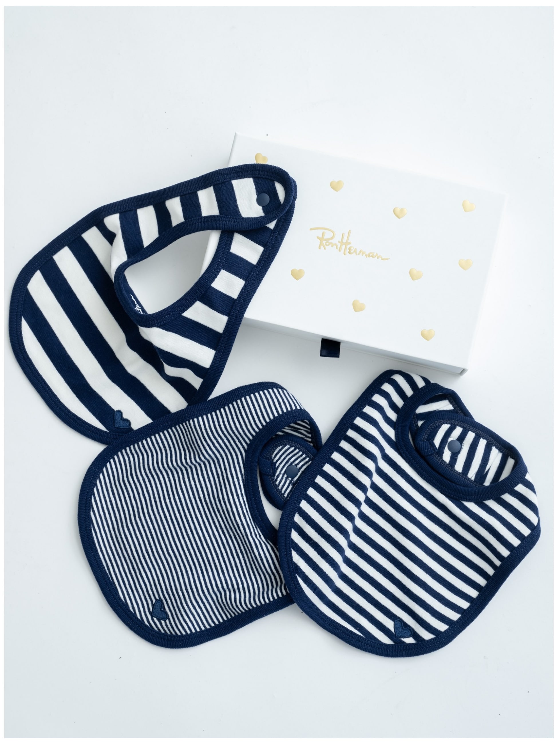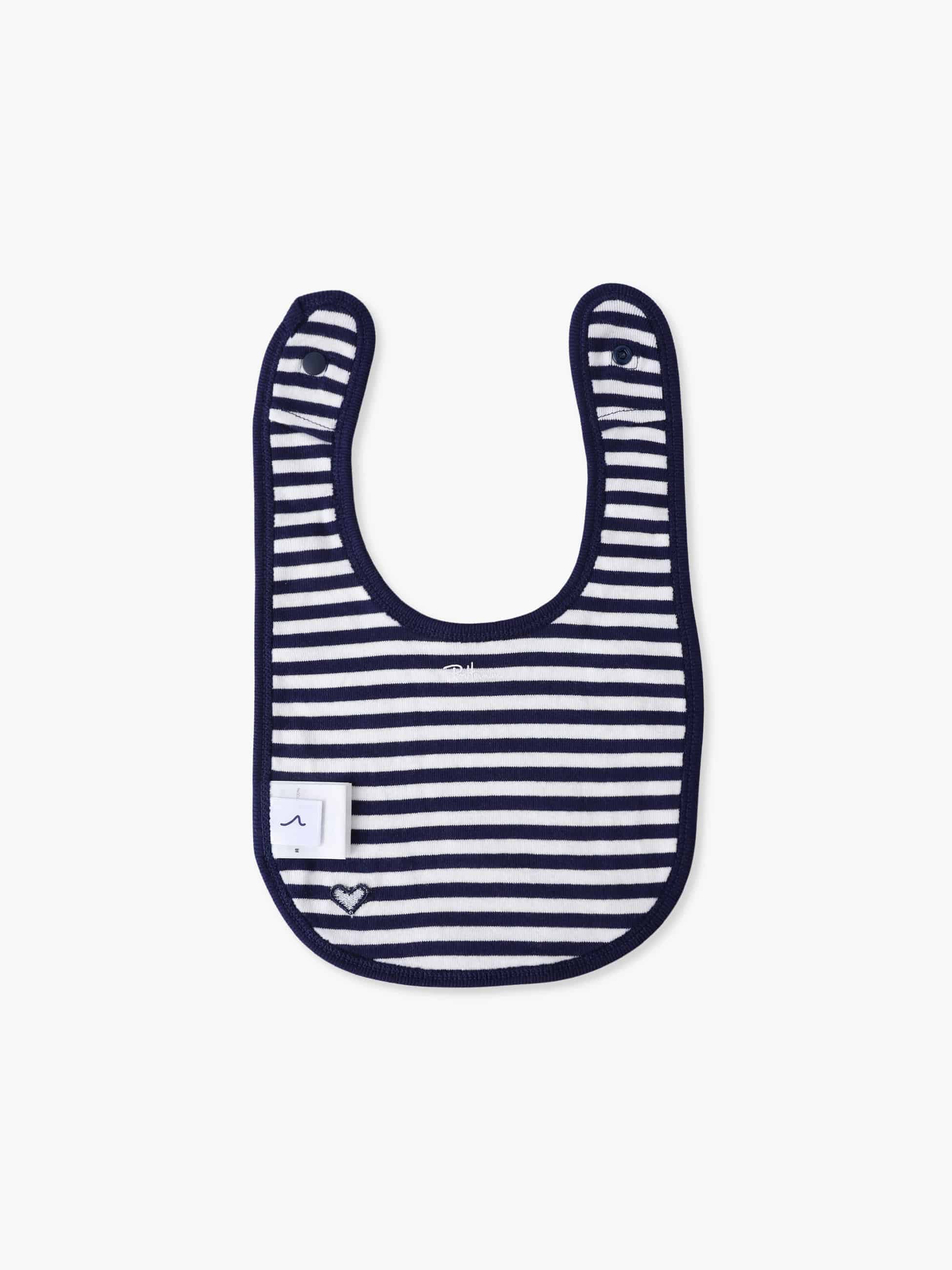 人気のビブギフトボックスセットにキュートなストライプ柄が新登場です。ロンハーマンのイメージカラーであるホワイトにネイビーの異なるストライプピッチのデザイン、可愛らしいハート刺繍がワンポイントで施されています。肌あたりのよいオーガニックコットン空紡糸をフライスで仕上げているため敏感な赤ちゃんの肌にも安心してご利用いただけます。洗練された特別感のあるボックスデザインで、このままギフトとしてお渡しいただけ、使用後はお道具箱としてお使いいただくのもおすすめです。