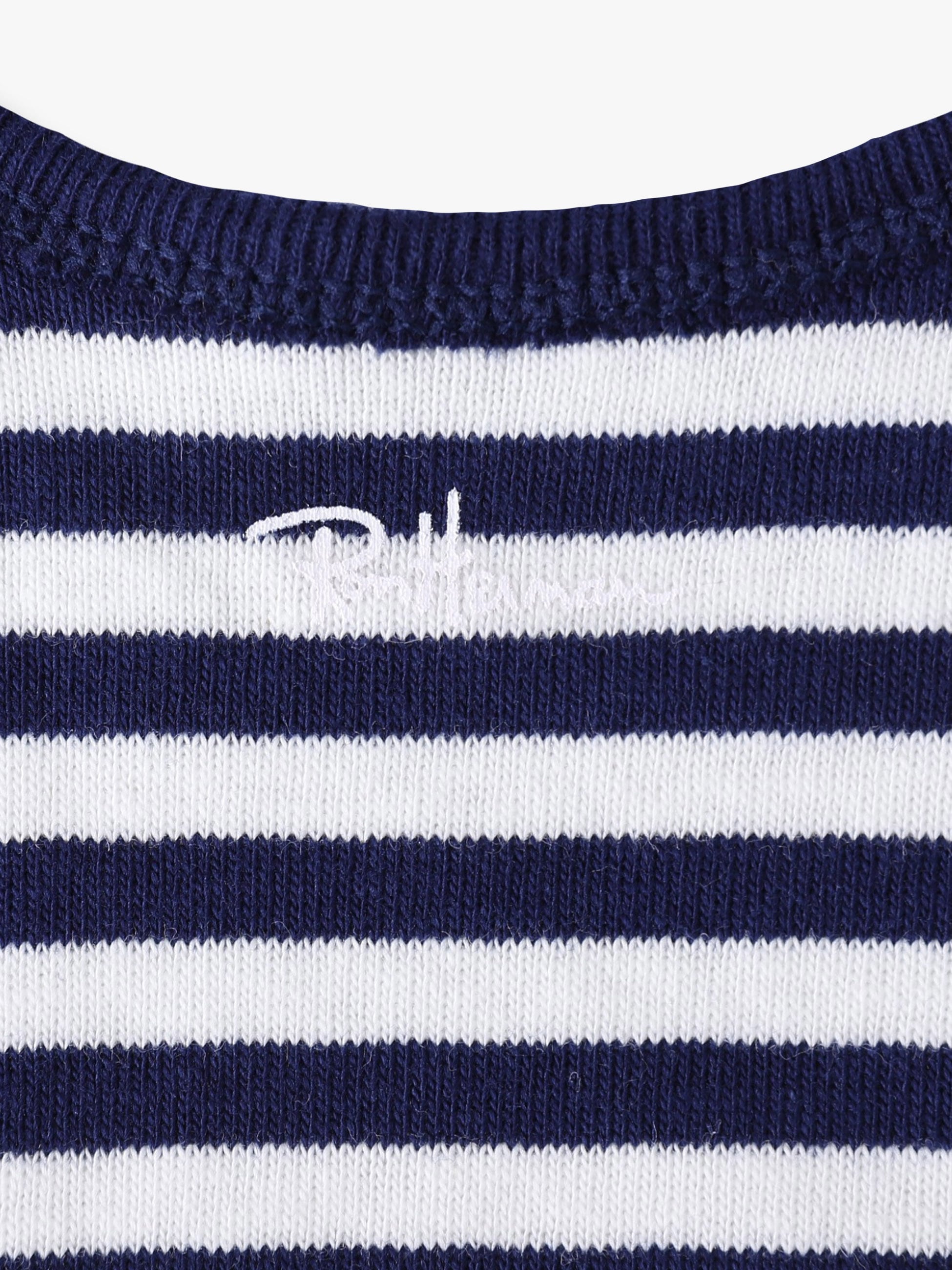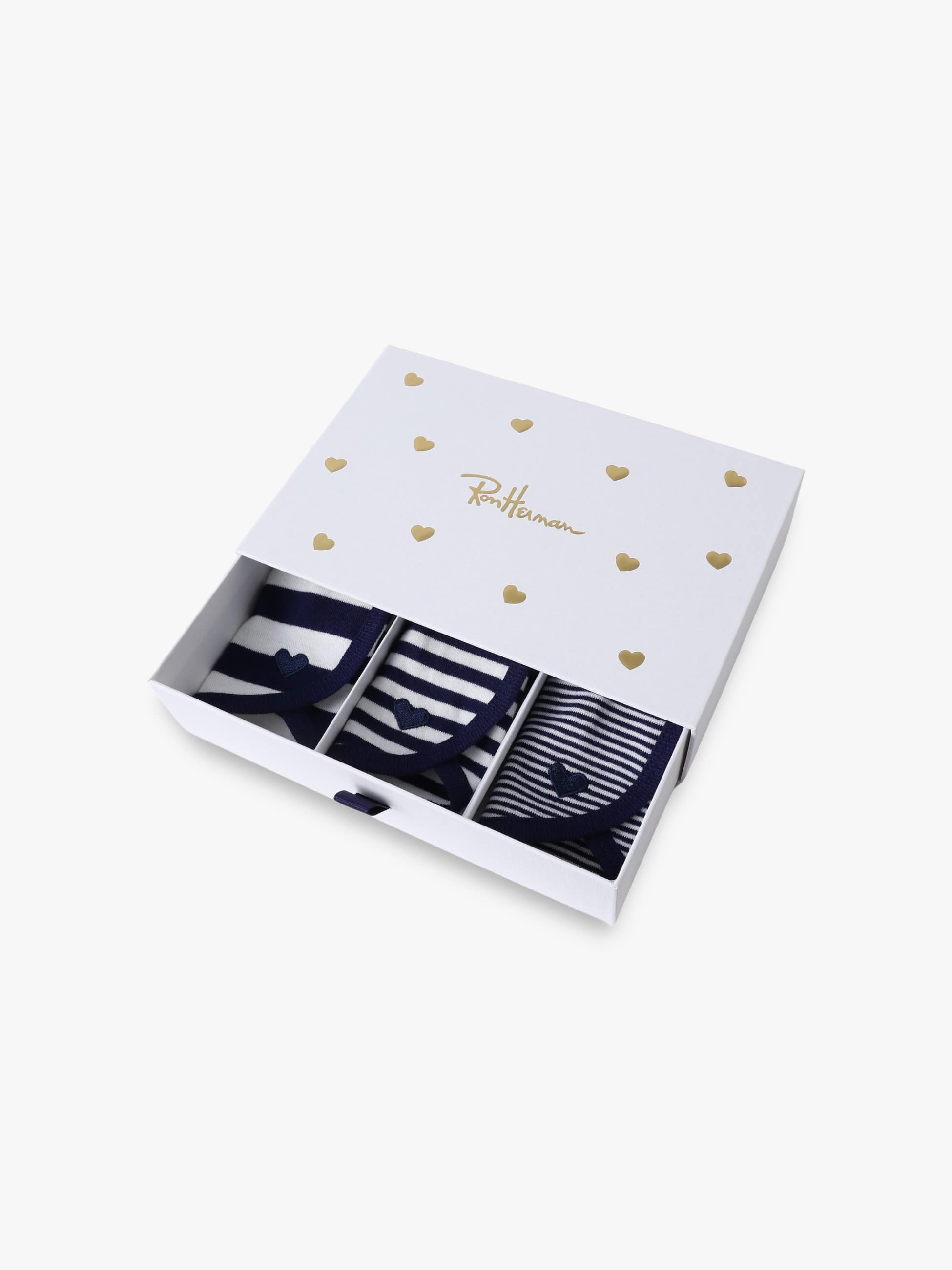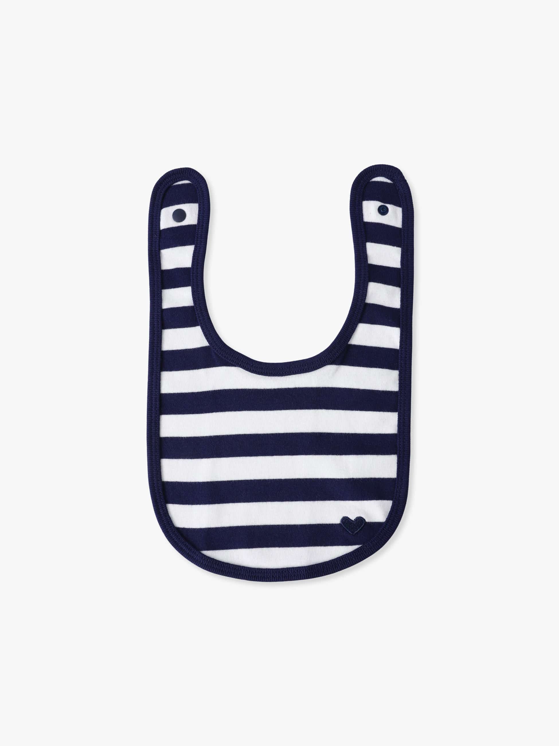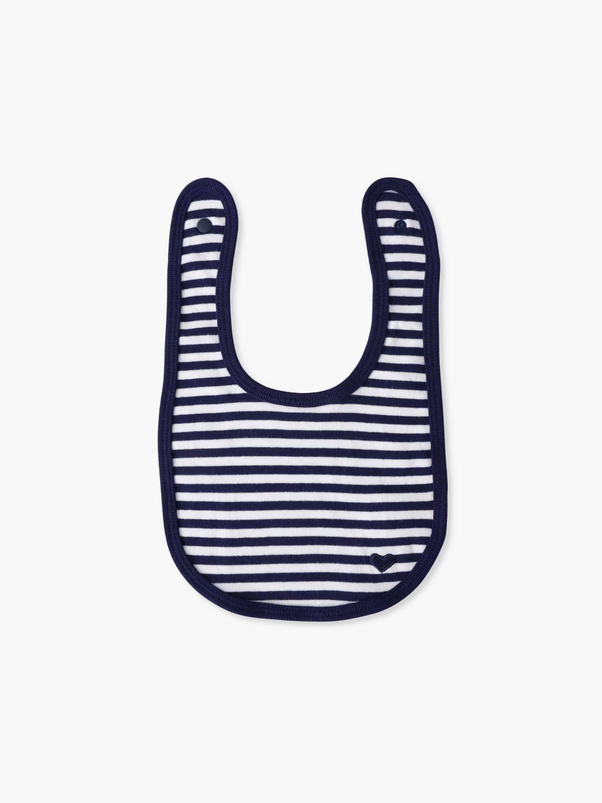 人気のビブギフトボックスセットにキュートなストライプ柄が新登場です。ロンハーマンのイメージカラーであるホワイトにネイビーの異なるストライプピッチのデザイン、可愛らしいハート刺繍がワンポイントで施されています。肌あたりのよいオーガニックコットン空紡糸をフライスで仕上げているため敏感な赤ちゃんの肌にも安心してご利用いただけます。洗練された特別感のあるボックスデザインで、このままギフトとしてお渡しいただけ、使用後はお道具箱としてお使いいただくのもおすすめです。