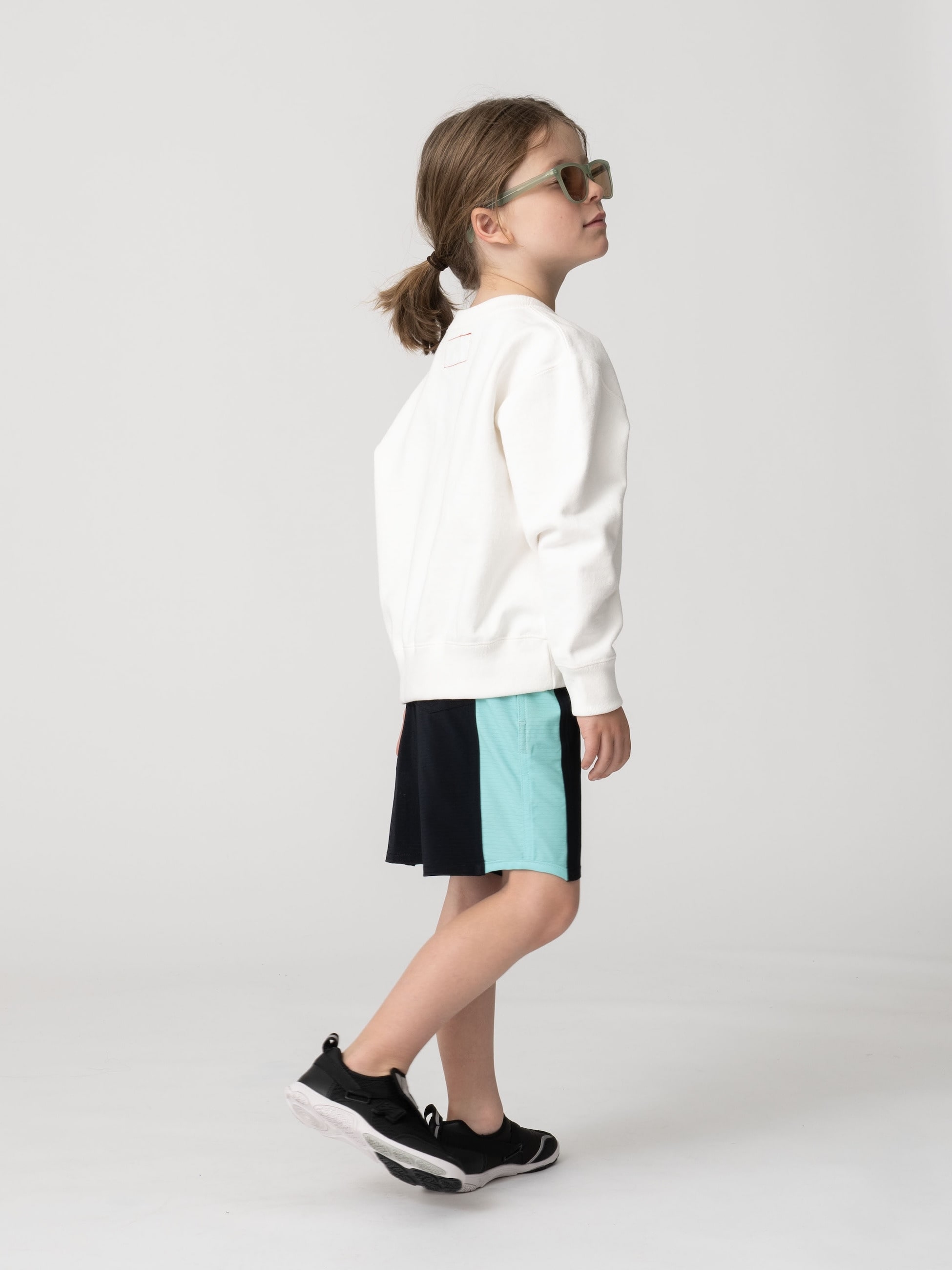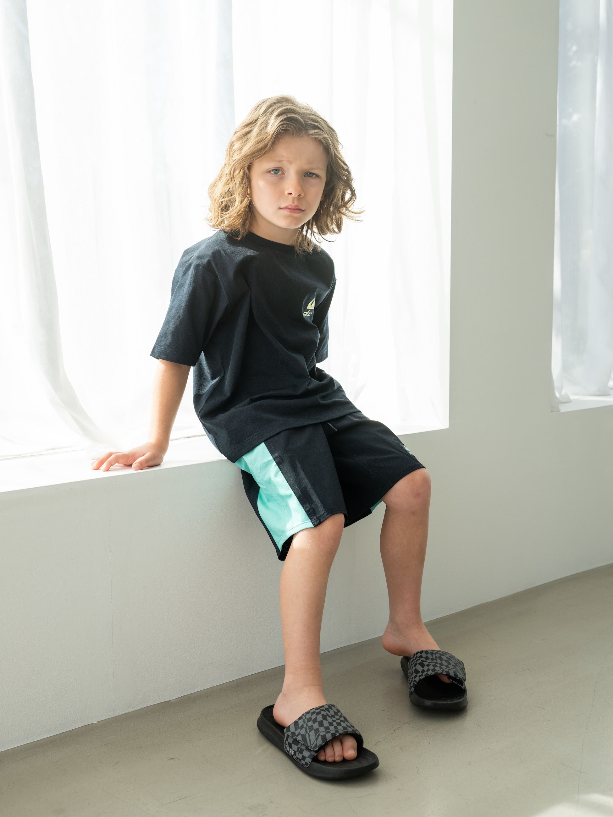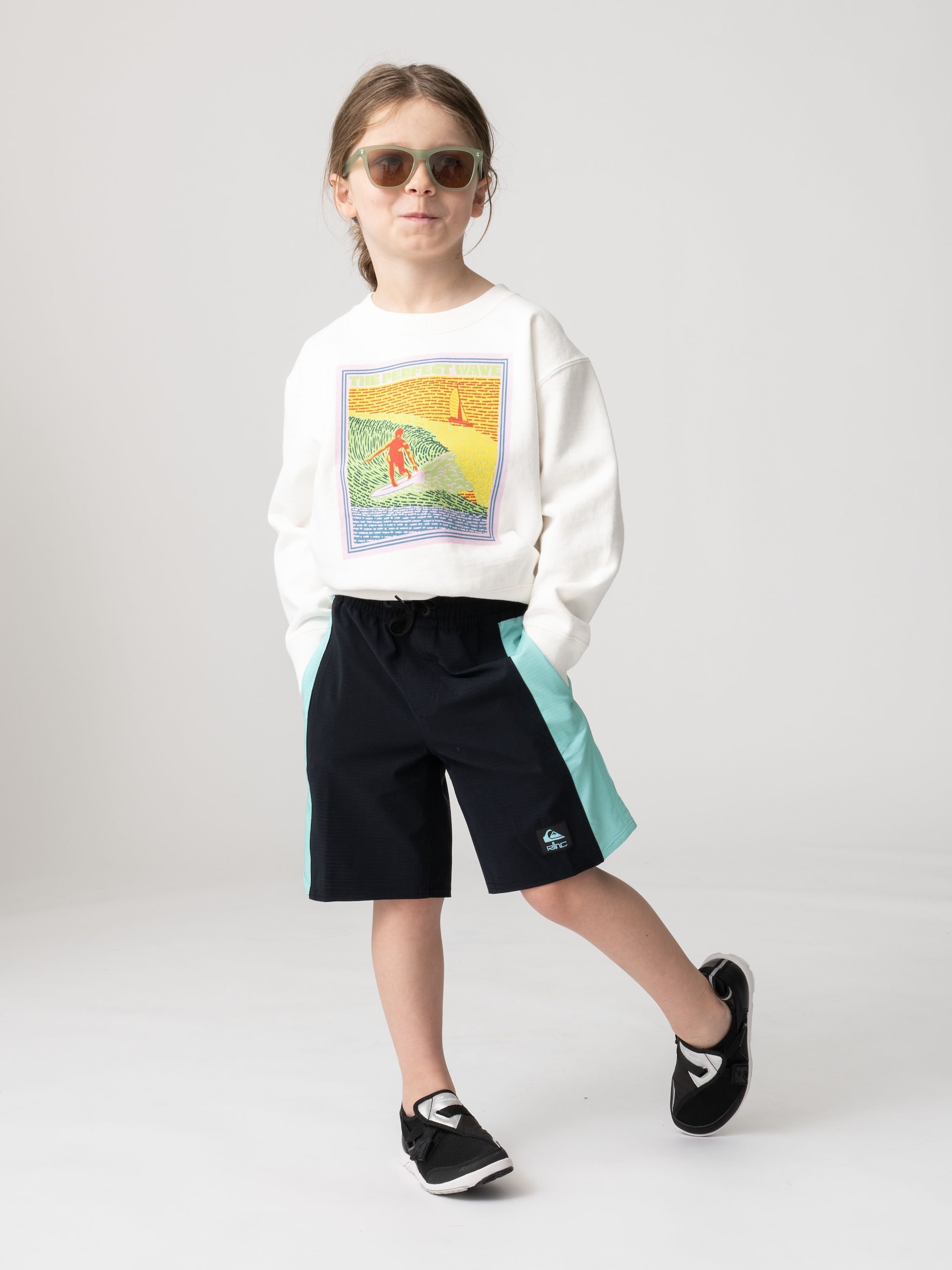 ロンハーマンキッズ別注のショーツは、軽量で速乾性に優れた Highlite 4-way ストレッチ素材 を使用しているため、日常でも水辺でも快適に着用できます。4方向に伸びる柔軟な生地は動きに合わせてスムーズにフィットし、キッズラインでは初採用です。さらに、植物由来の撥水コーティングを施しているため、水に濡れてもストレスを感じにくく、アクティブなシーンでも軽やかに動けます。サイズ調整や着脱がスムーズに行える設計のため、お子さま自身でも扱いやすいのも魅力です。同シリーズのグラッシークロスサーフ ティーとセットアップで着ると、統一感のあるスタイルに仕上がります。