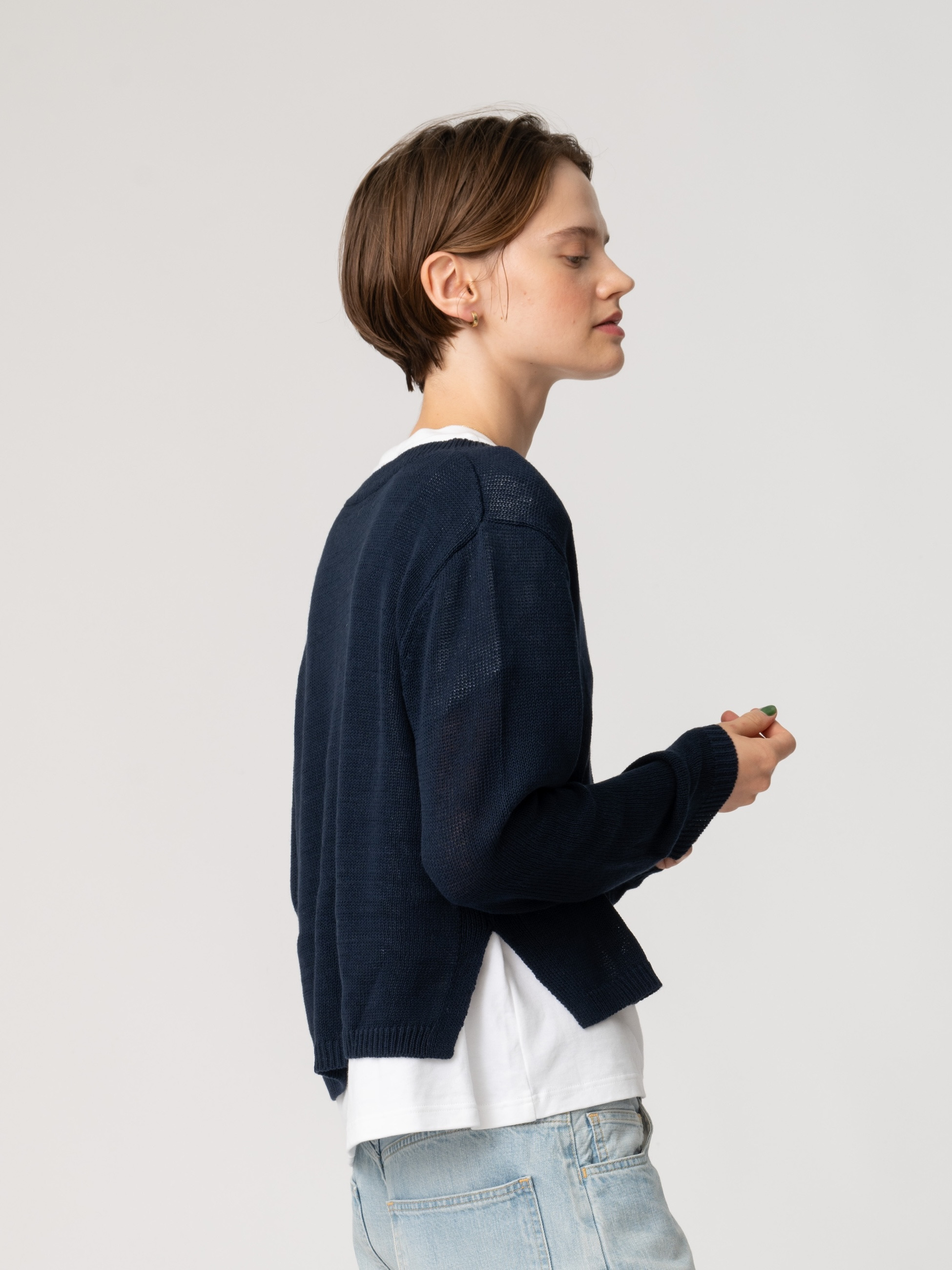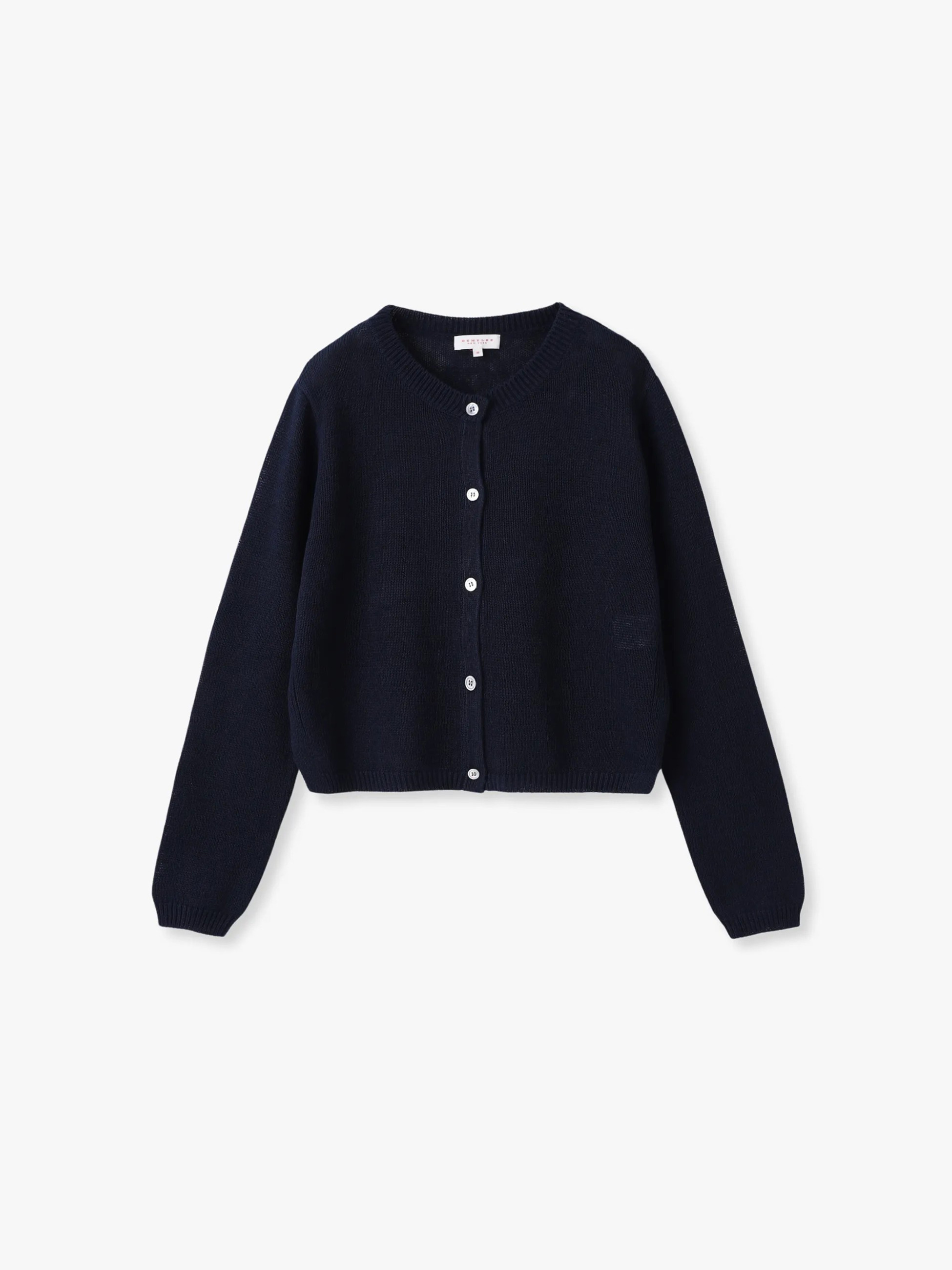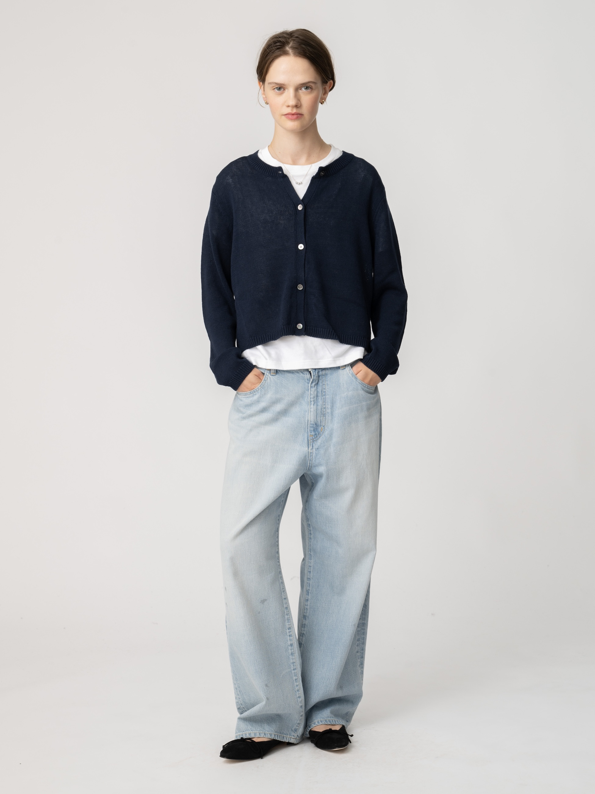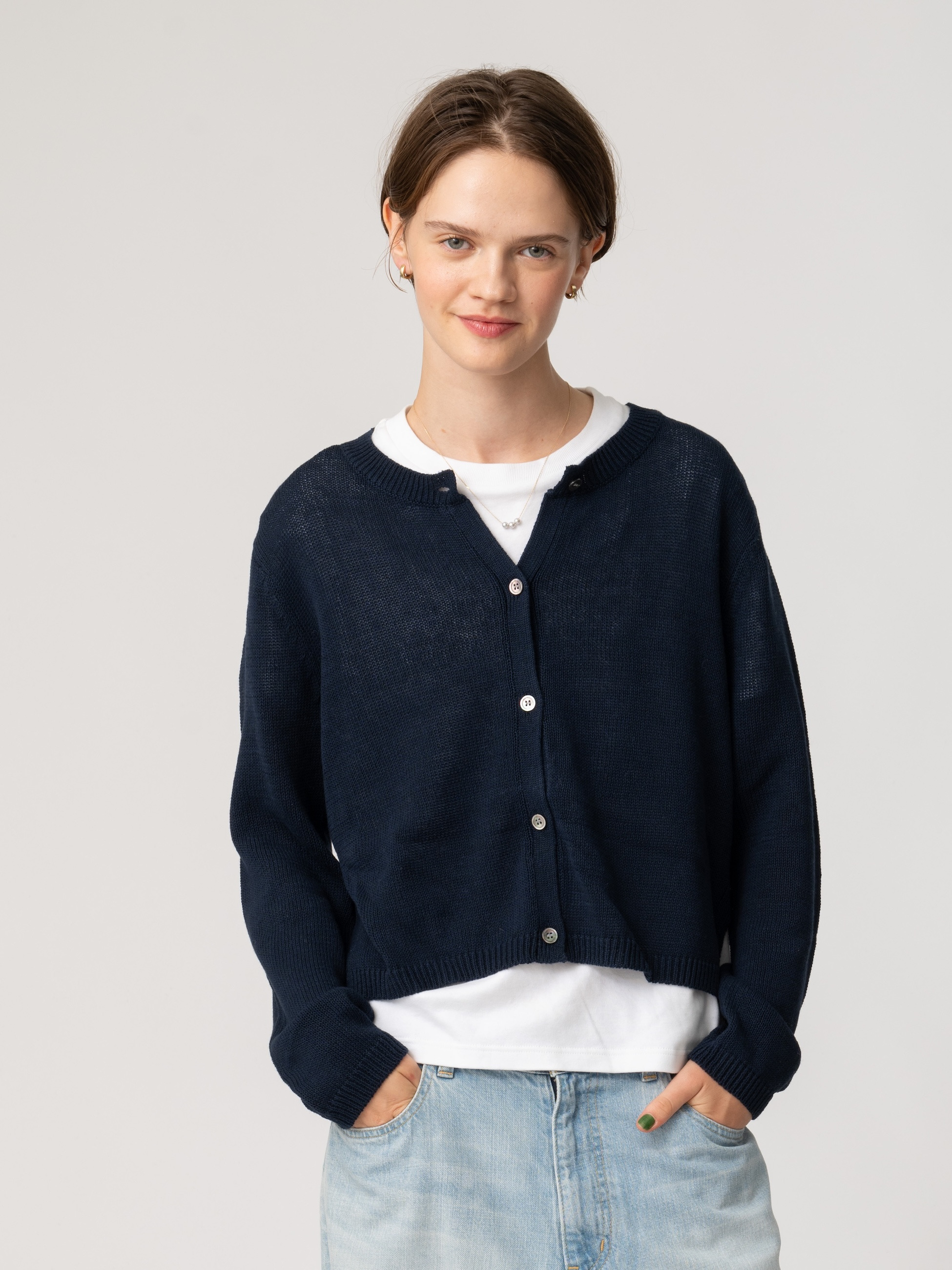 ワードローブにもぴったりのカーディガンは、コットンリネン素材のさらりとした清涼感と、肌に心地よくなじむ柔らかな風合いが心地よい一枚です。シンプルなクルーネックデザインは、羽織りとしてはもちろん、ボタンを留めてニットプルオーバーとしても活躍します。