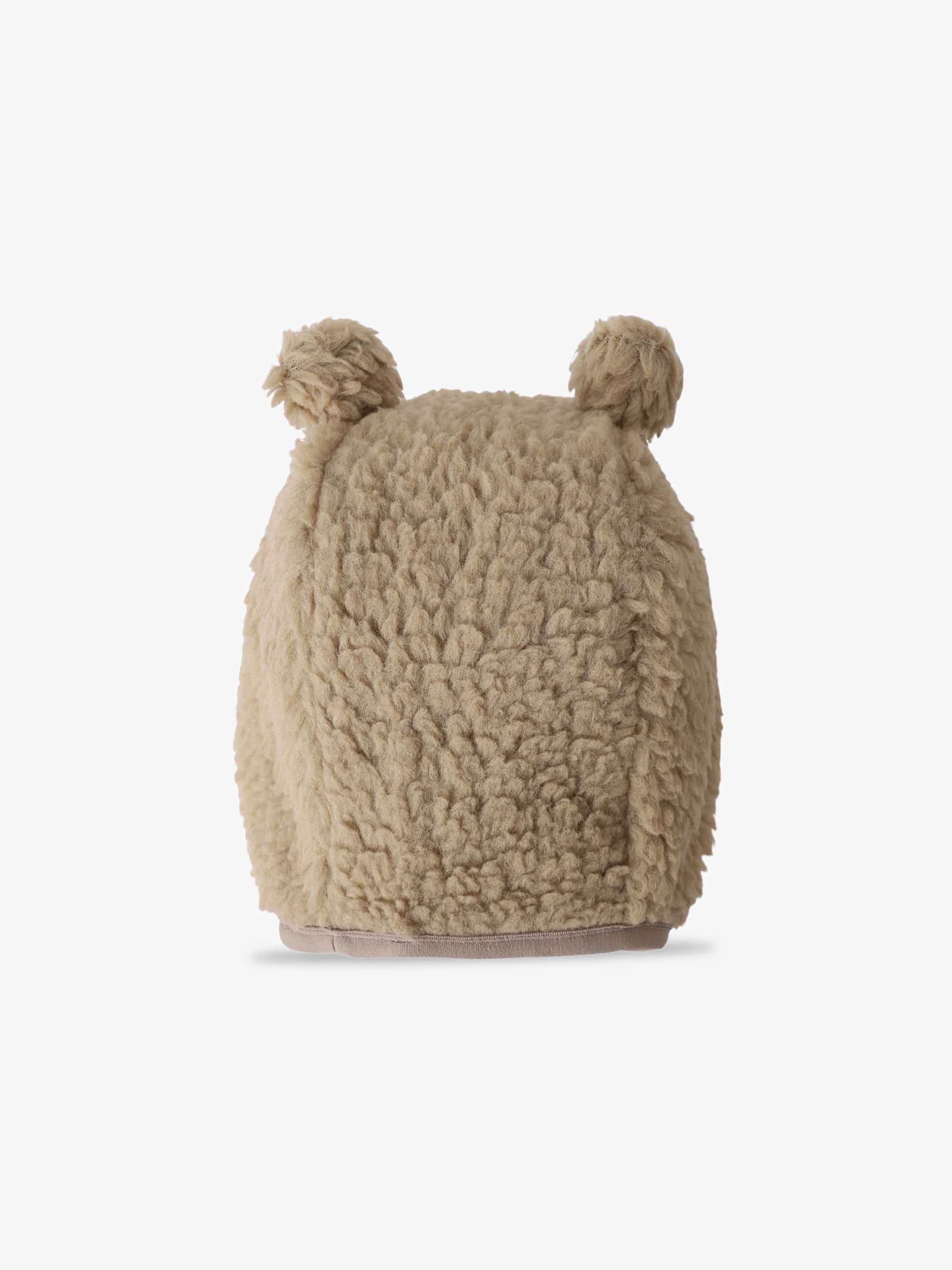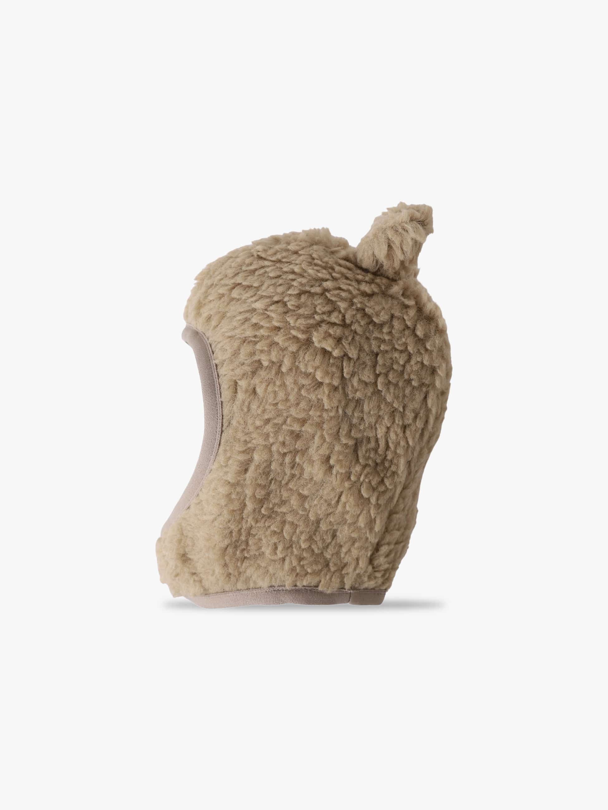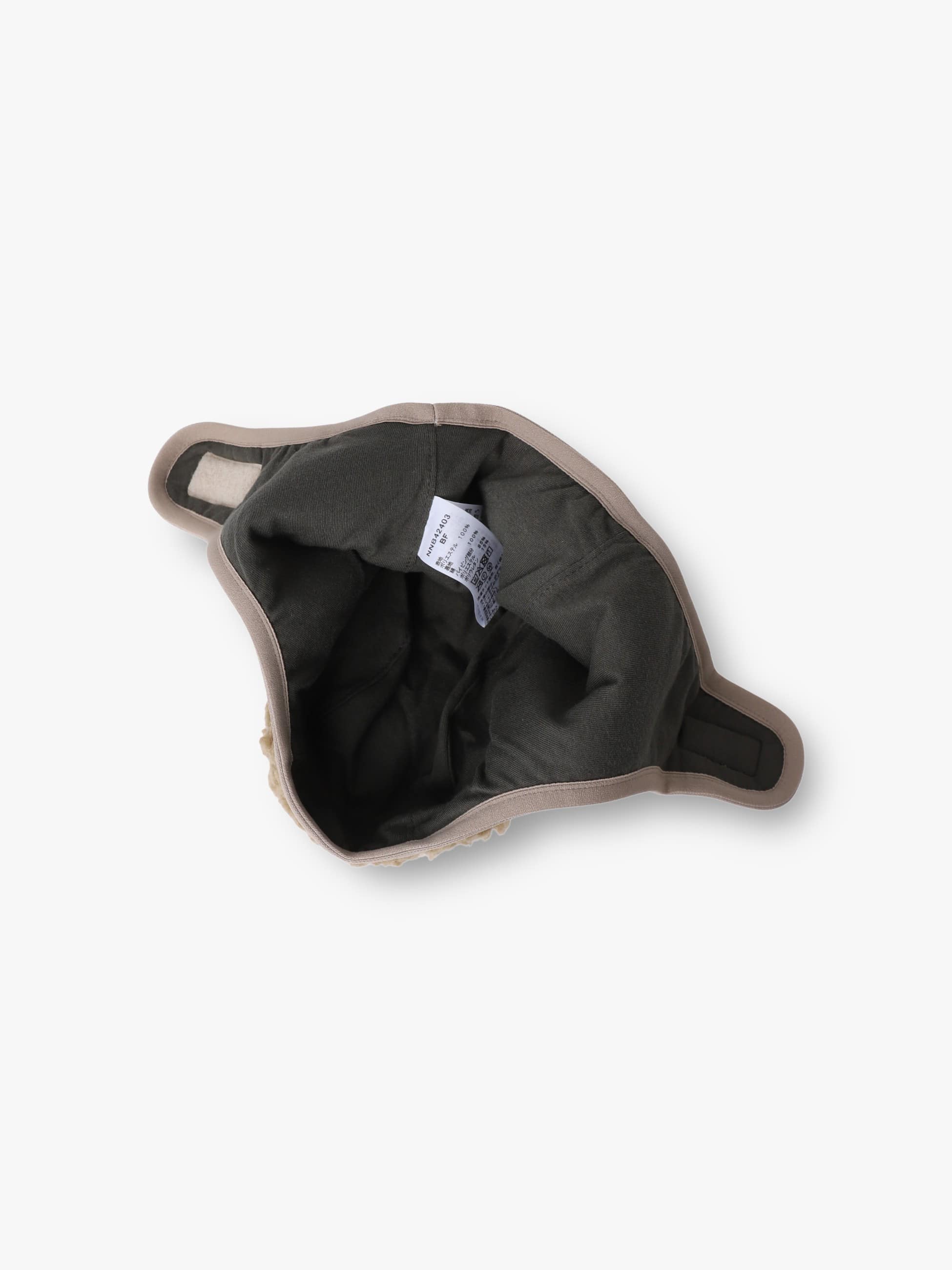 かわいらしい小さな耳付きのベビー用キャップは、被るだけでとびきりキュートなアイテムです。表面には毛足の長いボアフリースを使用し、ふっくらとしたかさ高であたたかく、裏地には肌触りのよいコットン天竺を採用しています。首元のベルトはマジックテープ仕様で、着脱がしやすい仕様です。秋から冬の外遊びやお出かけに活躍するアイテムです。