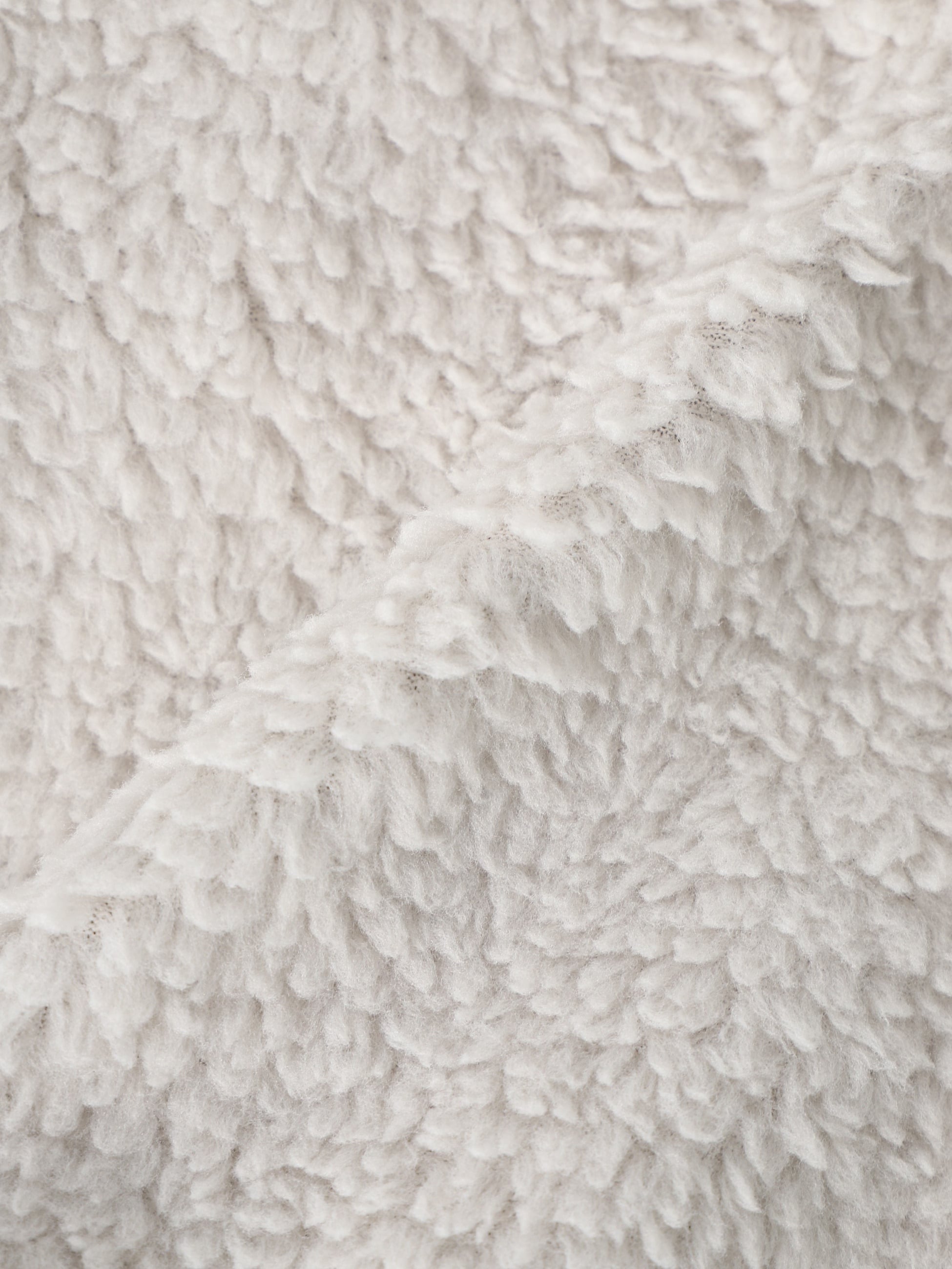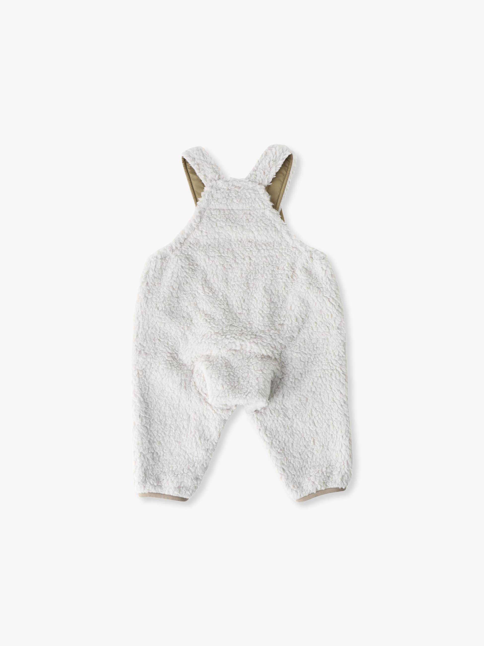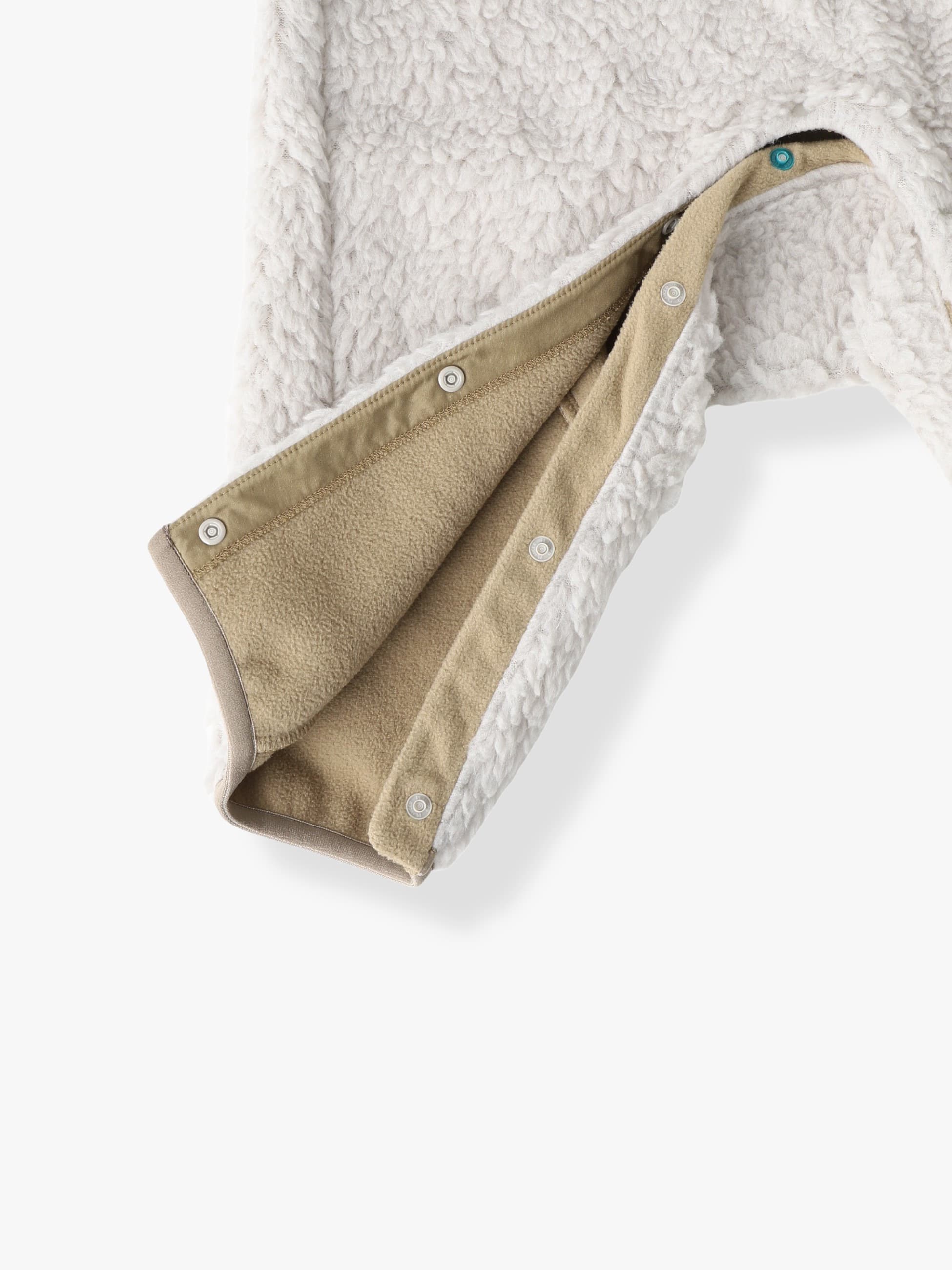 ふわふわとしたフリース素材のロンパースは、見た目にもあたたかみがあり秋冬のお出かけにぴったりです。 表地には毛足の長いボア、内側にはなめらかなマイクロフリースを使用し、やさしい風合いに仕上げています。 肩と股下にはスナップボタンを採用しているため、お着替えもスムーズに行えます。