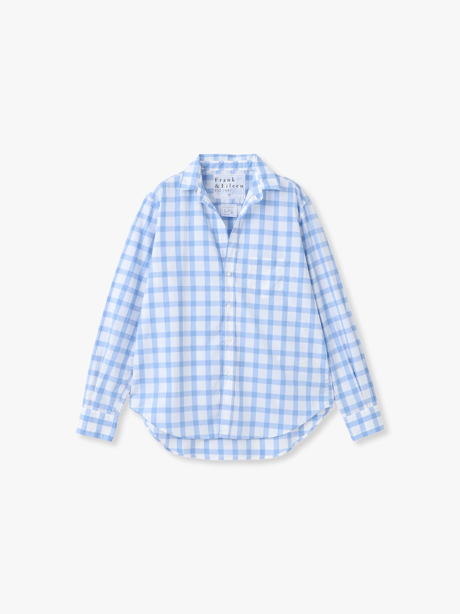 Frank&Eileen定番人気のアイリーンシャツは、やや長めの着丈と、ワイドすぎない程よいリラックス感のあるシルエットが特徴です。爽やかなライトブルーのギンガムチェック柄はコーディネートのポイントとなり、羽織としても重宝します。Frank&Eileenのその他のアイテムもございます。