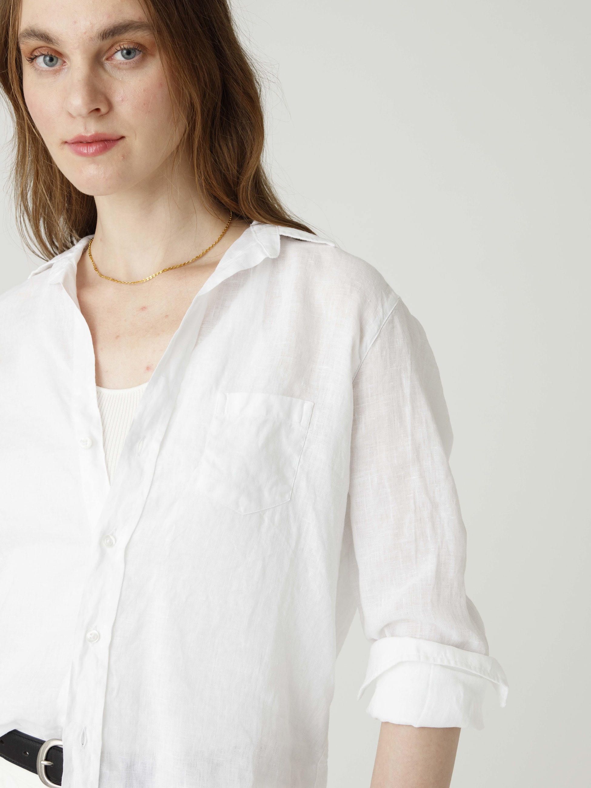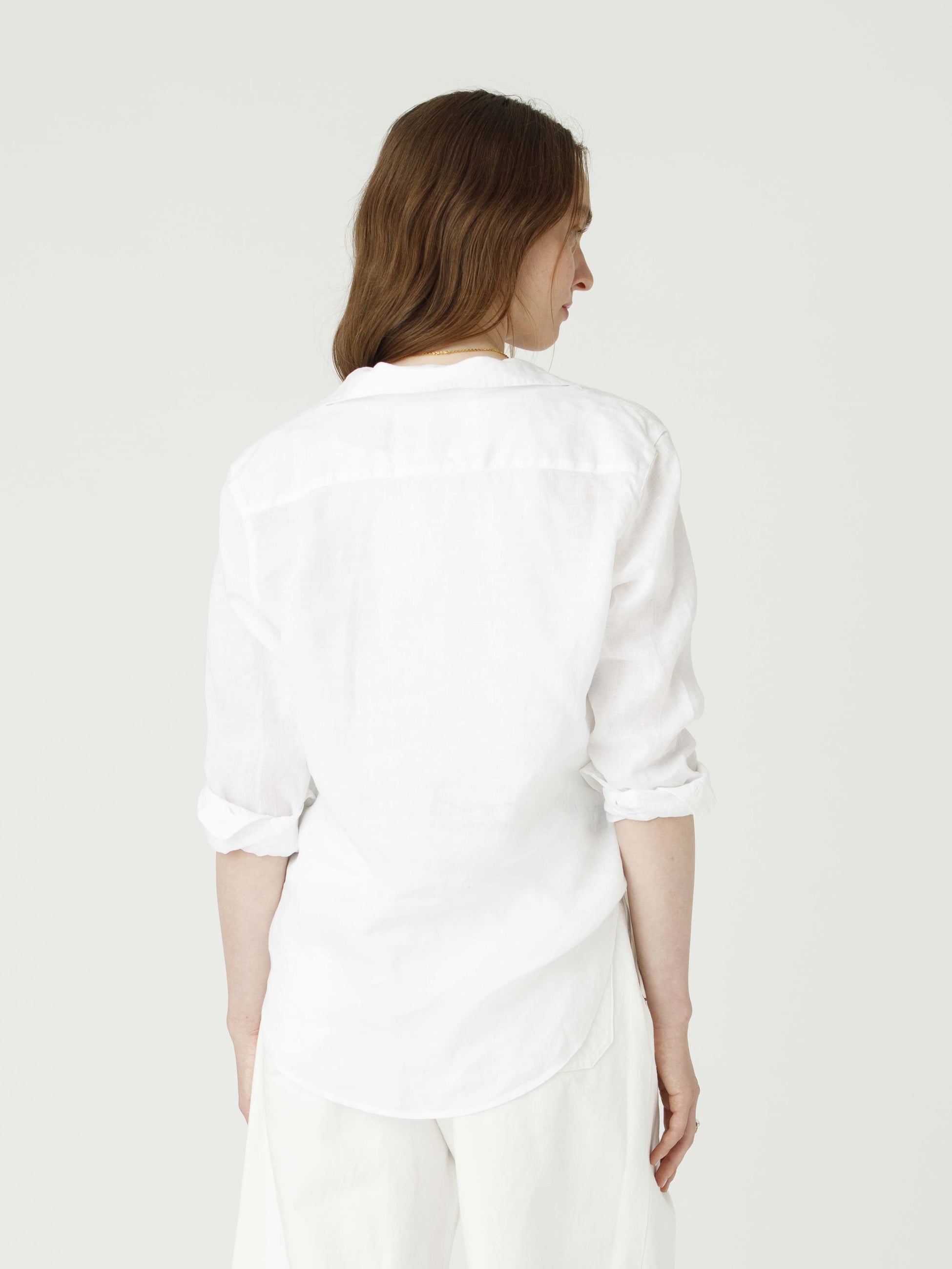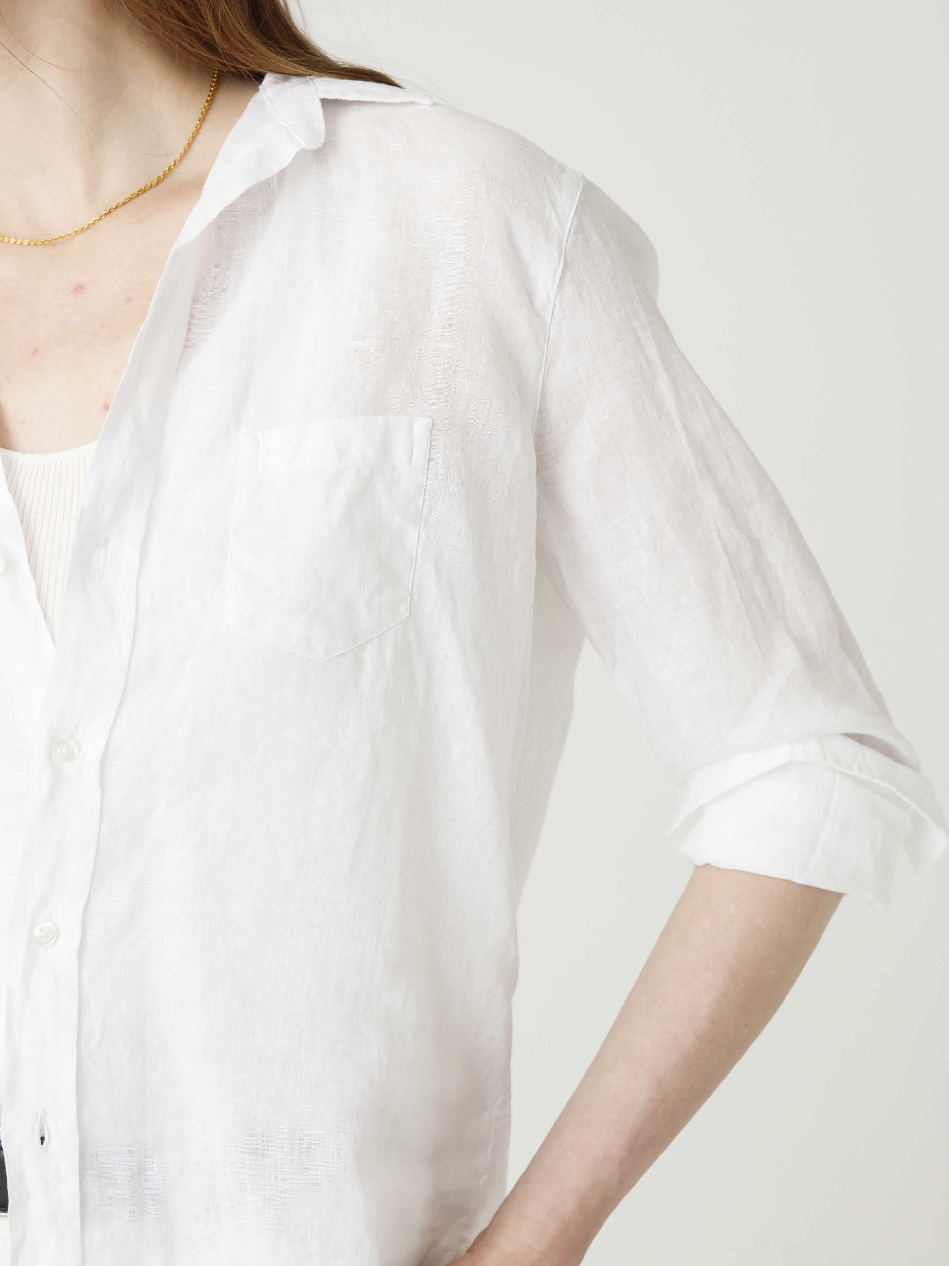 - メンズシャツのようなビッグシルエットが特徴的なアイリーンモデルのシャツは、リラックス感があり、ヒップまでかかる着丈で着心地の良い柔らかく軽やかなリネンを使用しています。クリーンなホワイトカラーは洗練された大人の印象を演出し、1枚で様々な着こなしを楽しめる万能アイテムです。