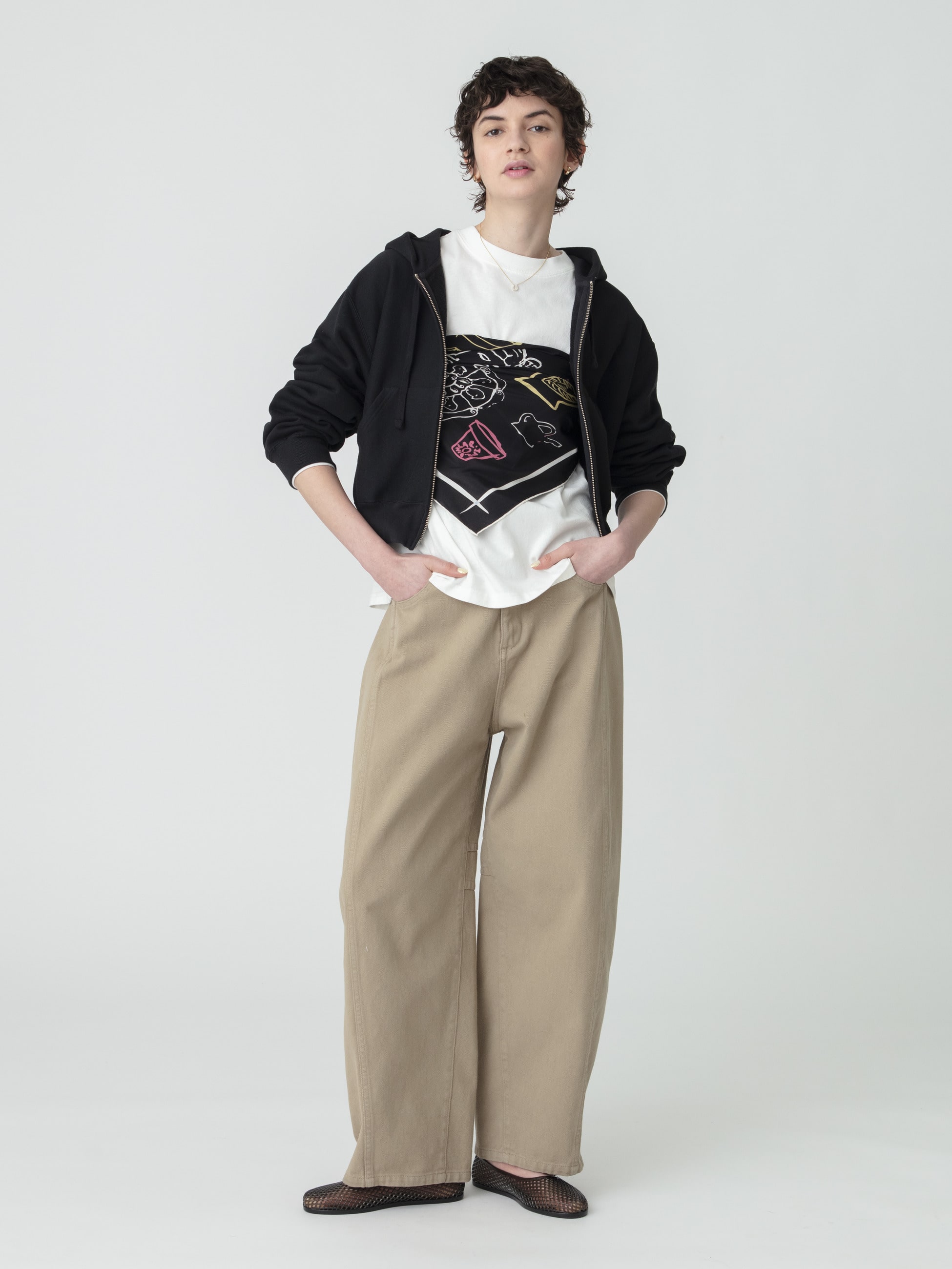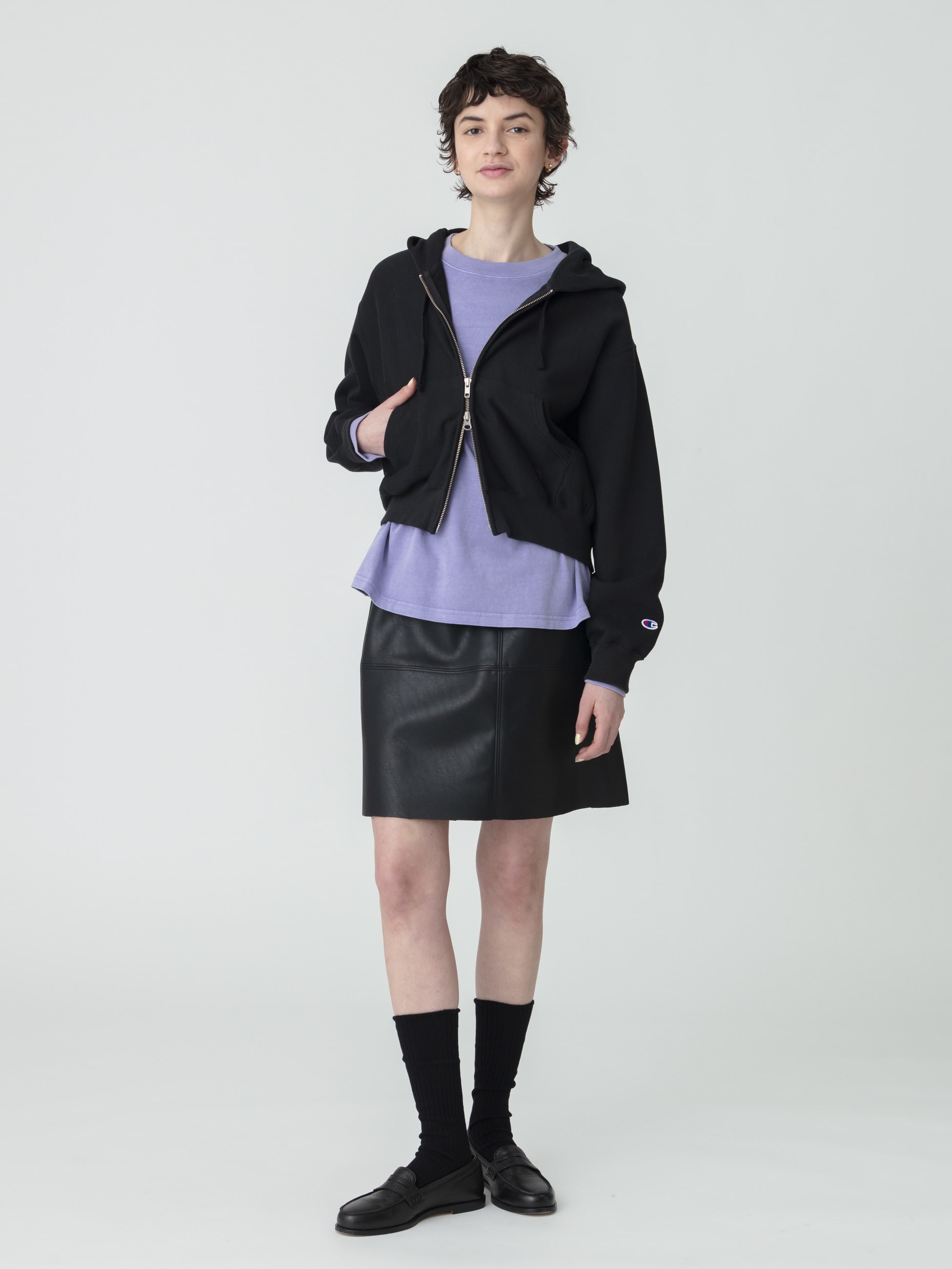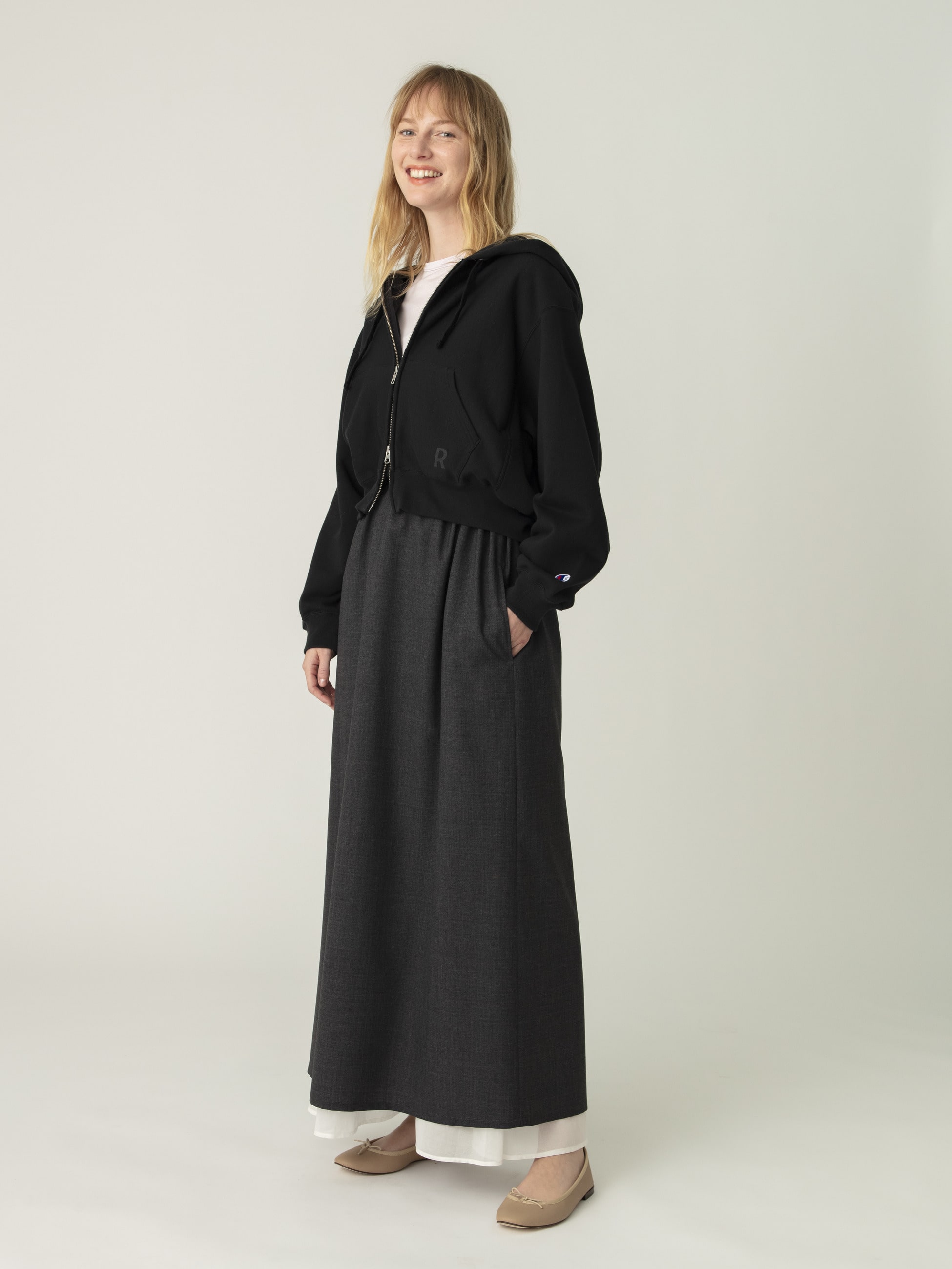 毎シーズン好評いただいているChampionとの別注アイテムより、26SSシーズンは柔らかな手触りで肌馴染みの良いフレンチテリー素材を使用した、裏毛素材のダブルジップフーディーが登場です。オーバーサイズのショート丈シルエットが、程よく力の抜けた印象で、ドレスやオーバーオールの上に羽織ってもバランスが取りやすいようにこだわった1着。フロントポケットには、ボディと馴染ませたカラーリングの「R」ロゴを施し、さりげないワンポイントに。裏毛仕様で通年着用いただけ、軽い羽織りとして幅広いスタイリングで活躍する、スペシャルなピースをぜひお楽しみください。