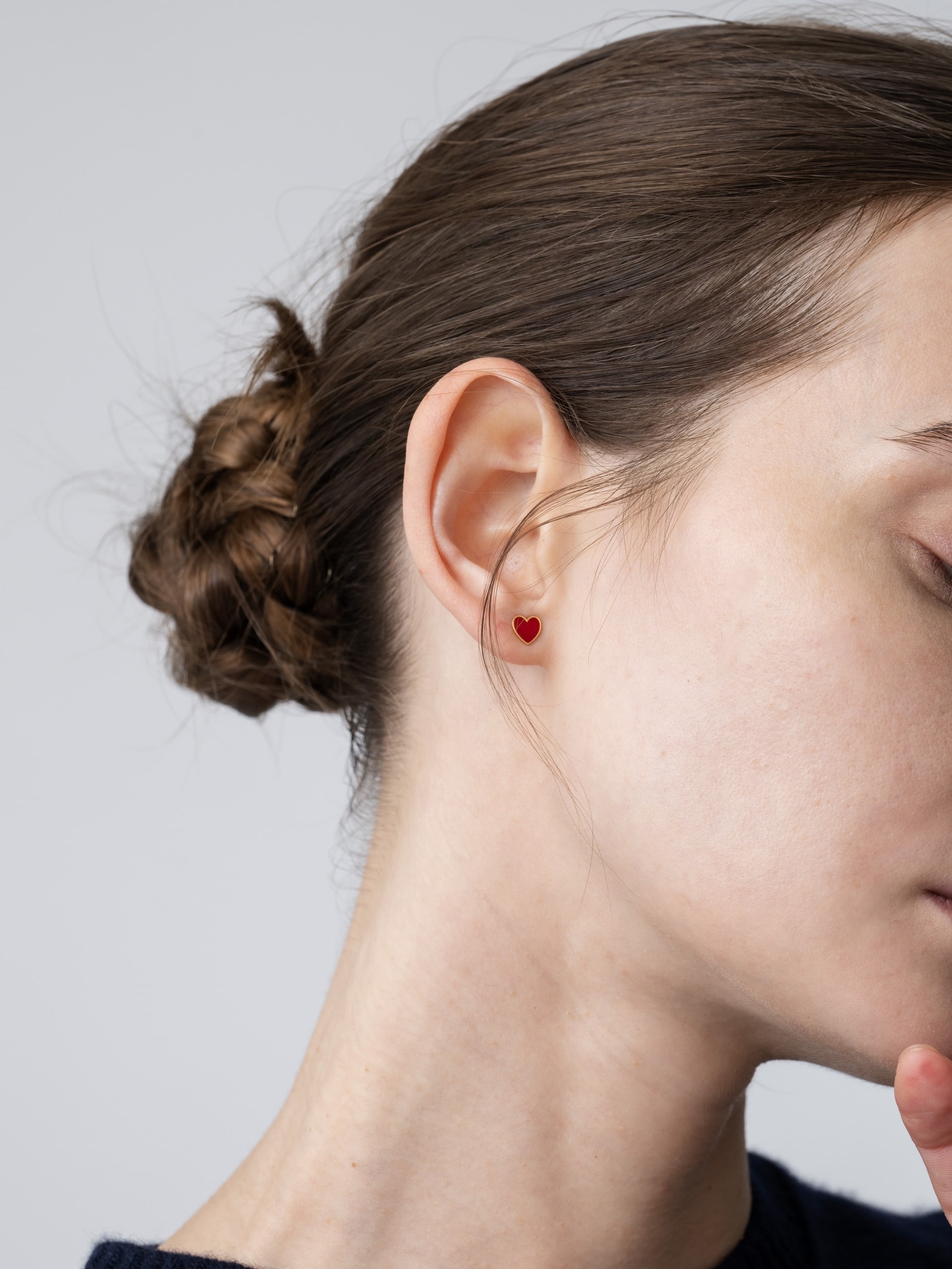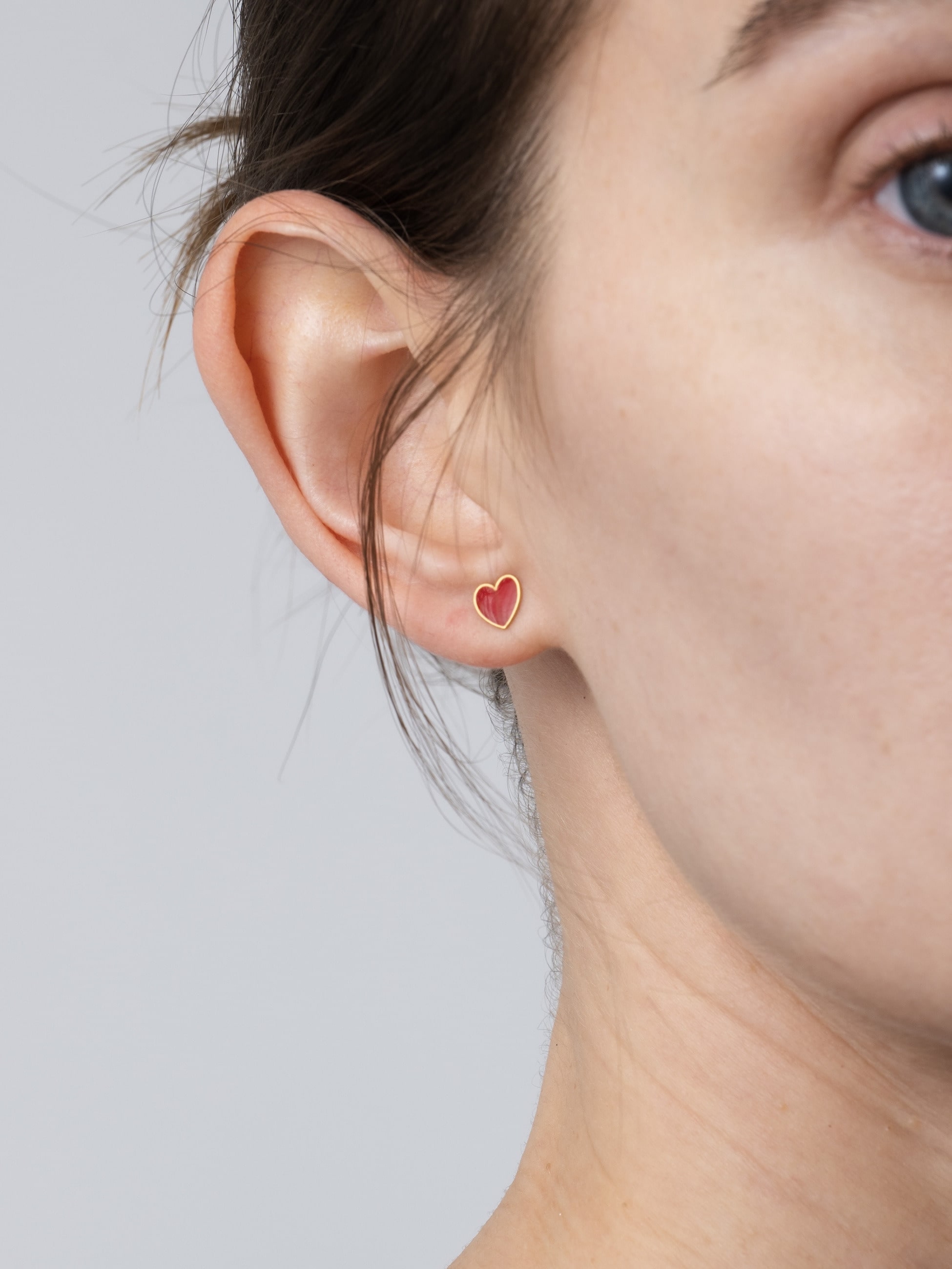 ハートモチーフのスタッズピアスは、エナメルの艶感としっとりとした22Kイエローゴールドの上質感が楽しめ、顔周りの印象を可愛らしく印象的に演出してくれます。ミニマルなサイズ感で、お手持ちのピアスやイヤリングとのレイヤードにもぴったり。ギフトにもおすすめです。