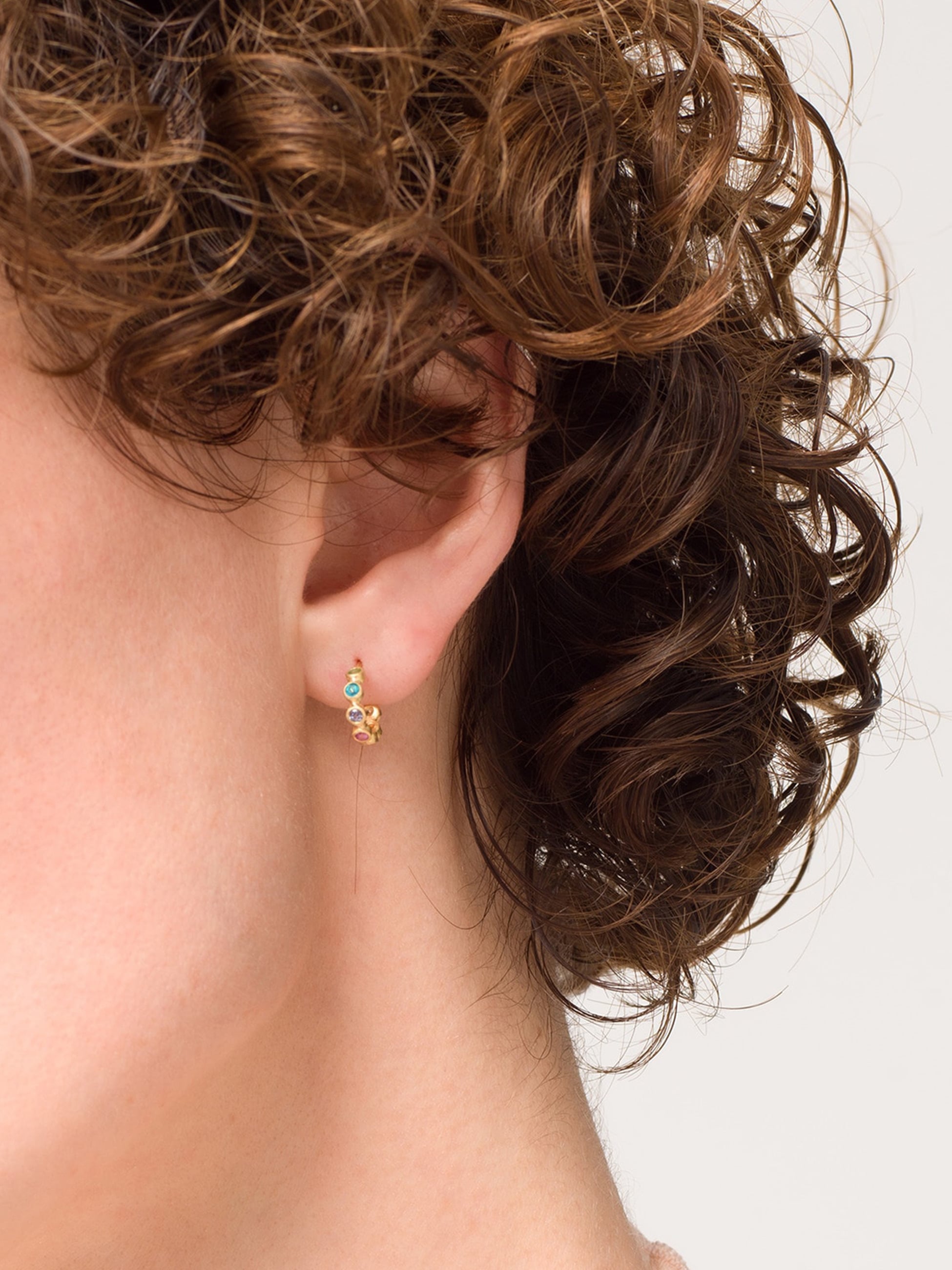 - 様々な天然石をあしらった、贅沢でカラフルな半円フープのピアスは、小ぶりで華美にならず、程よいアクセントになるアイテムです。可愛らしい雰囲気でありながらも、20Kのしっとりとした上質なゴールドの質感をお楽しみいただけます。