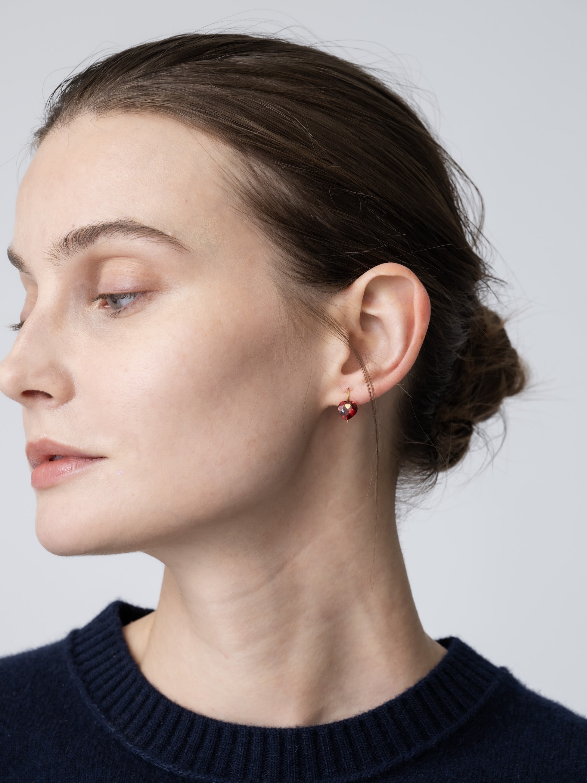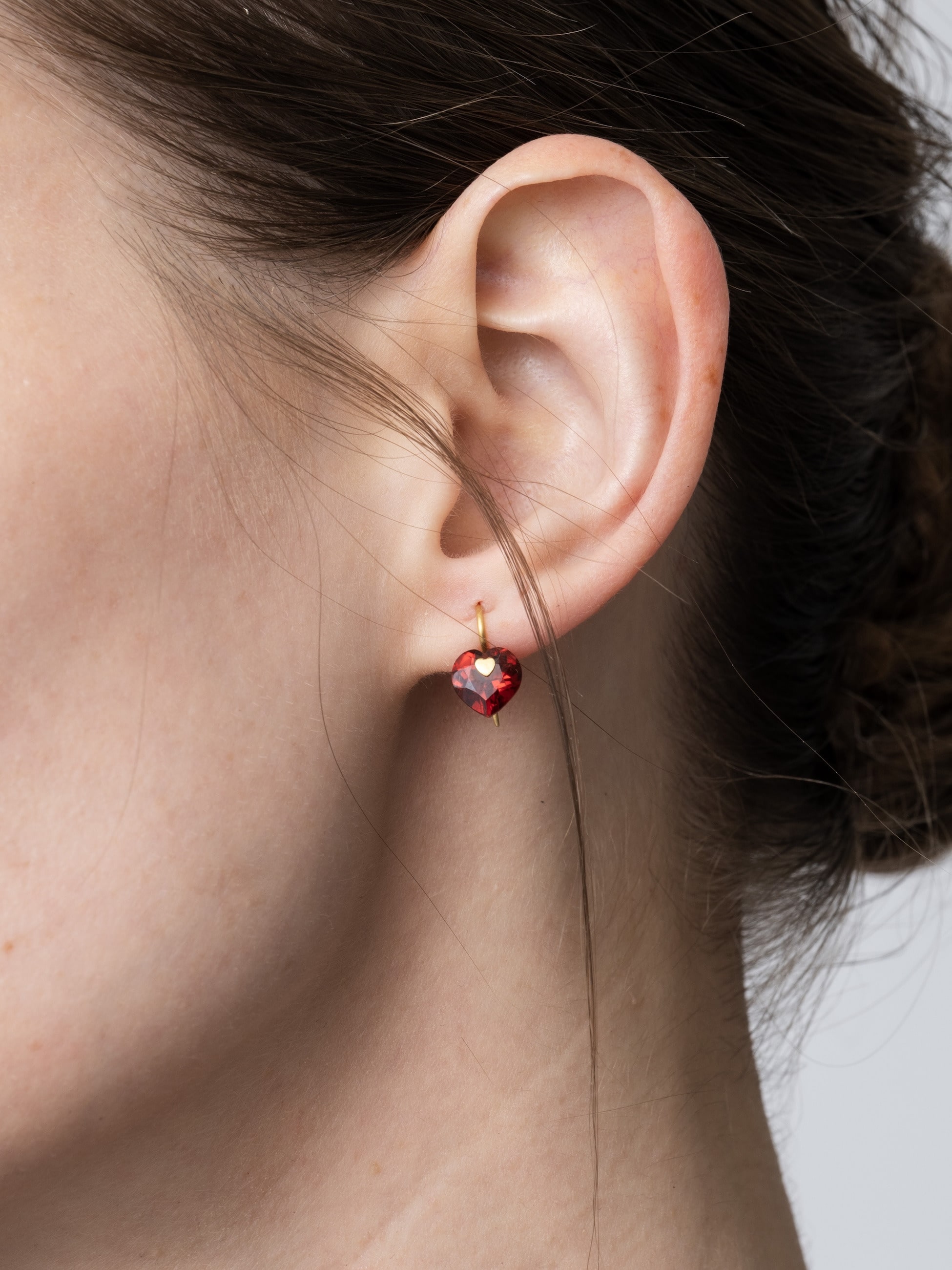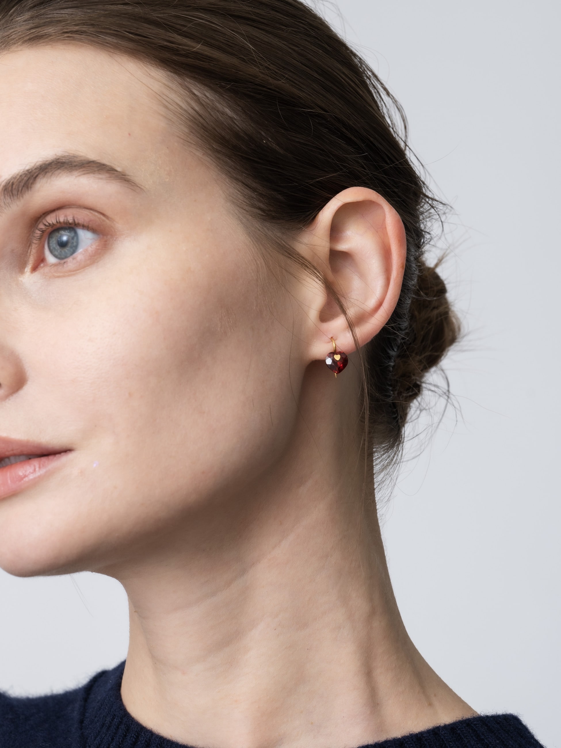 美しくカットされたなハートフォルムが愛らしいミニマルなフックピアスは、ガーネットの深く美しい色味が耳元で上品に輝きます。留め具部分がハートモチーフになっているのもさりげないポイントに。華美になりすぎず、ギフトにもおすすめです。