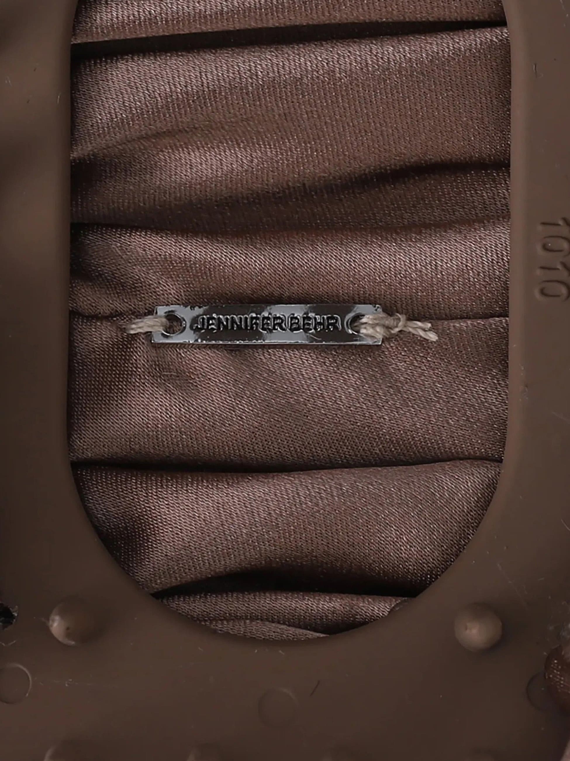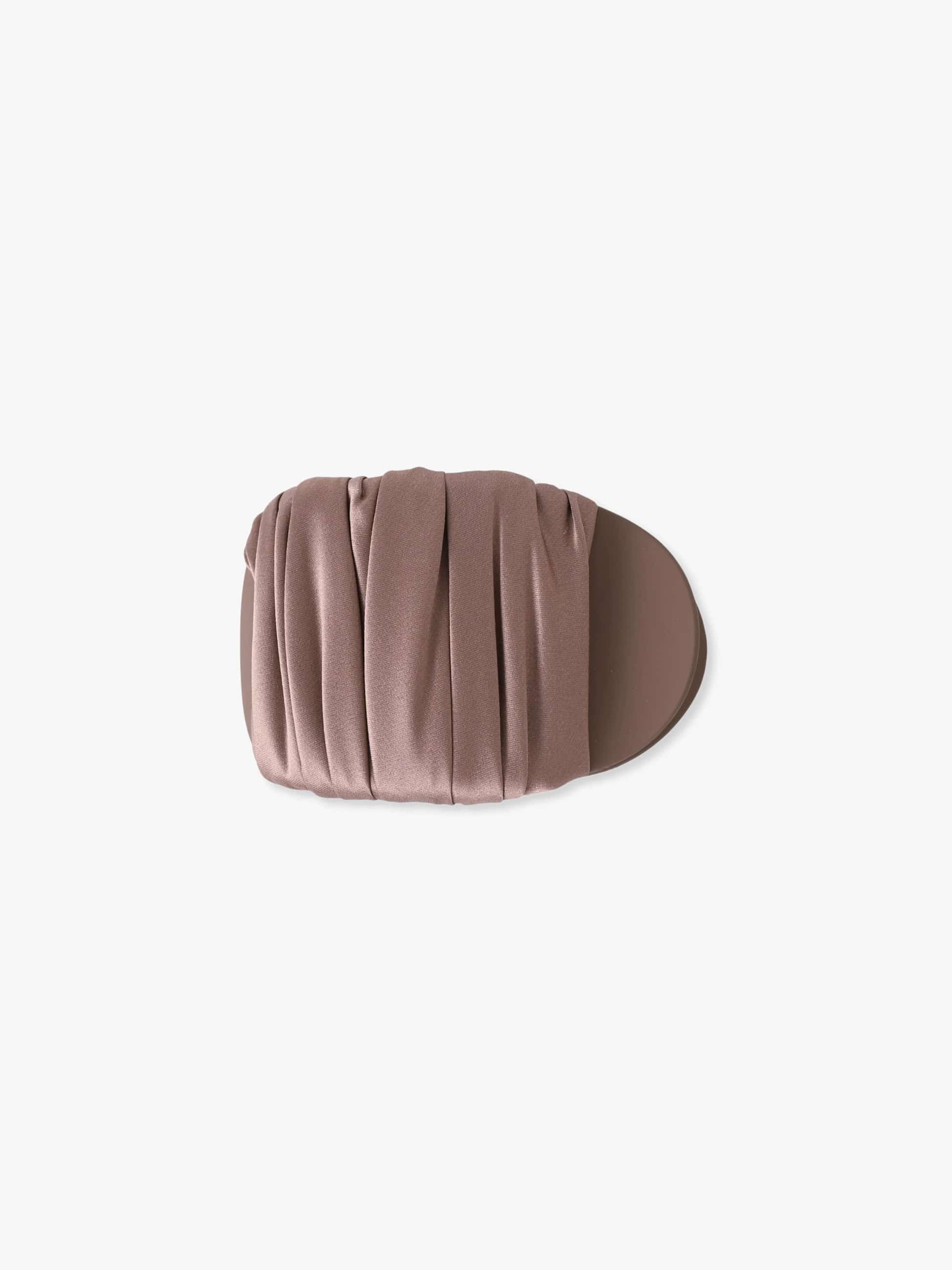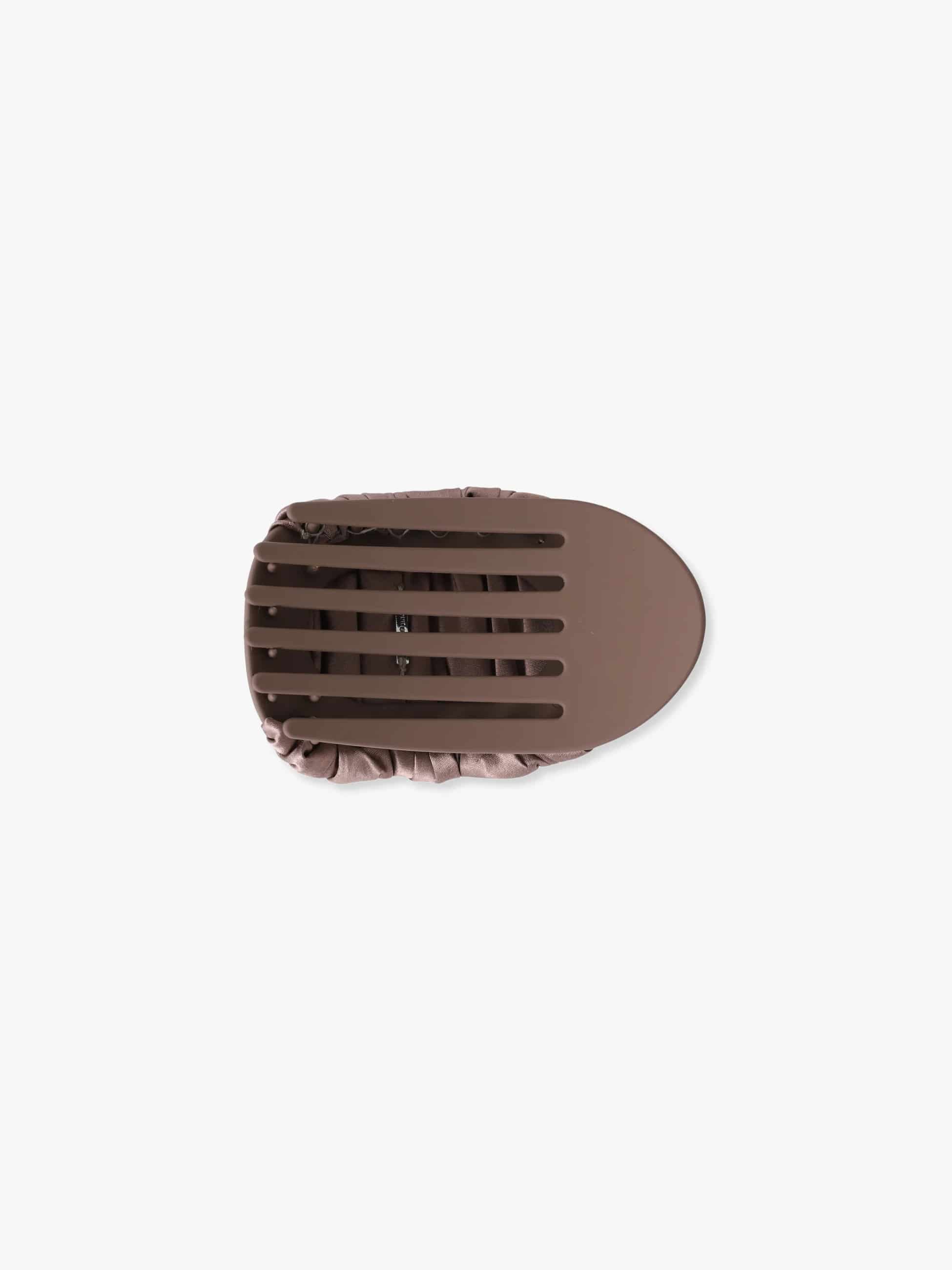 - シルクのシャルムーズ生地を使用したヘアクリップは、フラットなクロークリップに丁寧にドレープを施した立体美と上品な艶感が特徴です。ボリュームがありながらも、つけると頭にぴったりとフィットするためヘアアレンジがしやすく、デイリーからドレスアップまでカバーします。