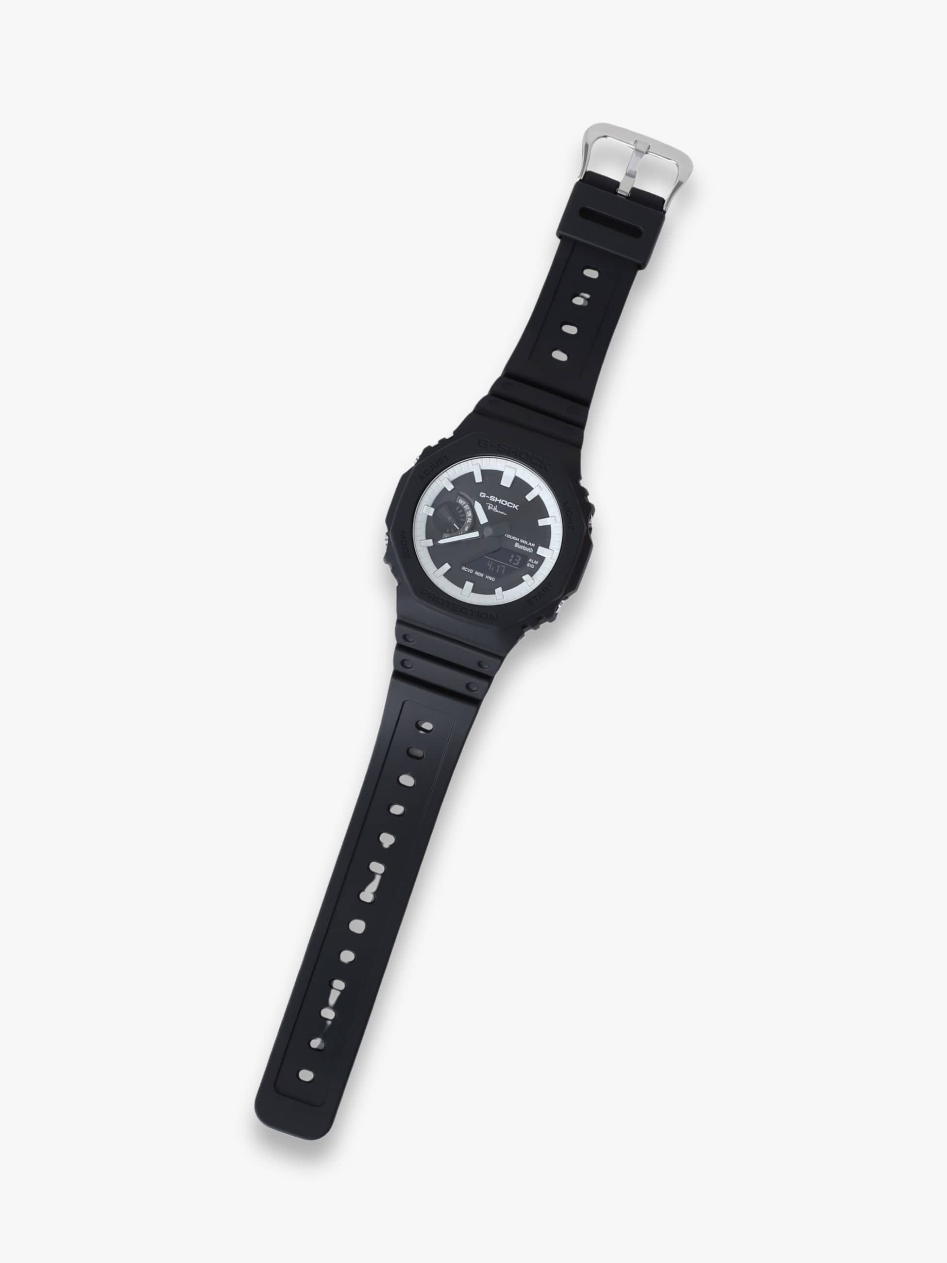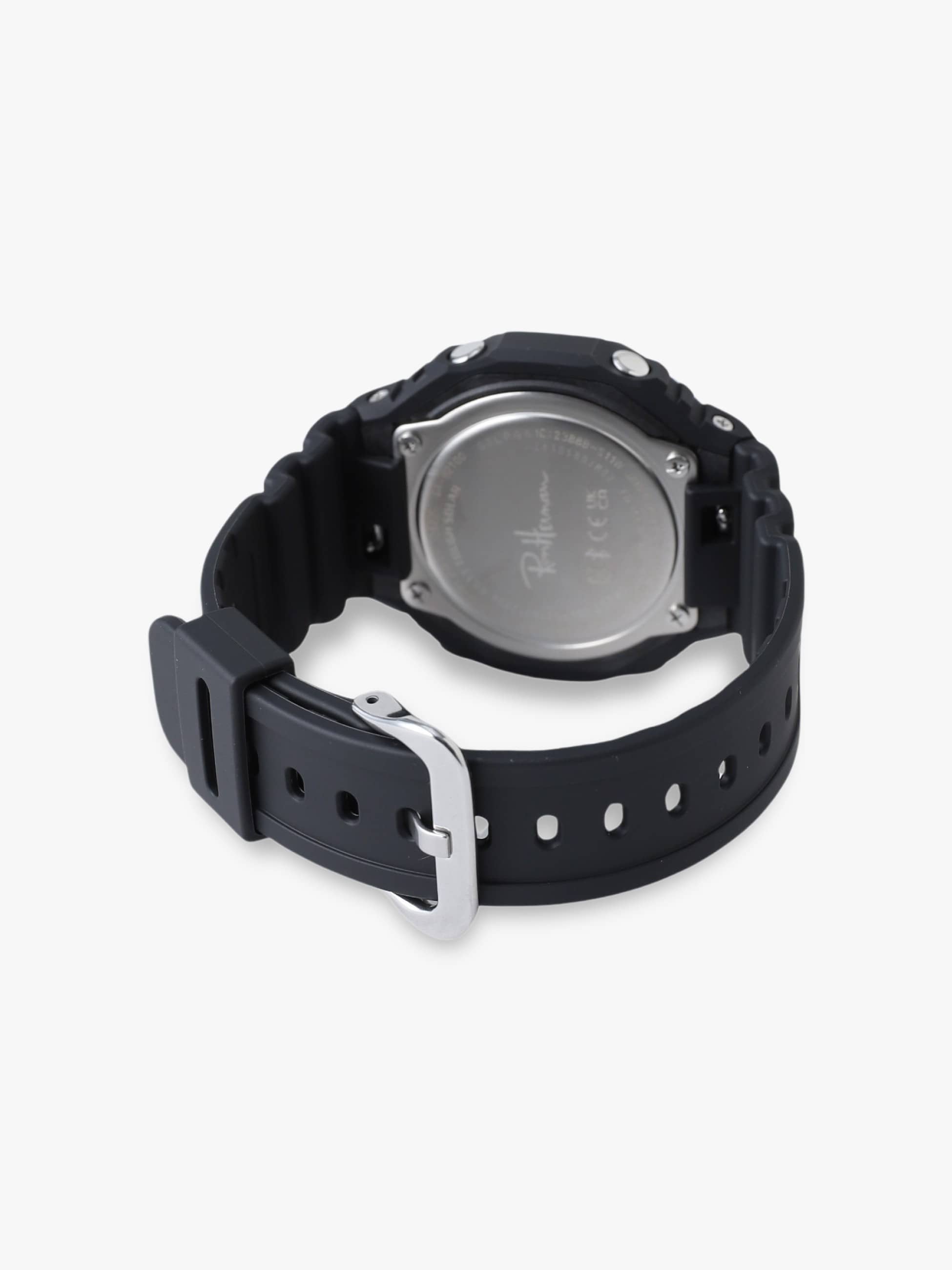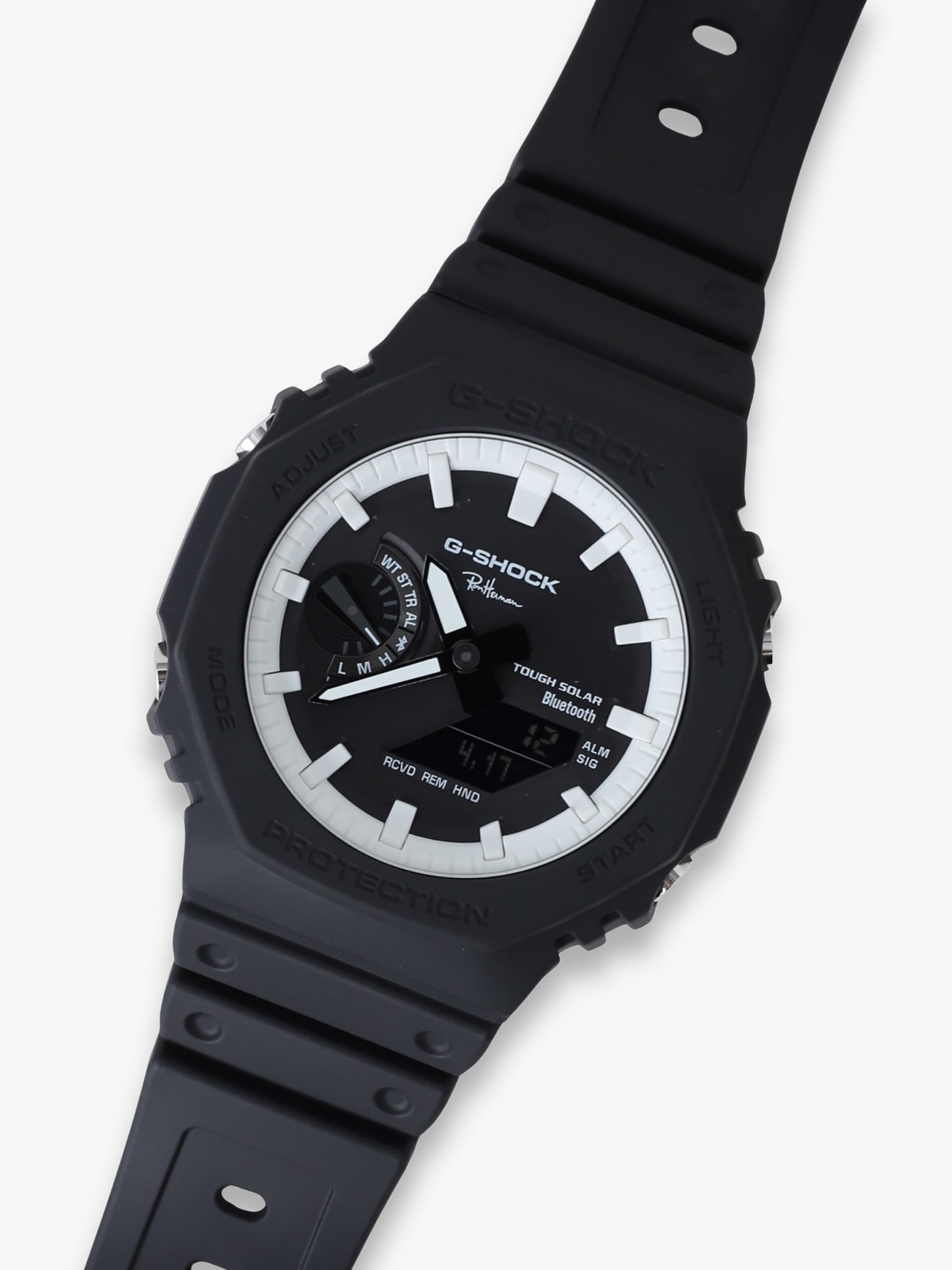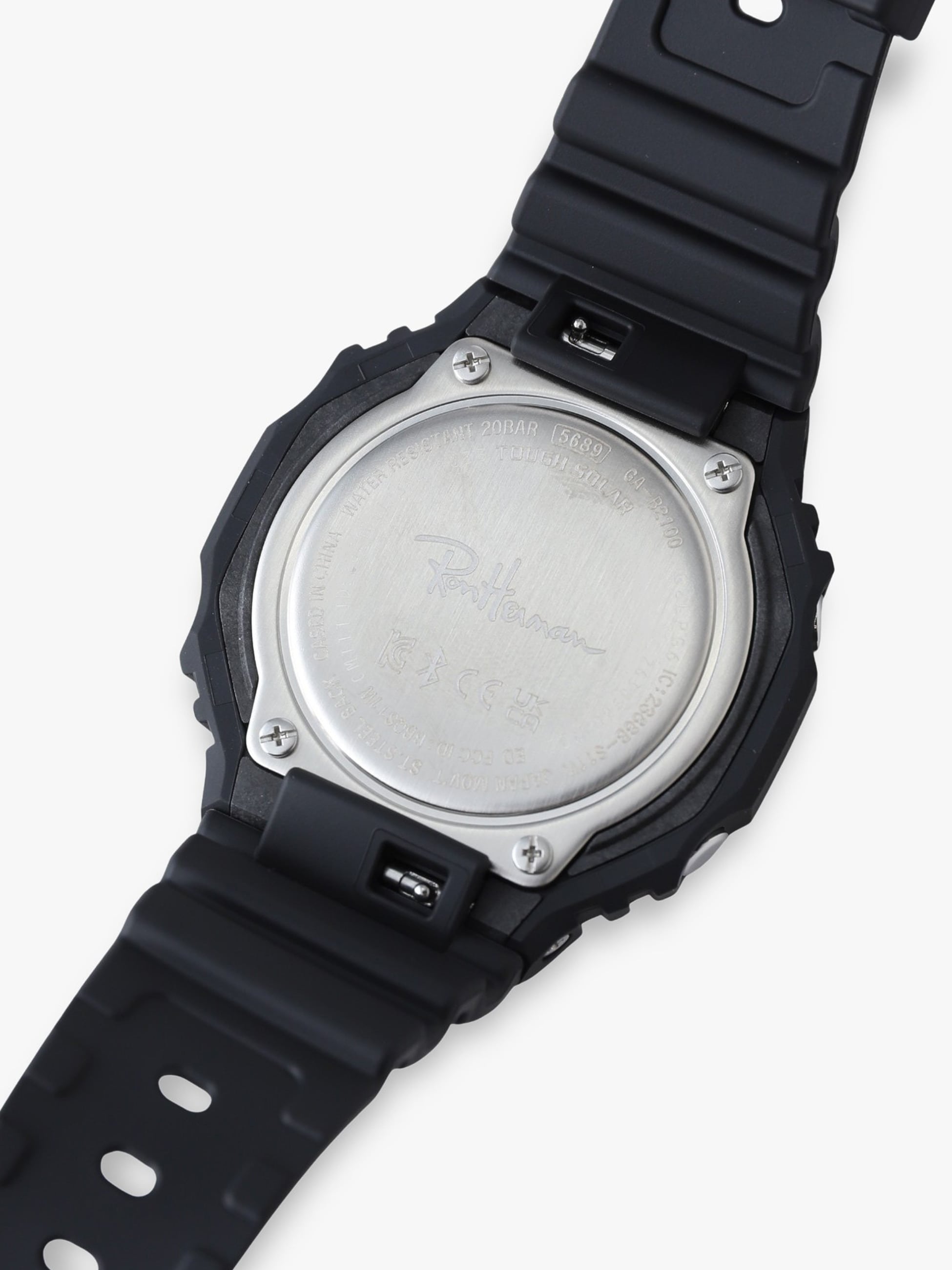 タフネスを追求し進化を続けるG-SHOCKから、アナログな文字盤と八角形フォルムのオクタゴンベゼルが特徴的な「GA-2100」をベースモデルにした別注アイテムが登場。今作では、ブラックのワントーンで仕上げたベゼルとバンドを採用し、文字盤はすべての表記をホワイトに統一することで高い視認性と都会的でスタイリッシュな印象を両立しています。また、タフな構造はそのままに、無駄を省いたアナログと反転液晶が組み合わさったシンプルなデザインや薄型化したケースは、全体のトーンを引き締めるとともに、モダンな表情を演出します。さらに、文字盤内の「G-SHOCK」ロゴの下に「Ron Herman」ロゴを配置し、裏蓋には刻印で「Ron Herman」ロゴを配した、別注の証となる特別なデザインへアップデートしています。ぜひこの機会に、G-SHOCKとロンハーマンのコラボレーションによって誕生した、大人の男性にふさわしい遊び心をプラスしたスペシャルな1本をお楽しみください。