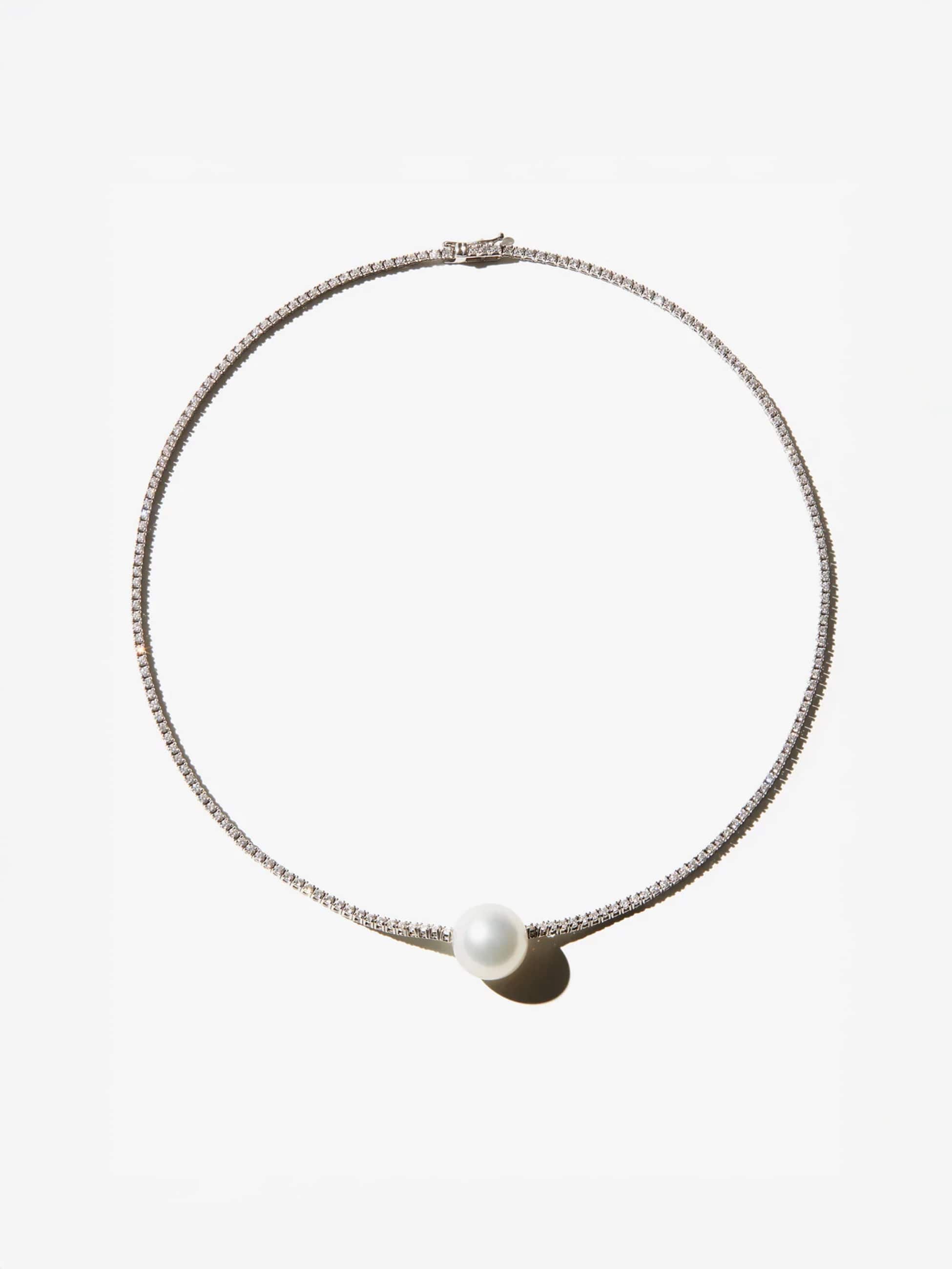 パールとダイヤモンドが融合した、特別な気品を醸すネックレスは、すっきりとしたダイヤモンドのラインに12mmのサウスシーパールが美しく映え、存在感を醸します。