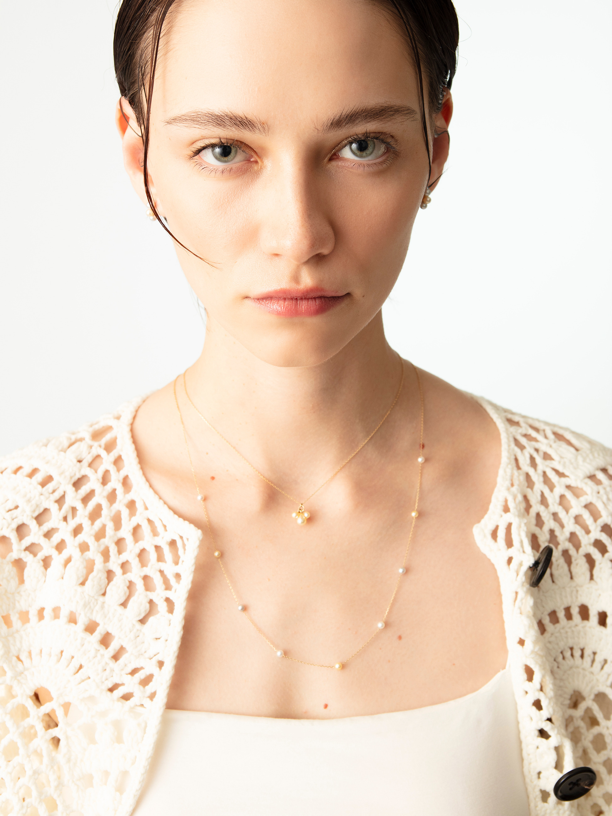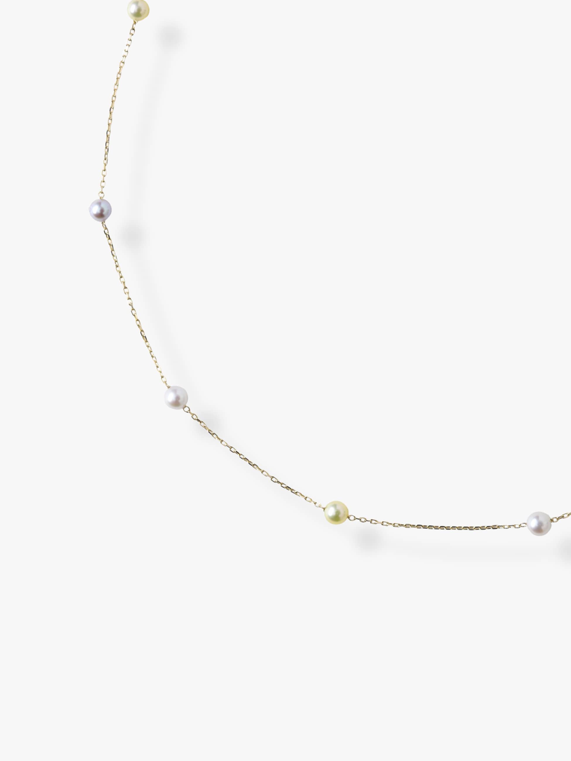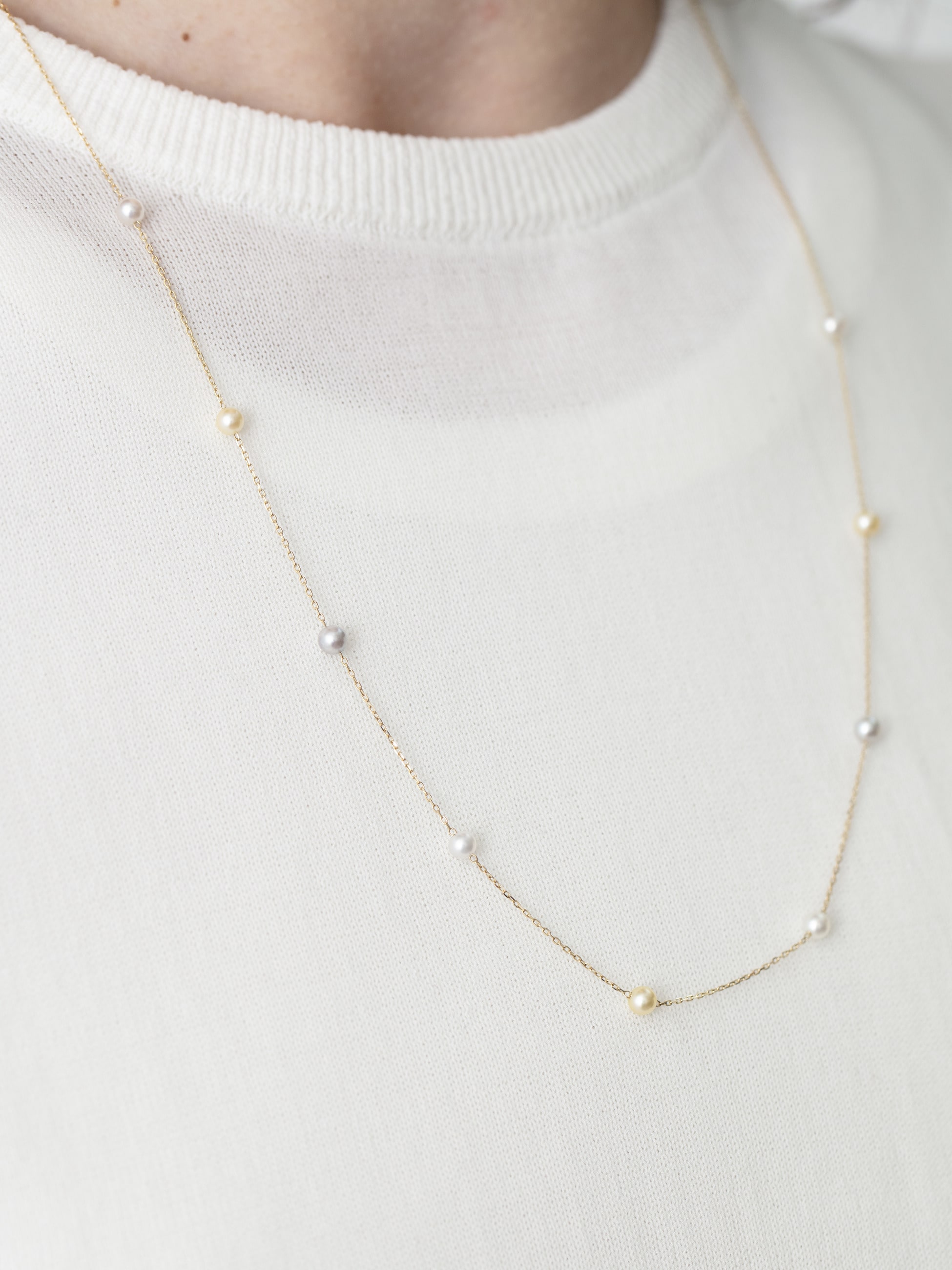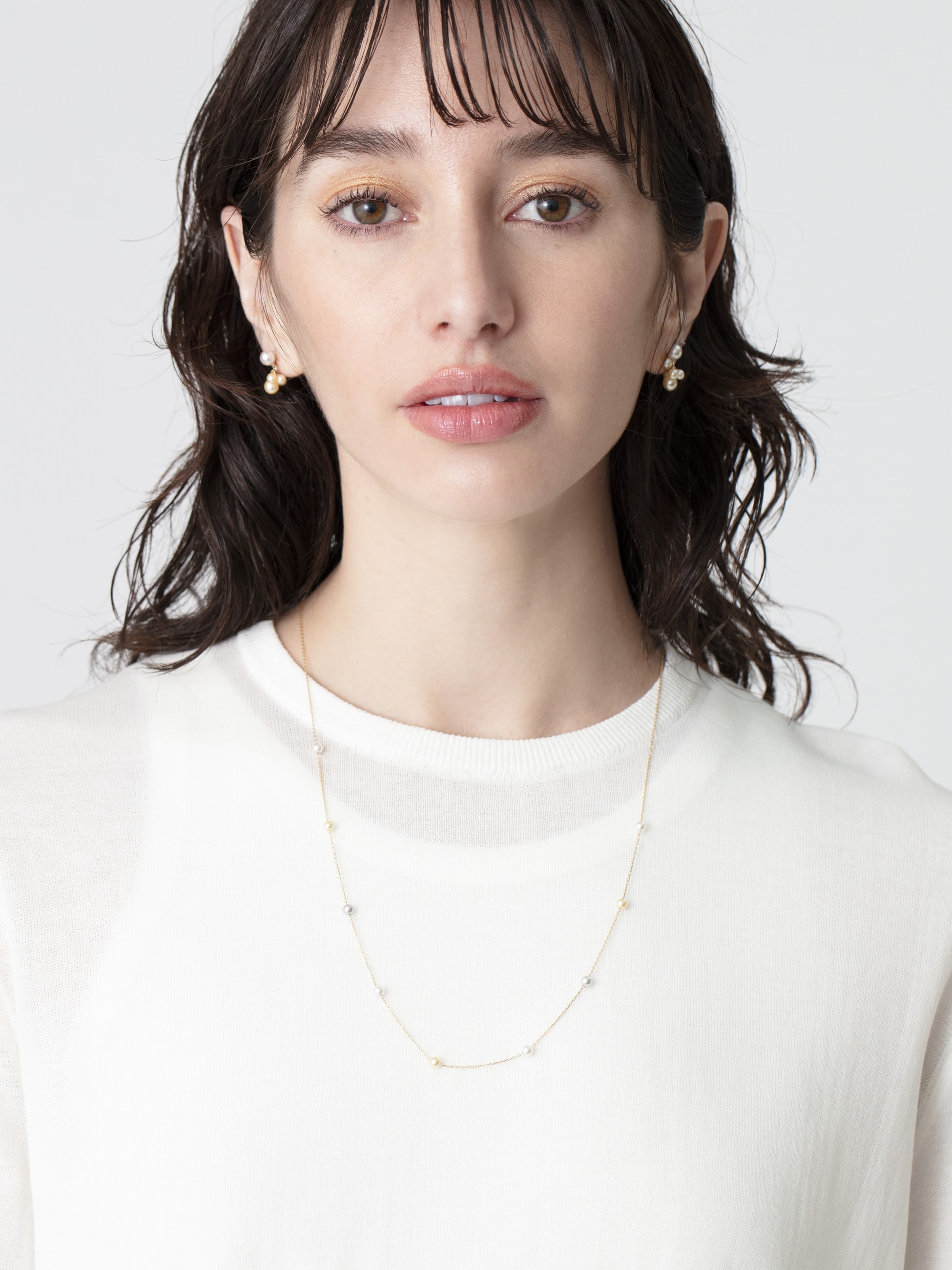 MIZUKIが贈る新作"CANDY COLLECTION"から、大人気のフローティングパールネックレスを別注しました。やや長めの14Kイエローゴールドのチェーンに、みずみずしいペールゴールド、グレー、ホワイトパールの3種類をあしらったミックススタイルで、MIZUKIらしい品の良さと優美さを兼ね備えています。ベーシックとはまた違った雰囲気で首元を彩り、日常にそっと寄り添いながら一瞬で心にときめきをもたらすジュエリーをぜひお楽しみください。