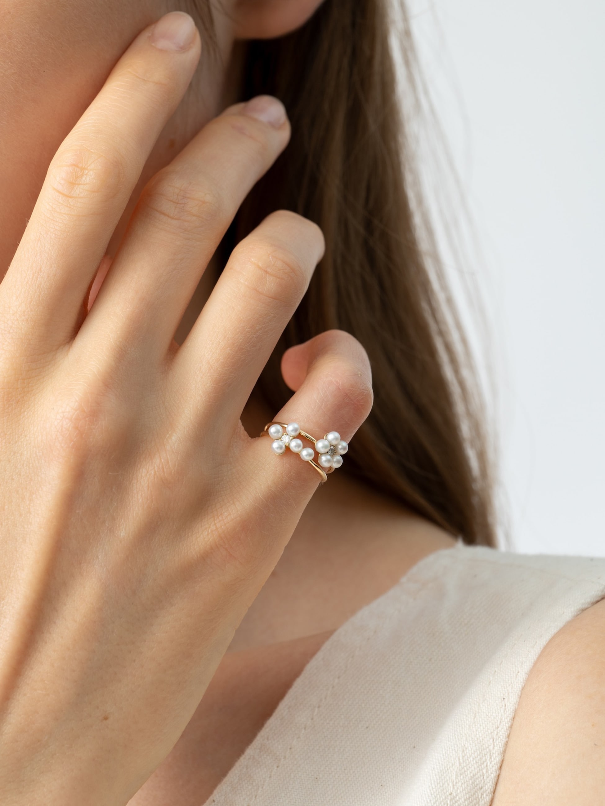 - パールとダイヤモンドで表現された小花モチーフのピンキーリングは、ミニマルなサイズ感でありながらも上質さを備え、繊細な艶と輝きをお楽しみいただけます。さりげなく可憐さを演出し、お手持ちのリングとレイヤードをお楽しみいただくのもおすすめです。