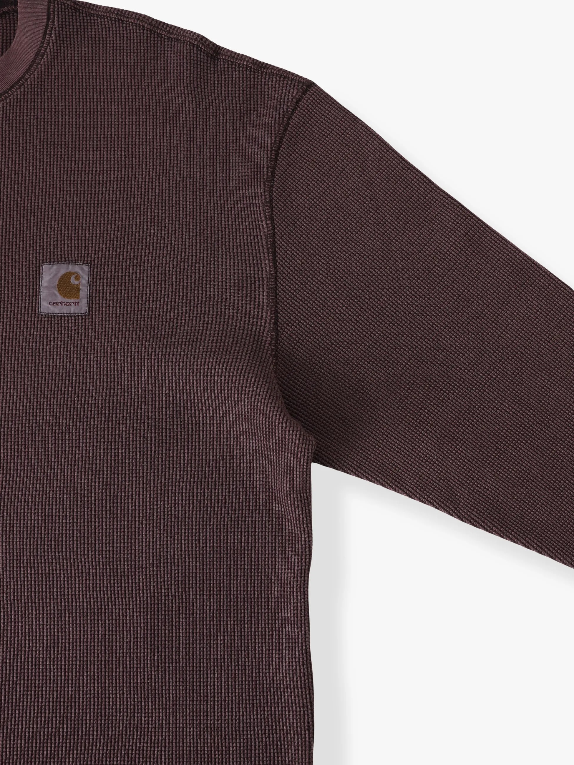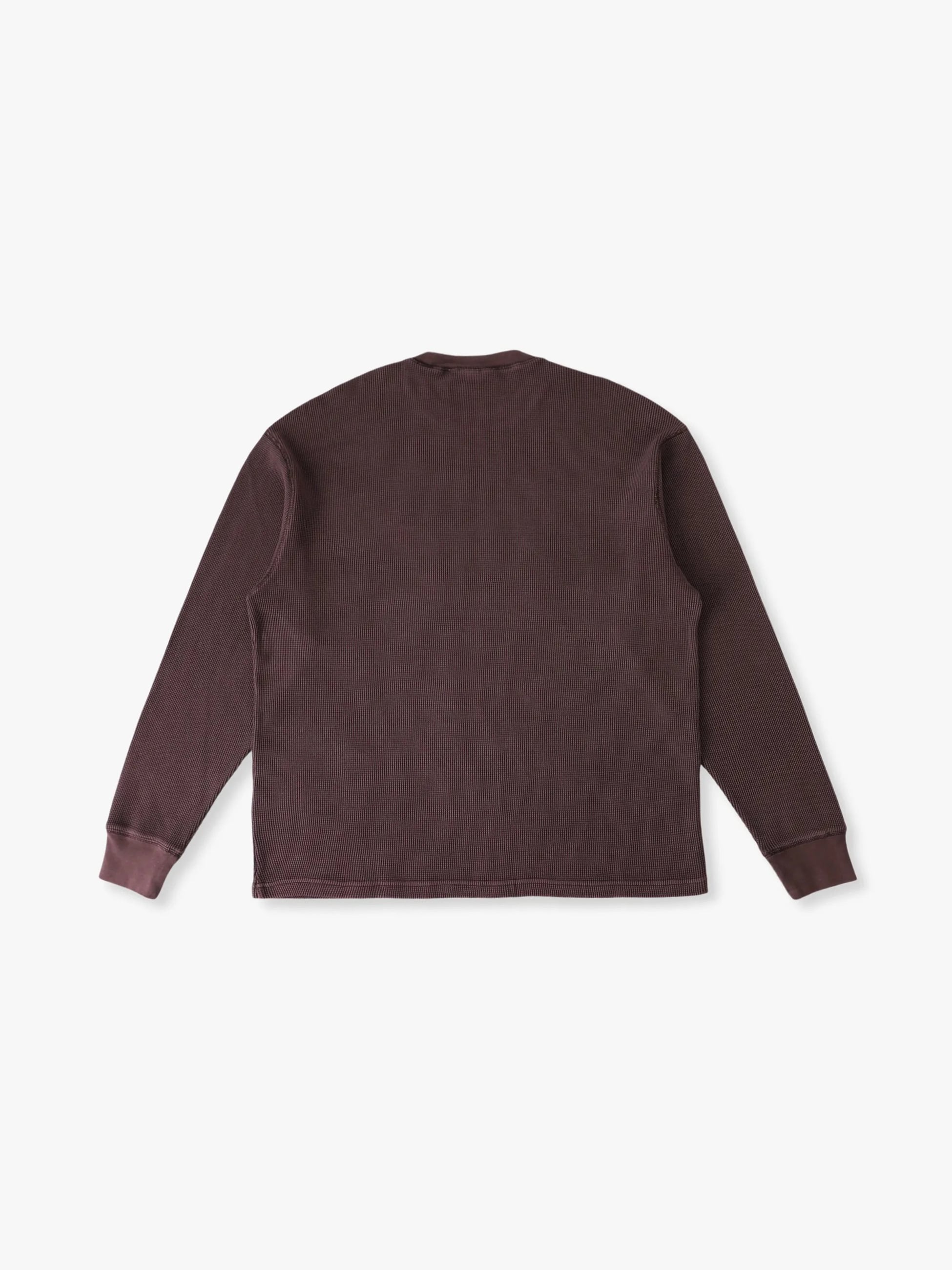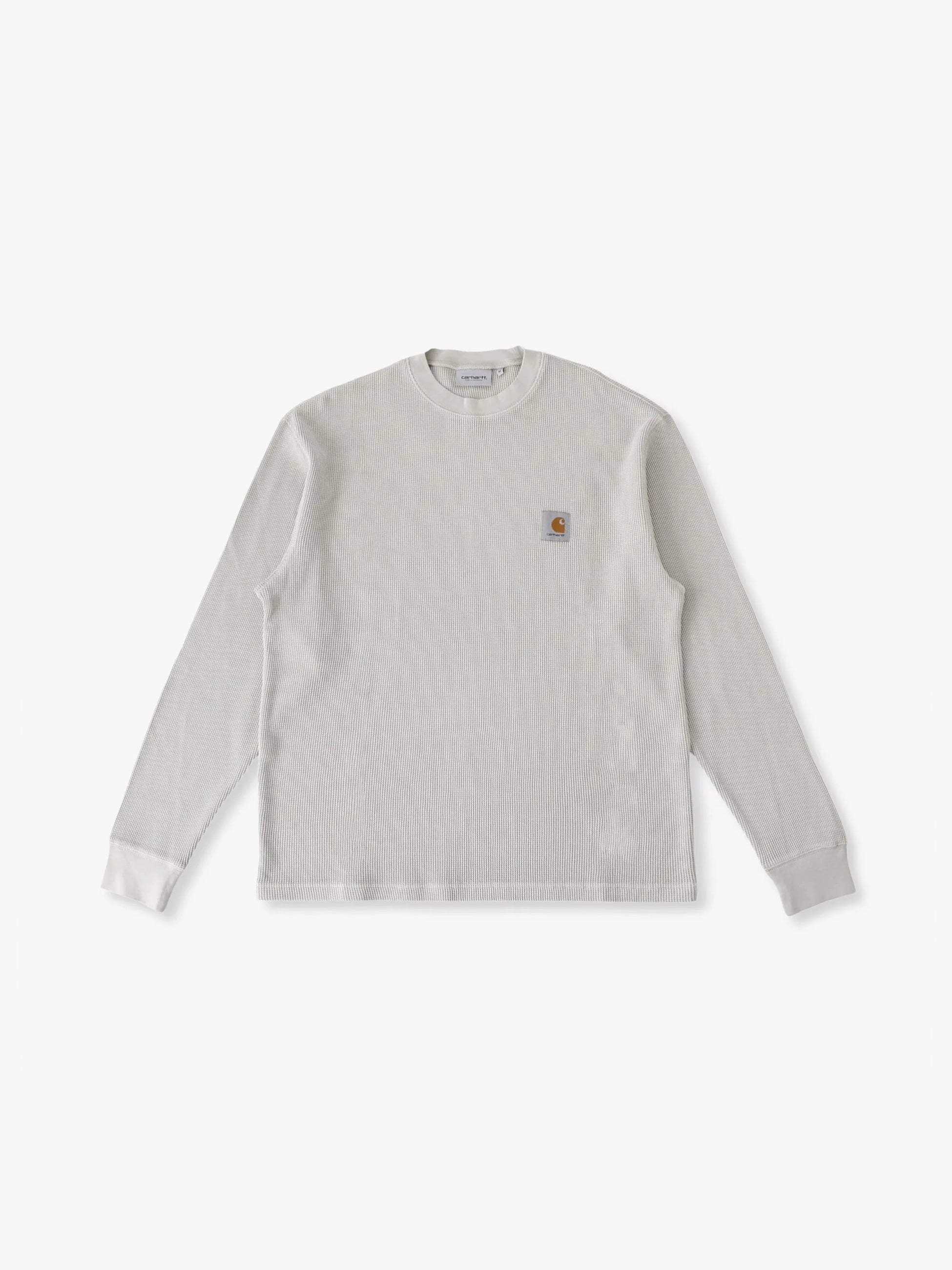 - 重厚なコットンワッフル生地を使用したロングスリーブTシャツ。ガーメントダイ加工を施した、柔らかな肌触りとヴィンテージのようなフェードしたカラーリングが特徴です。また、左胸に配されたスクエアラベルがアクセントになっています。ゆったりとしたフィットは、デイリーユースしやすい一着です。
