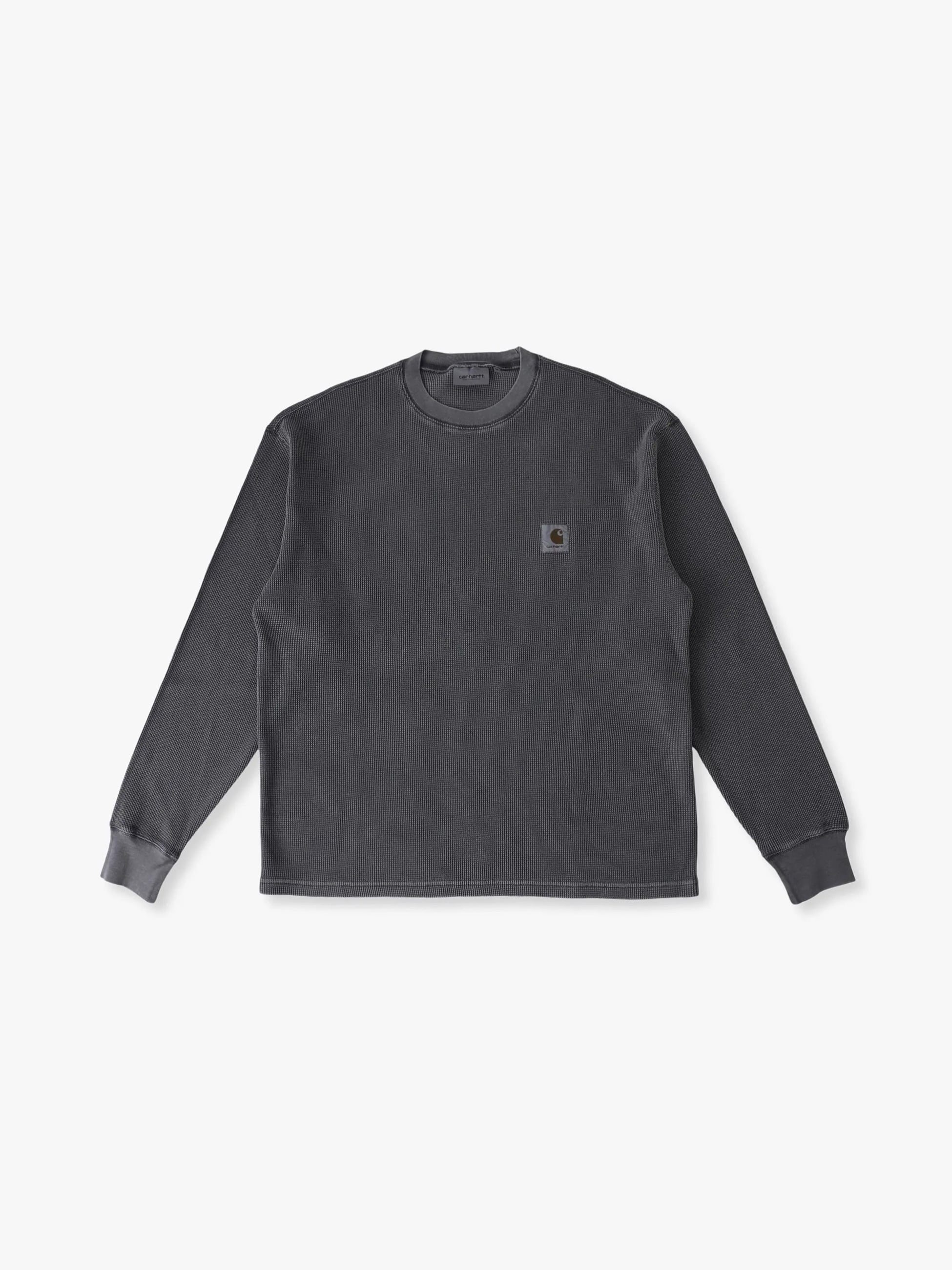 - 重厚なコットンワッフル生地を使用したロングスリーブTシャツ。ガーメントダイ加工を施した、柔らかな肌触りとヴィンテージのようなフェードしたカラーリングが特徴です。また、左胸に配されたスクエアラベルがアクセントになっています。ゆったりとしたフィットは、デイリーユースしやすい一着です。