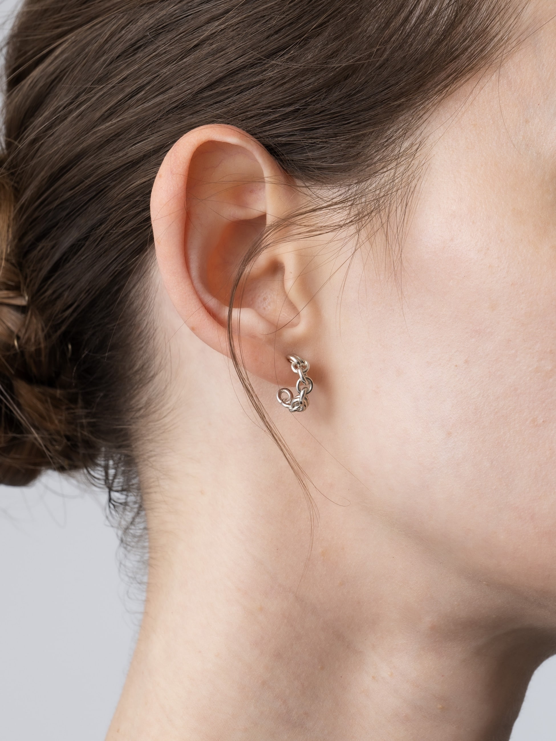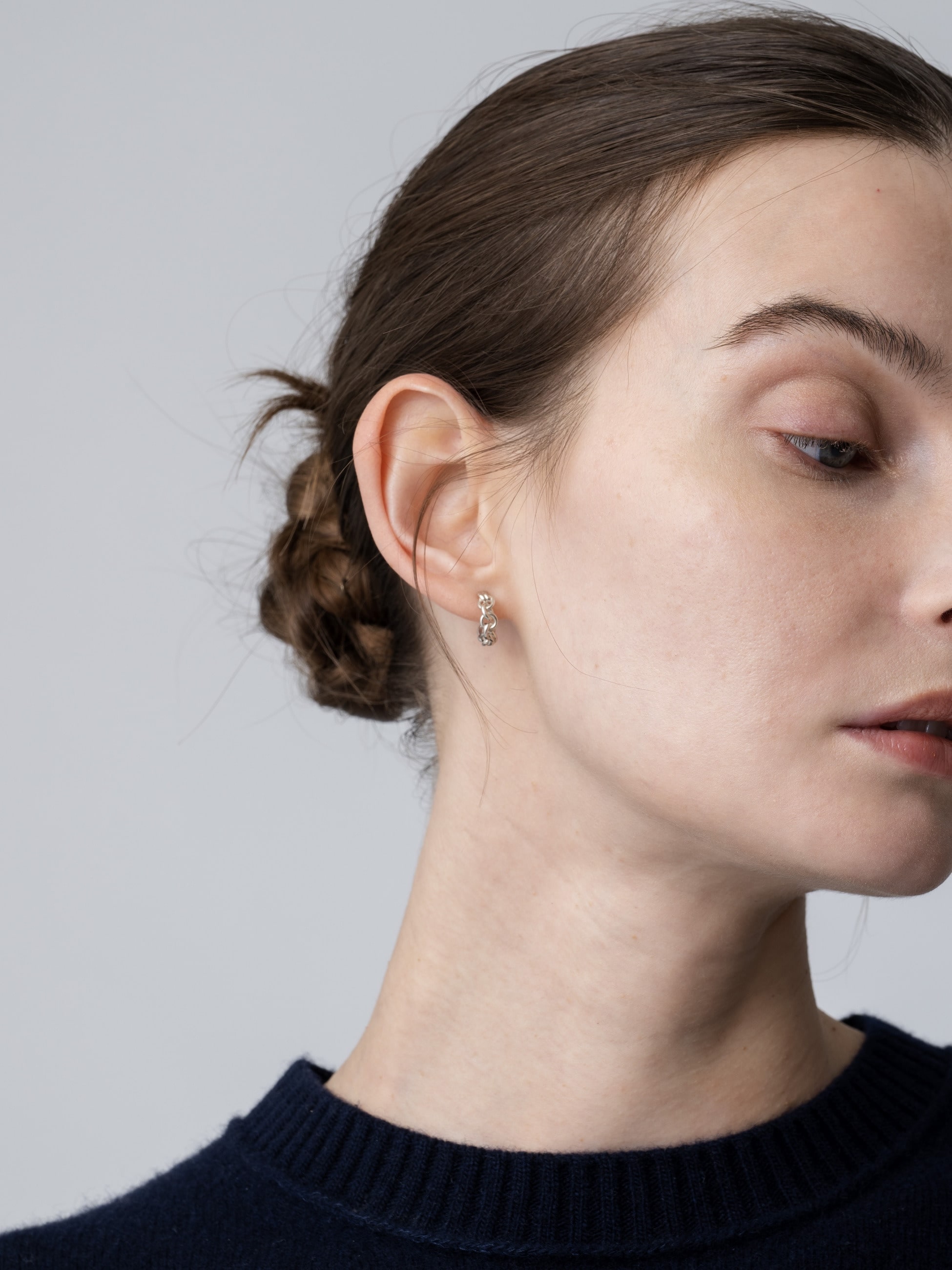- 小ぶりな半円デザインのピアスは、シングルリンクとダブルリンクがシームレスに融合し、歪みやねじれが奥行き感を生み出しています。さりげなく洗練された雰囲気を醸すアイテムです。