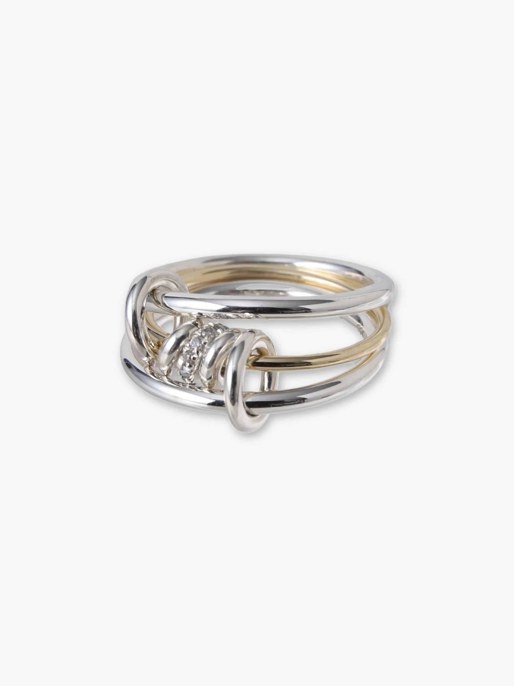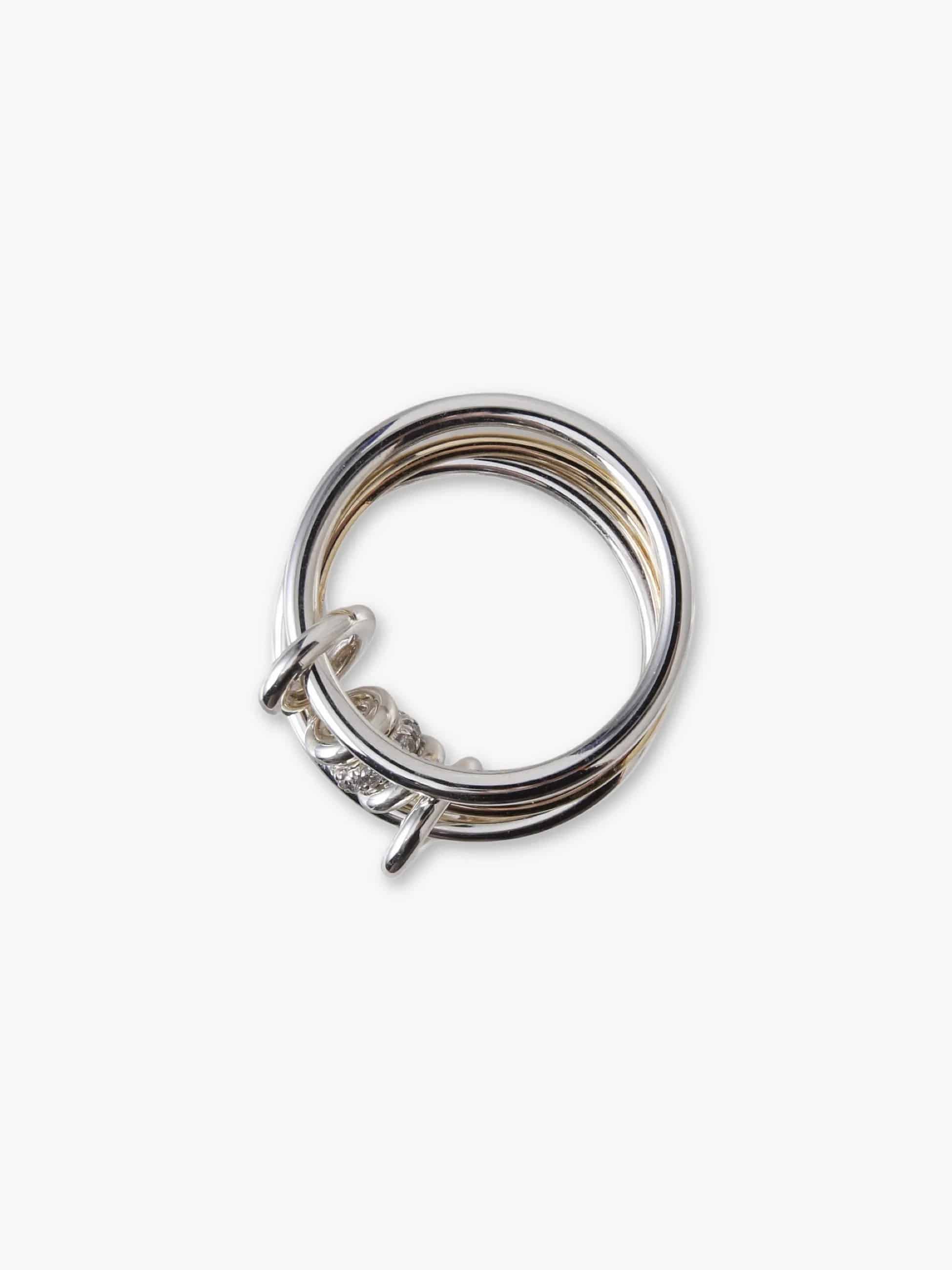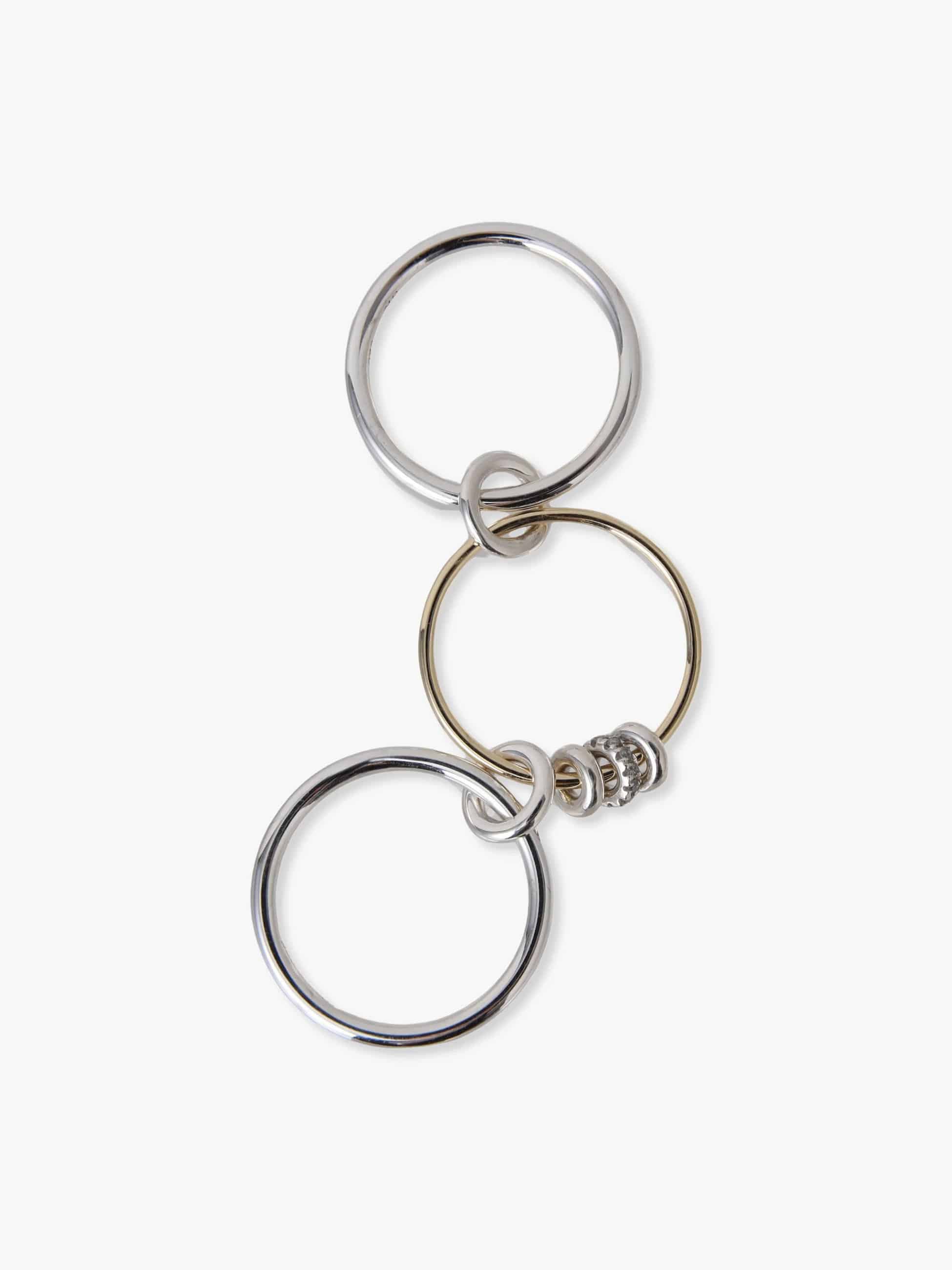 1.7mmのシルバーバンド2つと1.2mmのイエローゴールドバンド1つで華奢に仕上げた別注の3連リング。コネクターやアニュレットはすべてシルバーで、1つだけグレーダイヤモンドを入れました。華奢だけれど、イエローゴールドとグレーダイヤモンドの輝きが相まって、上品で存在感を醸すスペシャルなリングに仕上がりました。すでに他のSpinelli Kilcollinのリングをお持ちでしたら、重ねづけもおすすめです。