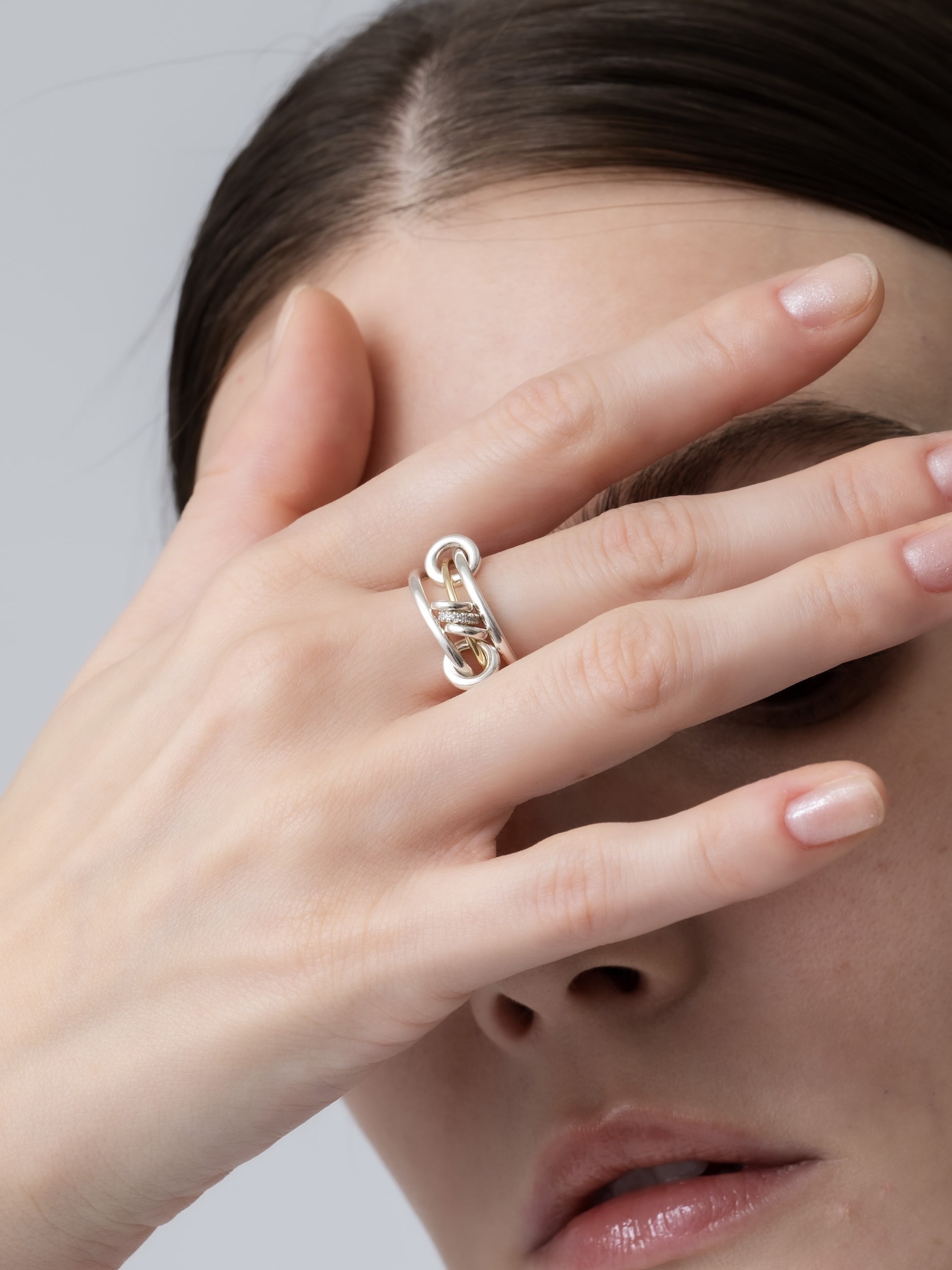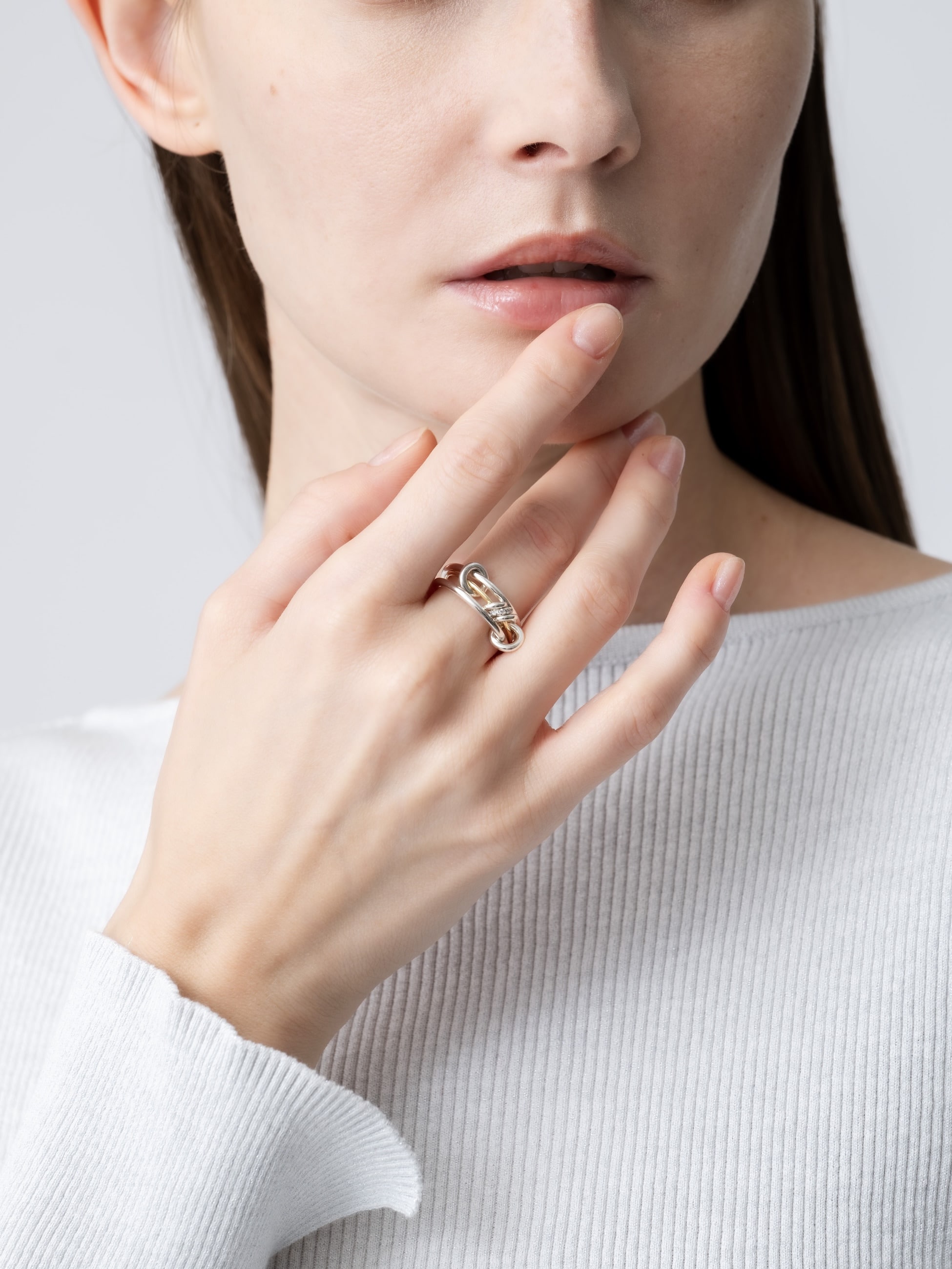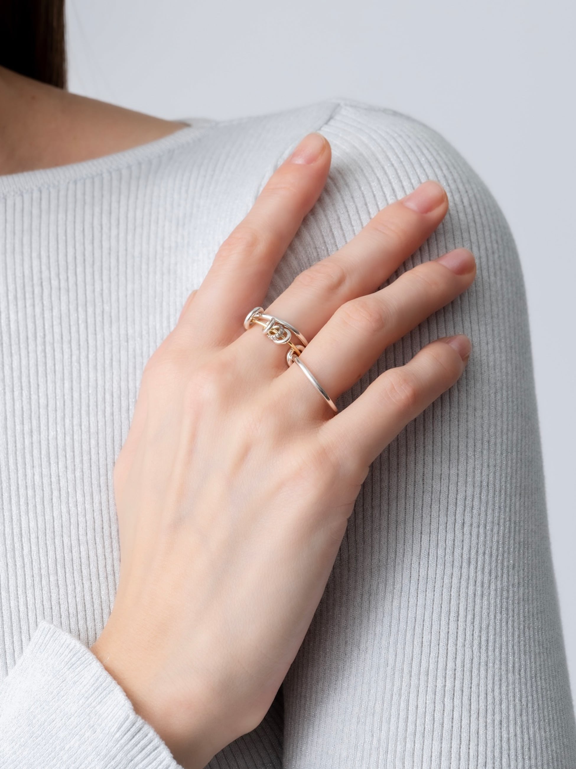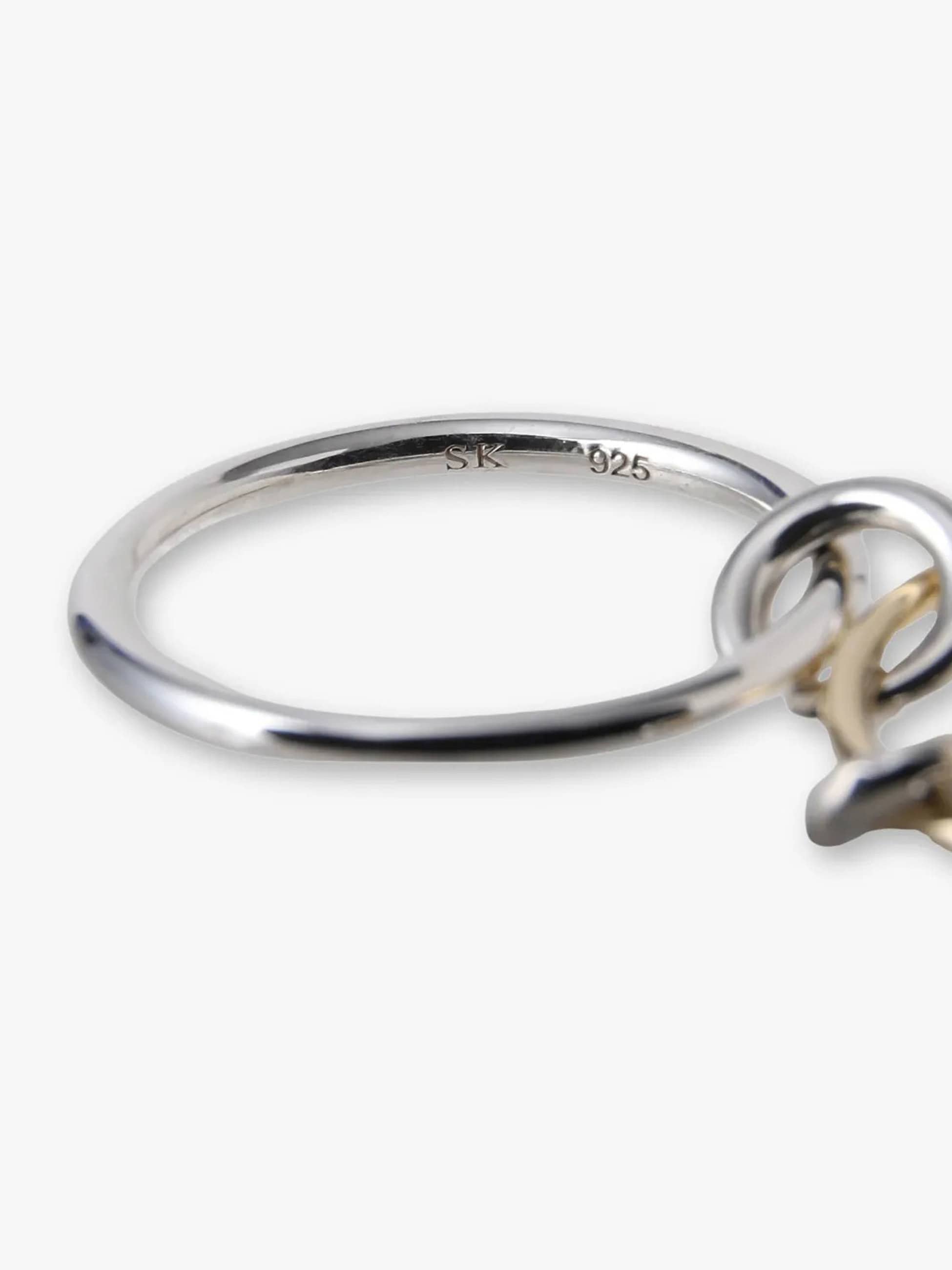 1.7mmのシルバーバンド2つと1.2mmのイエローゴールドバンド1つで華奢に仕上げた別注の3連リング。コネクターやアニュレットはすべてシルバーで、1つだけグレーダイヤモンドを入れました。華奢だけれど、イエローゴールドとグレーダイヤモンドの輝きが相まって、上品で存在感を醸すスペシャルなリングに仕上がりました。すでに他のSpinelli Kilcollinのリングをお持ちでしたら、重ねづけもおすすめです。