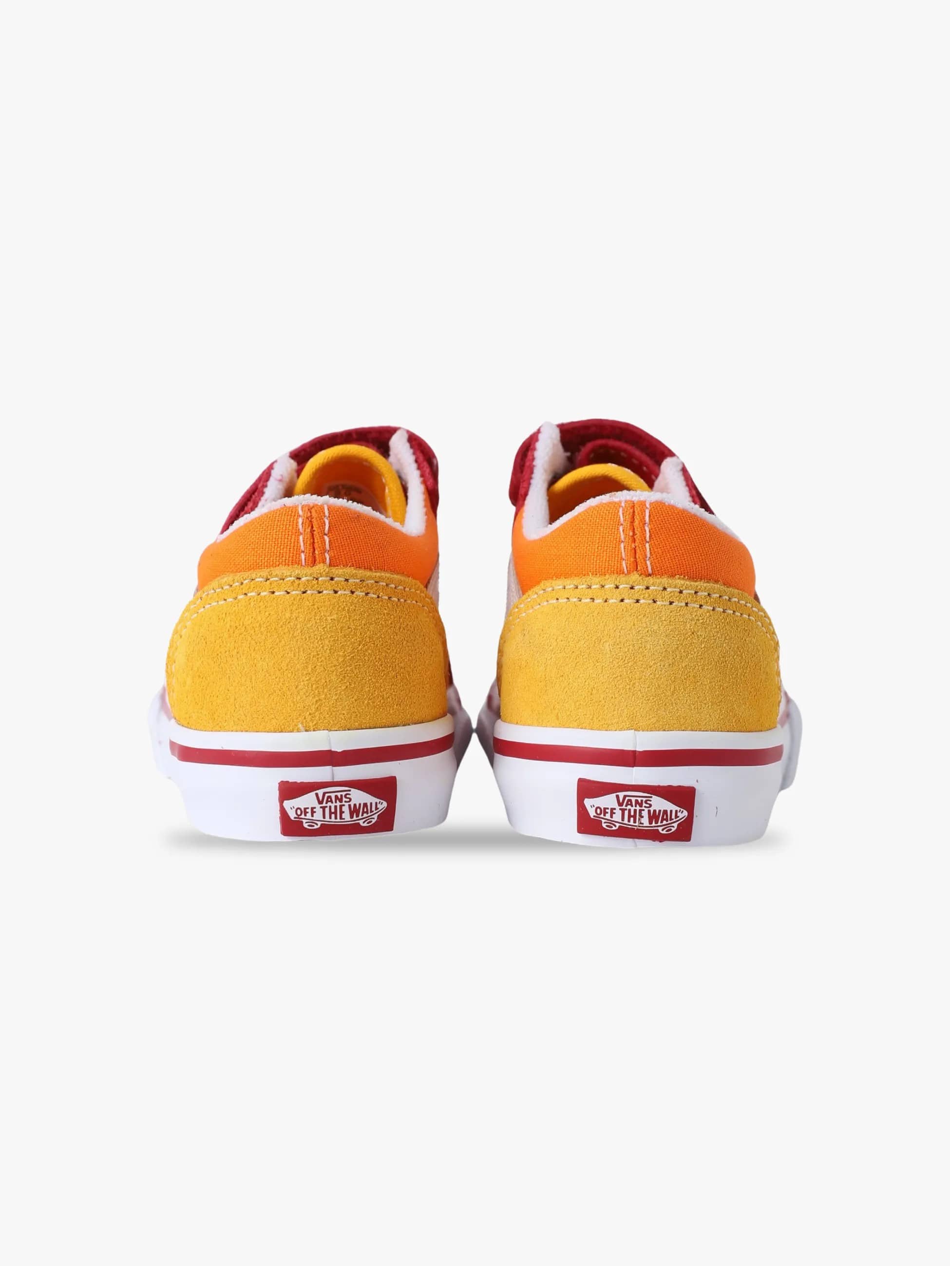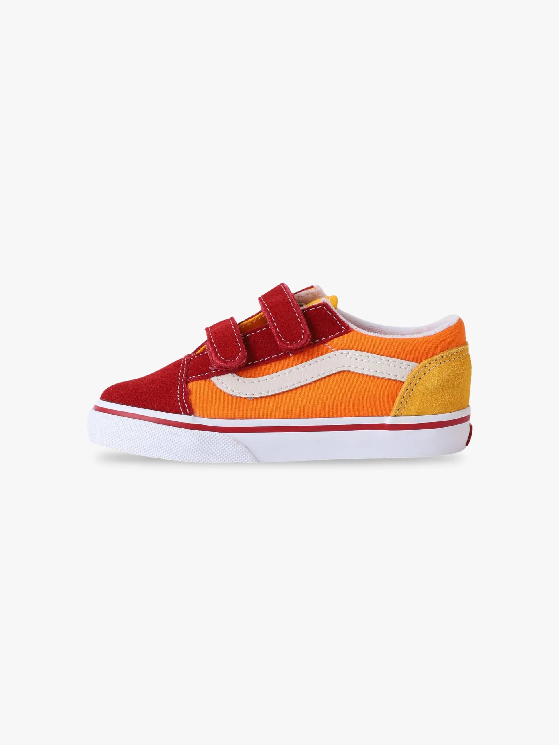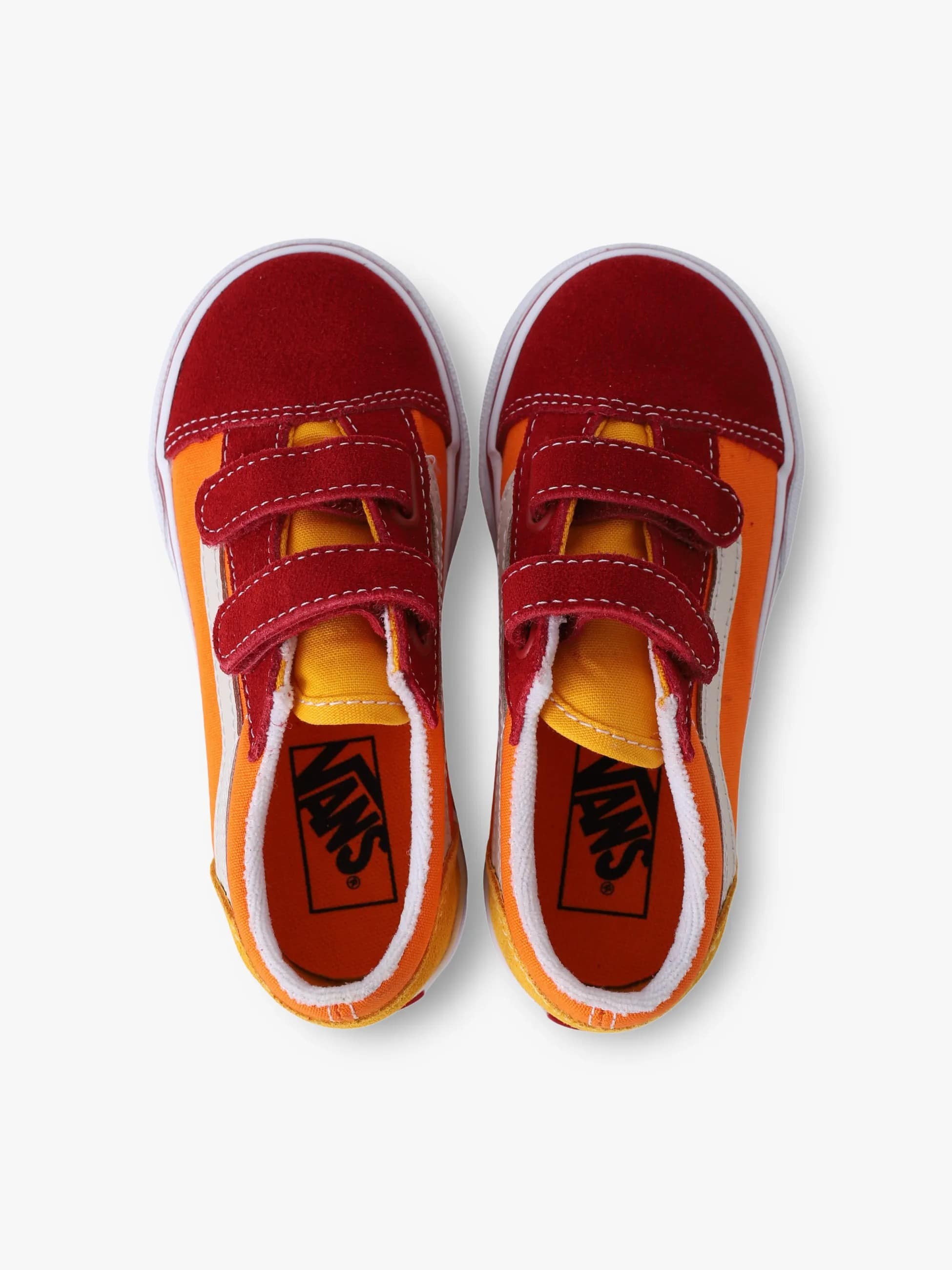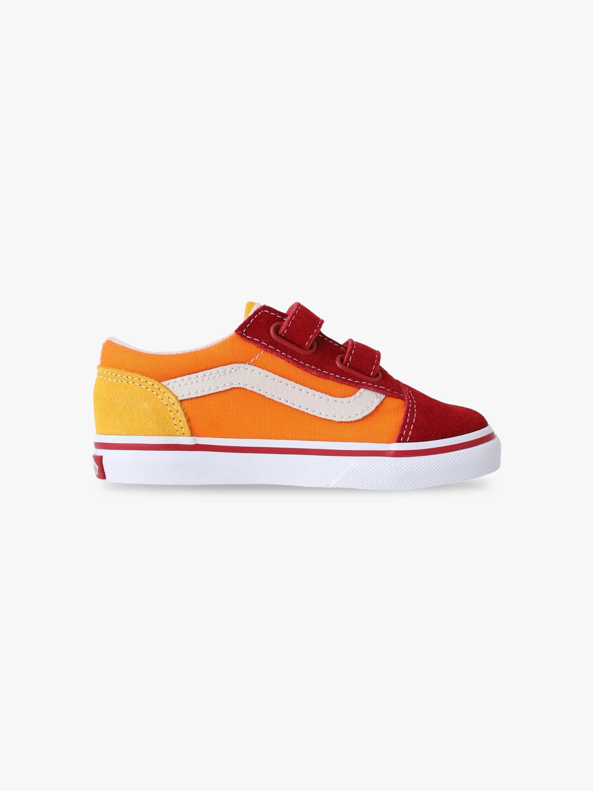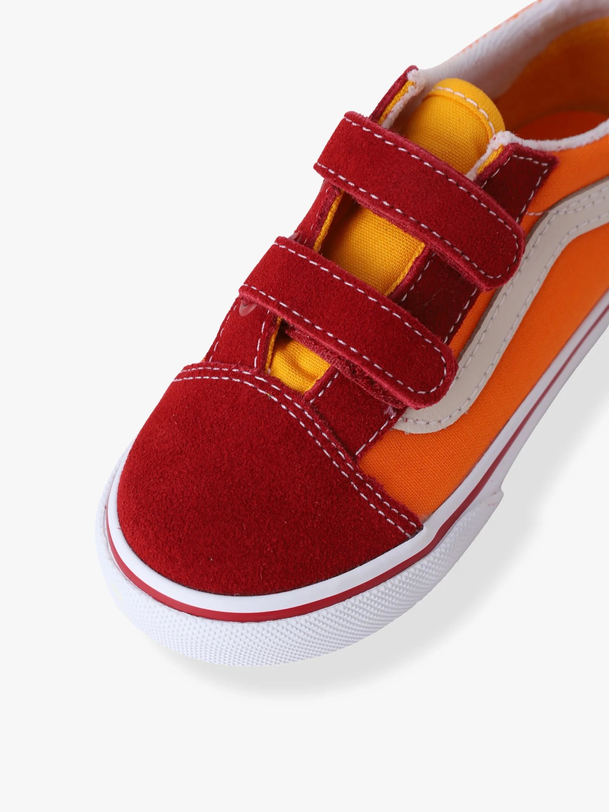 レッド×オレンジのポップなカラーリングが目を引くオールドスクールシューズは、クラシックなサイドストライプスタイルに遊び心を加えた一足です。 伝統的なシューレースの代わりに、マジックテープを採用しているため簡単に着脱できる設計になっています。