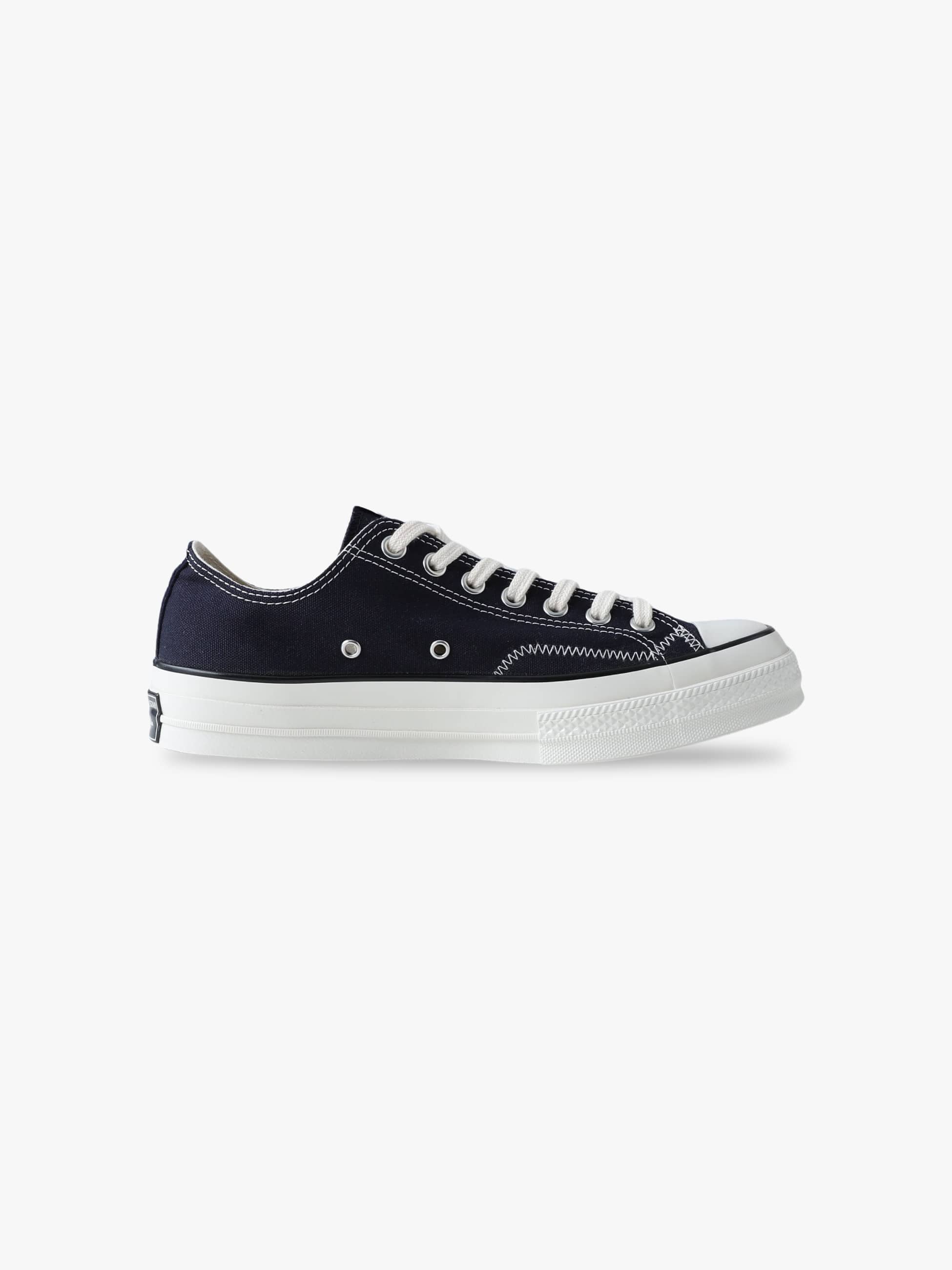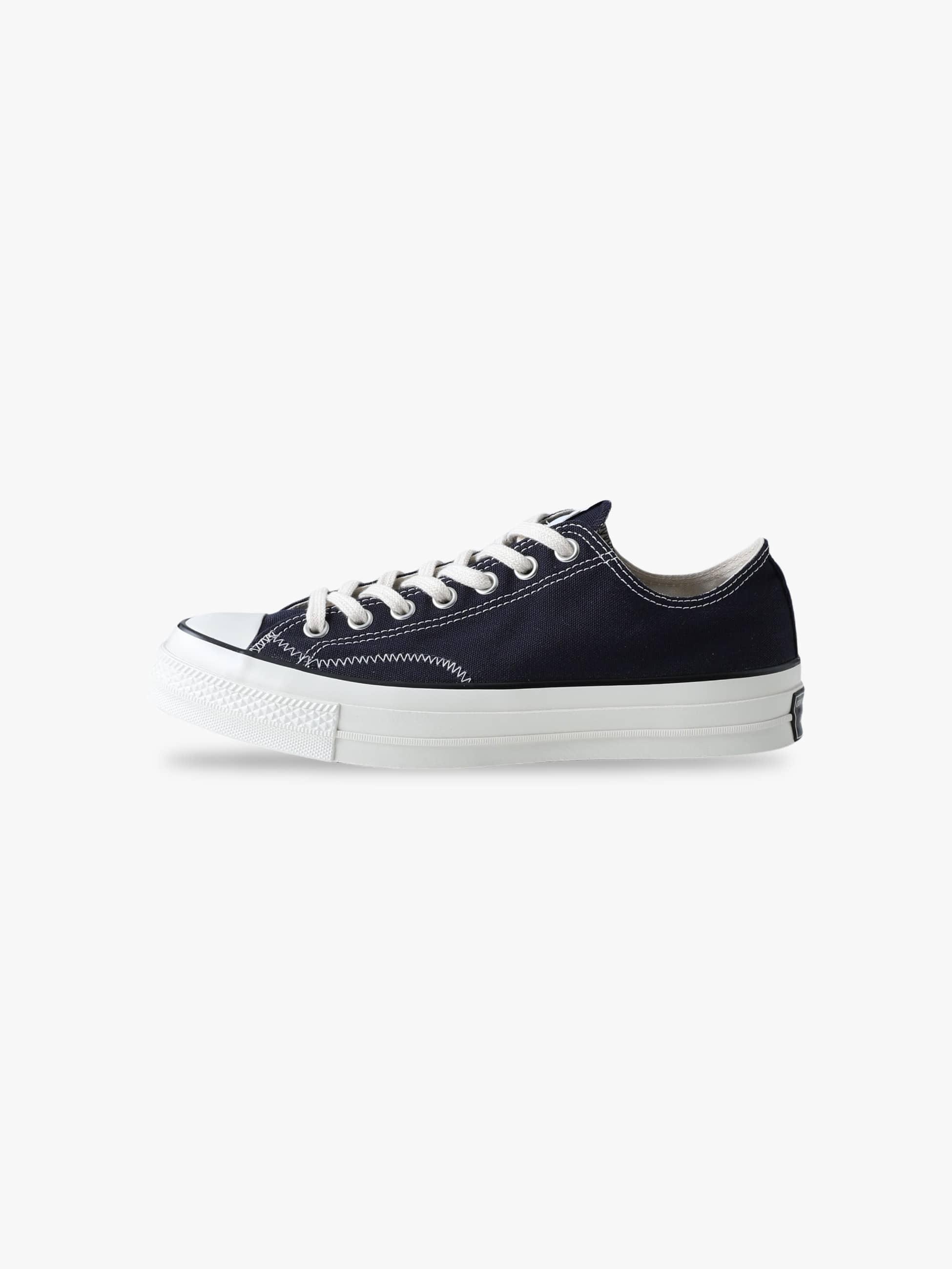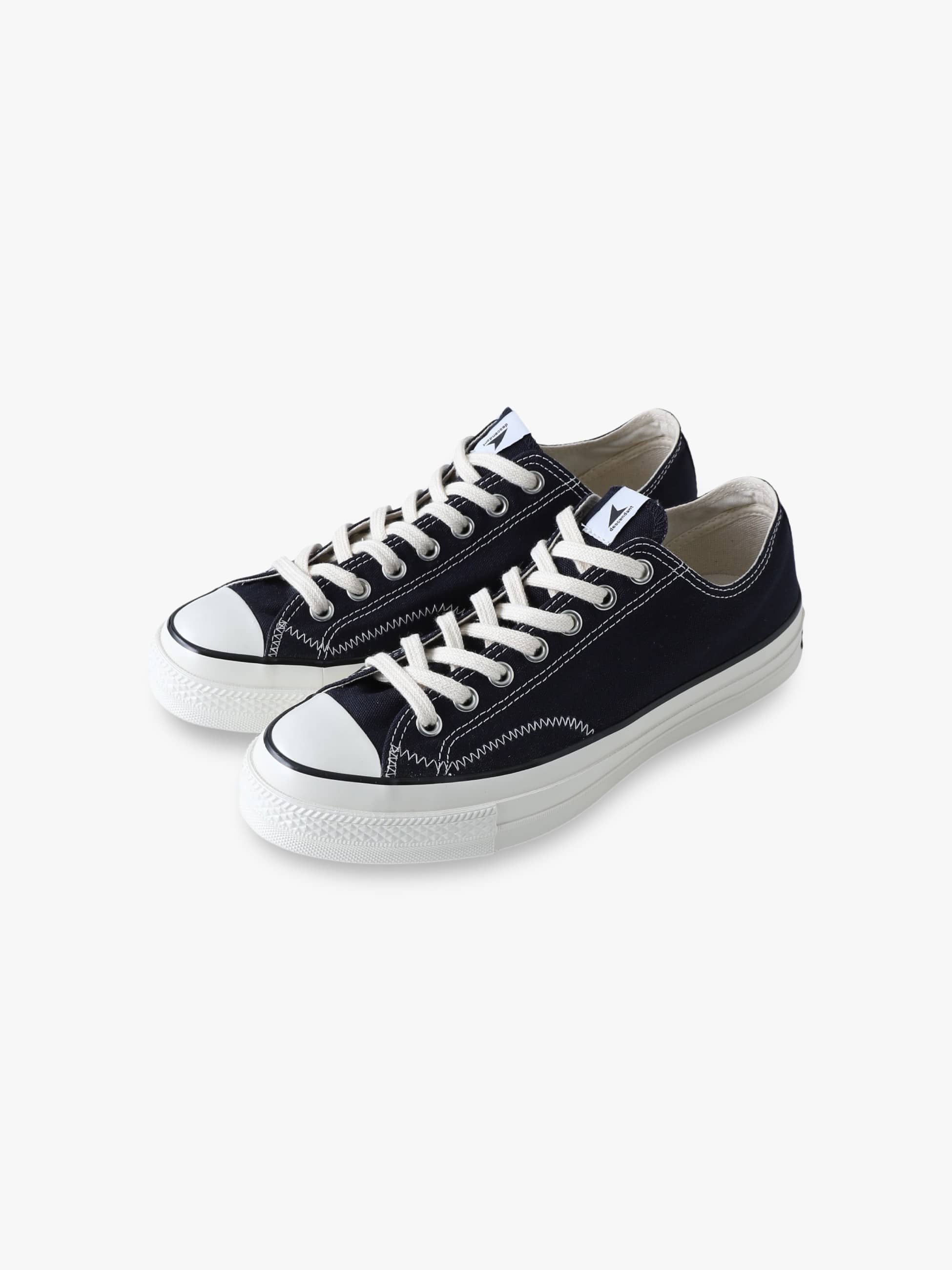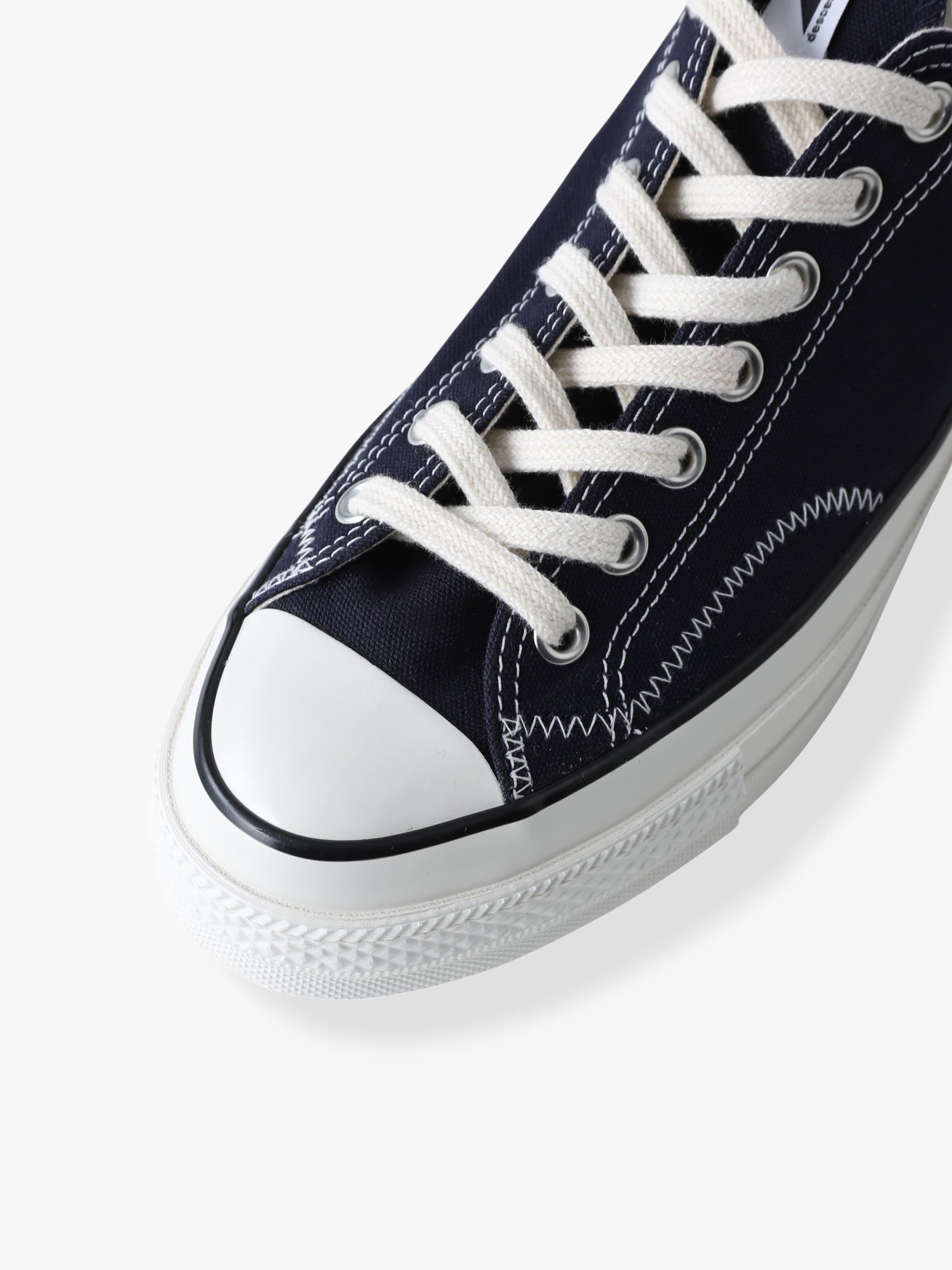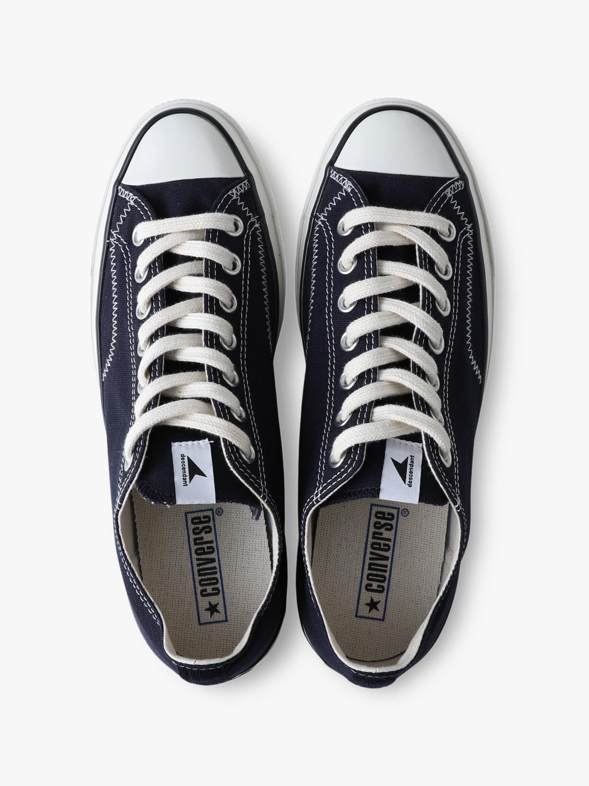 - 1970年代のコンバース・オールスターに見られる通称「一つ星」のヒールパッチなどクラシックなディテールを踏襲し、シルエットや履き心地をアップデートしたオールスターLGCY(「LEGACY(レガシー)」の略)をベースに、DESCENDANTが共同製作したコラボレーションモデルの登場です。DESCENDANTのキーカラーであるダークネイビーをまとったキャンバス地のOXカット(ローカット)に、サイドステッチをヨットの帆などに採用されるジグザグステッチでアレンジしています。また、シュータンにはCETUSのピスネームを付属し、インソールにダブルネームとスローガンを綴った「GIVE LIFE MEANING DESCENDANT」をライニングにプリント。ふっくらとした風合いの白いコットンシューレースの他、アッパーと同色のスペアシューレースを付属しています。