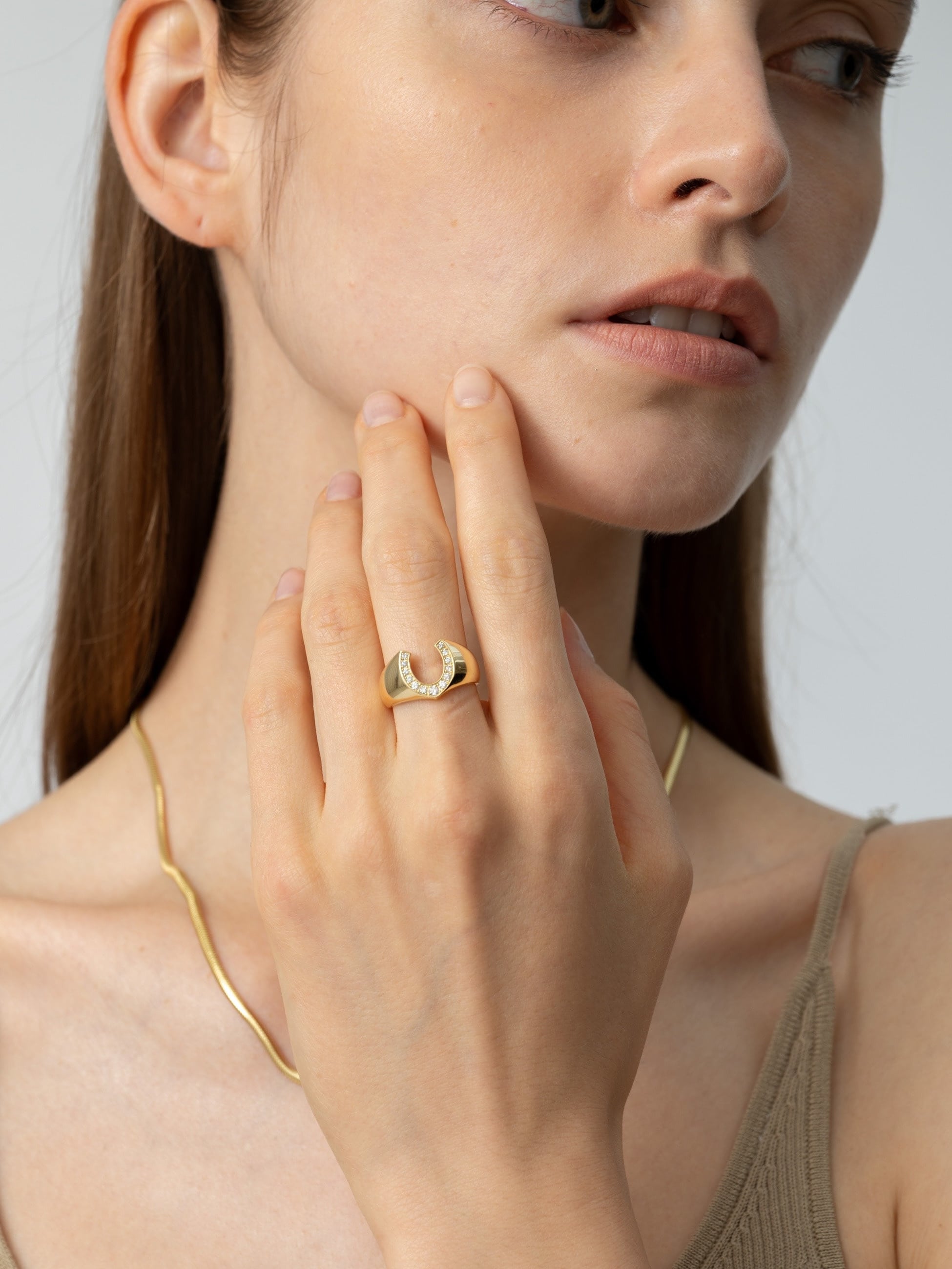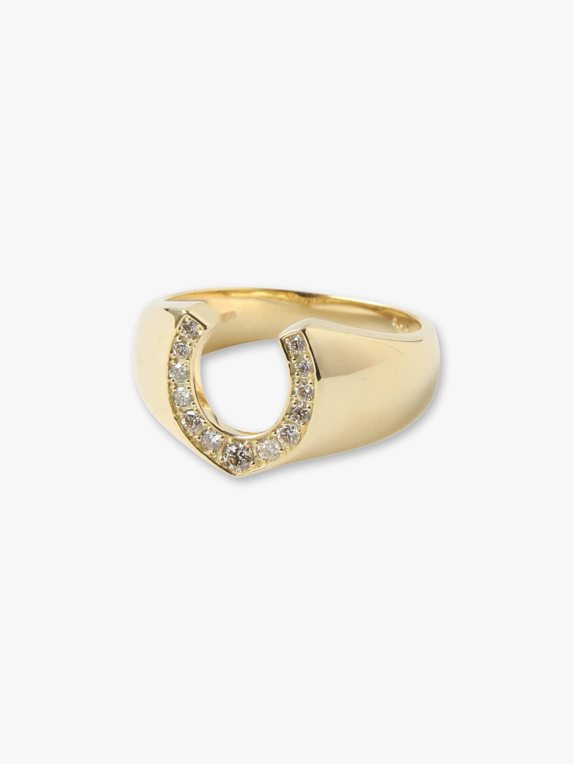 - ダイヤモンドが敷き詰められた、高級感溢れるホースシューモチーフのリングは、スペシャルな存在感を放ち、手元を華やかに演出してくれます。ドレスアップにも最適で、時代を超えて永くご愛用いただけるアイテムです。