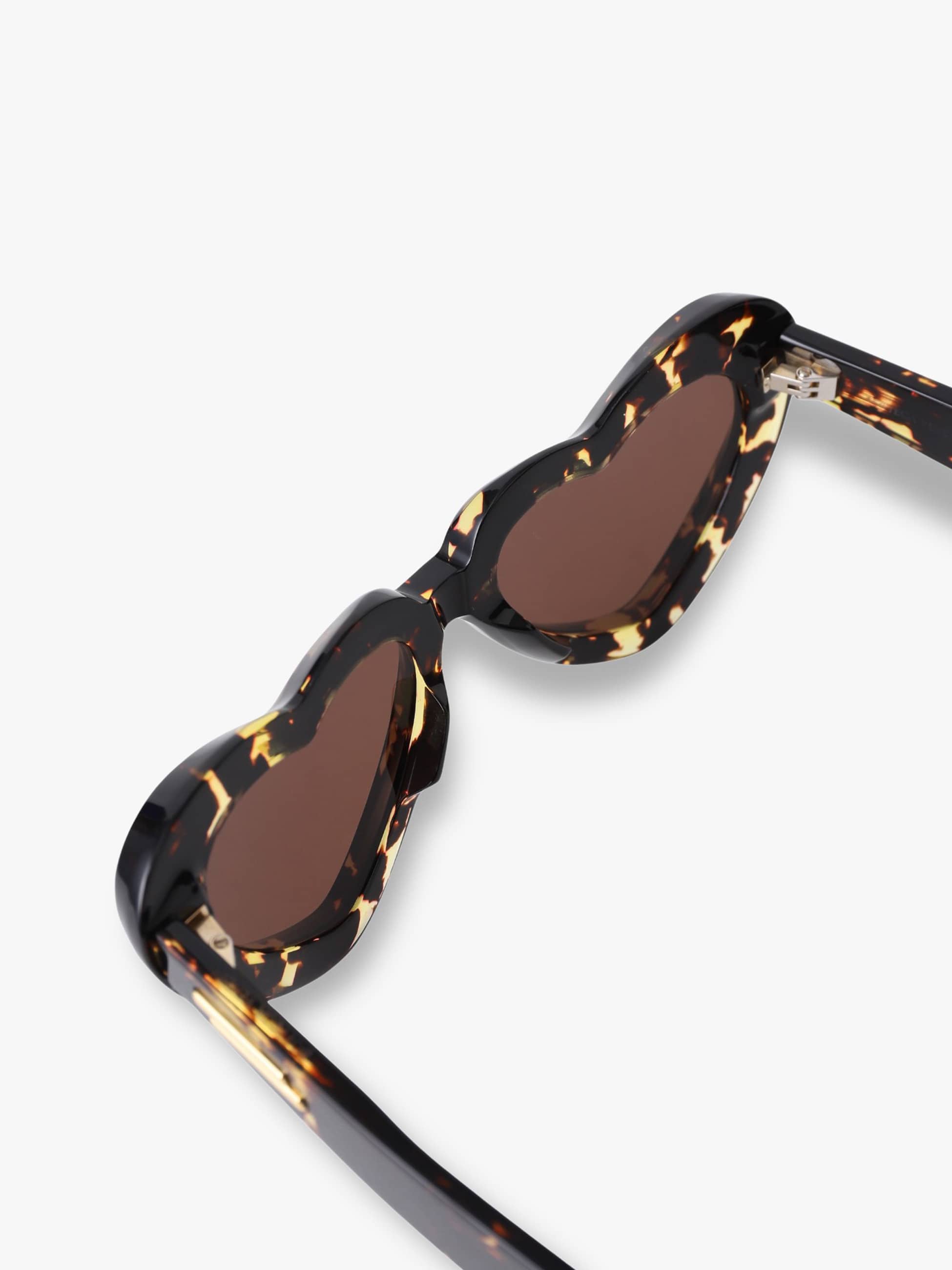 - ハートフレームが目を惹くサングラスは、遊び心のあるデザインとブラックベースのカラーバランス感が秀逸で、感度の高いスタイリングを演出します。