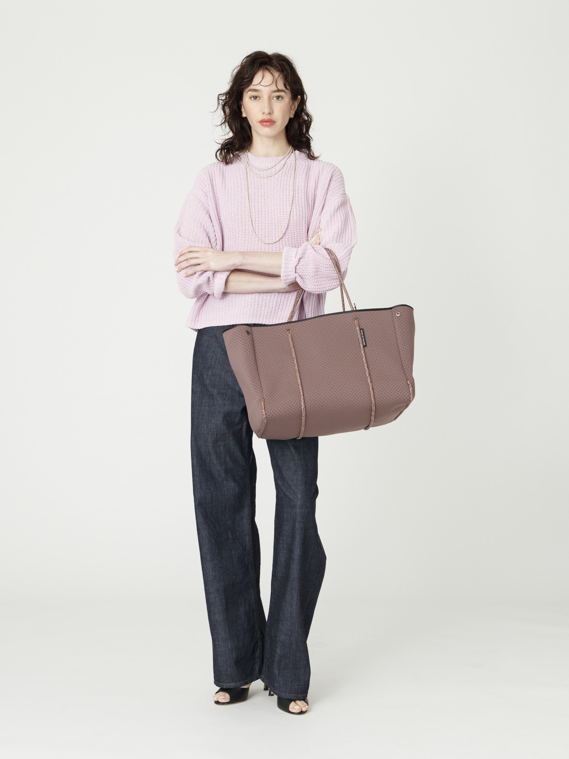 STATE OF ESCAPEのシグネチャーアイテムでもある、トレンドに左右されないエレガントな佇まいのEscapeは、ノートパソコンが収まるたっぷりとしたサイズ感が特徴で、サイドのスナップボタンを留めて、スタイリングや物量によってシルエットをコンパクトに変えていただけます。持ち手は耐久性と操作性に優れたセーリング用のロープを使用しており、取り外しが可能な同素材のミニポーチが付いているのも嬉しいポイント。旅行はもちろん、デイリーシーンからアウトドアシーンまで幅広く活躍する万能バッグです。