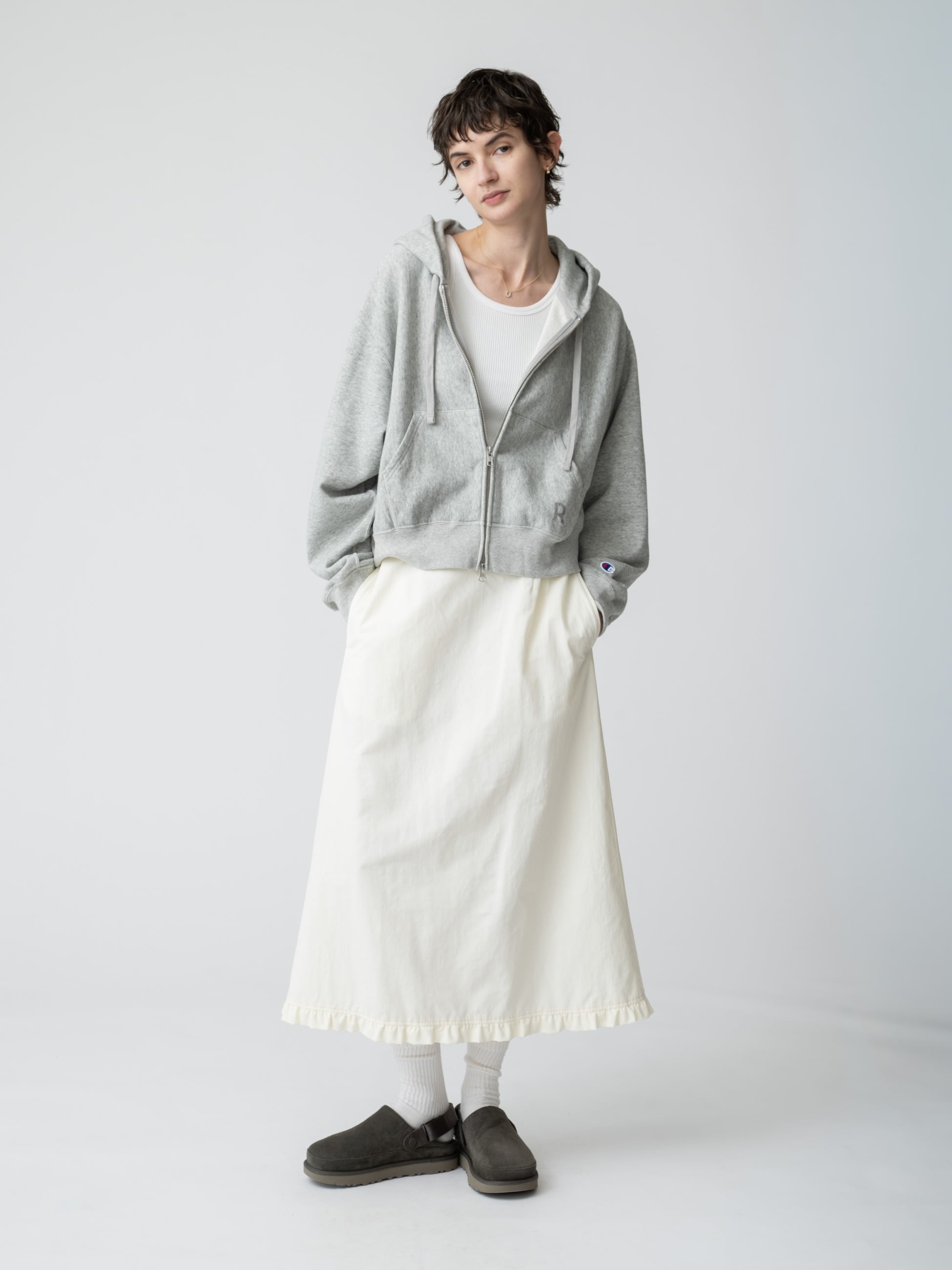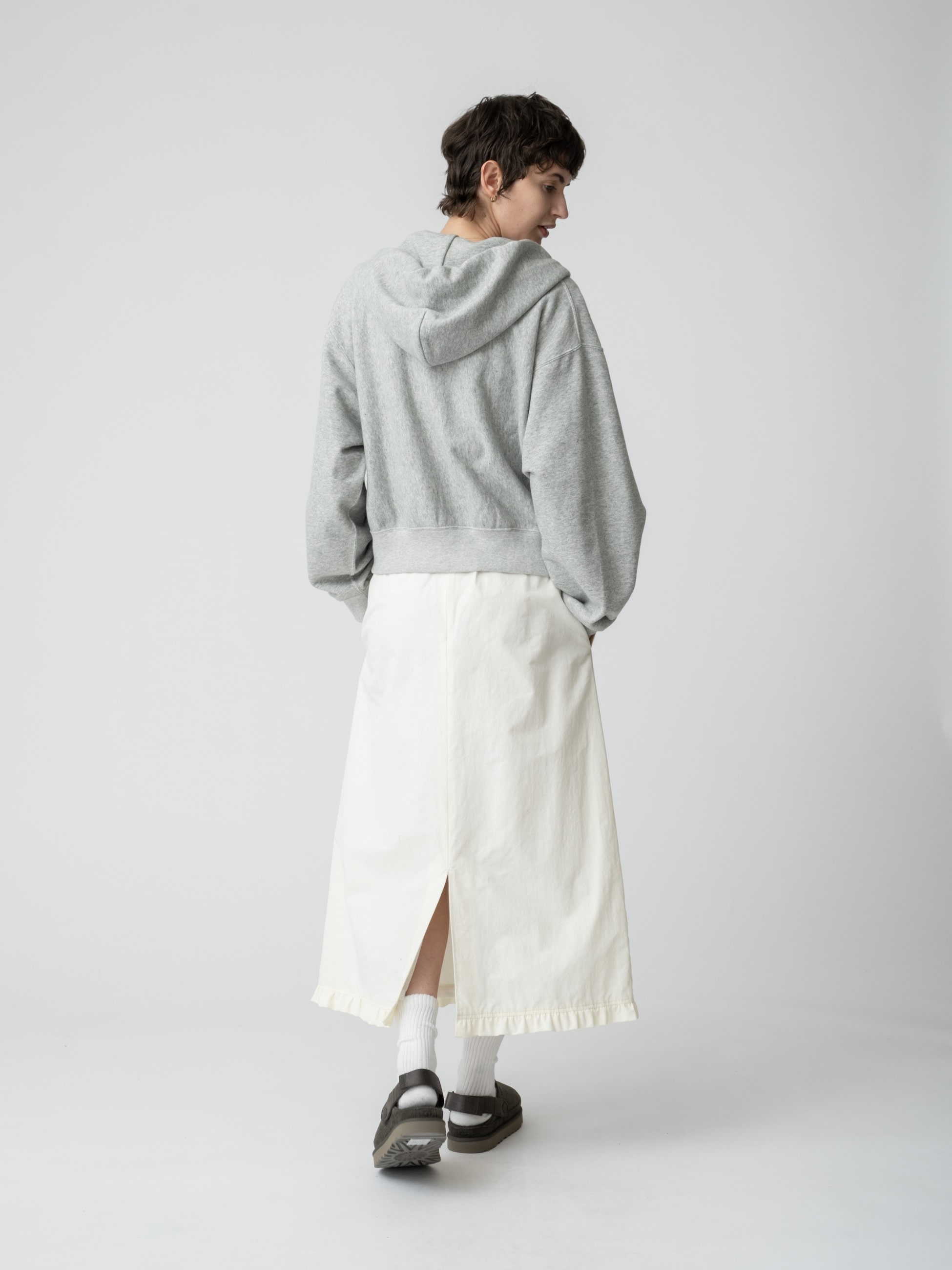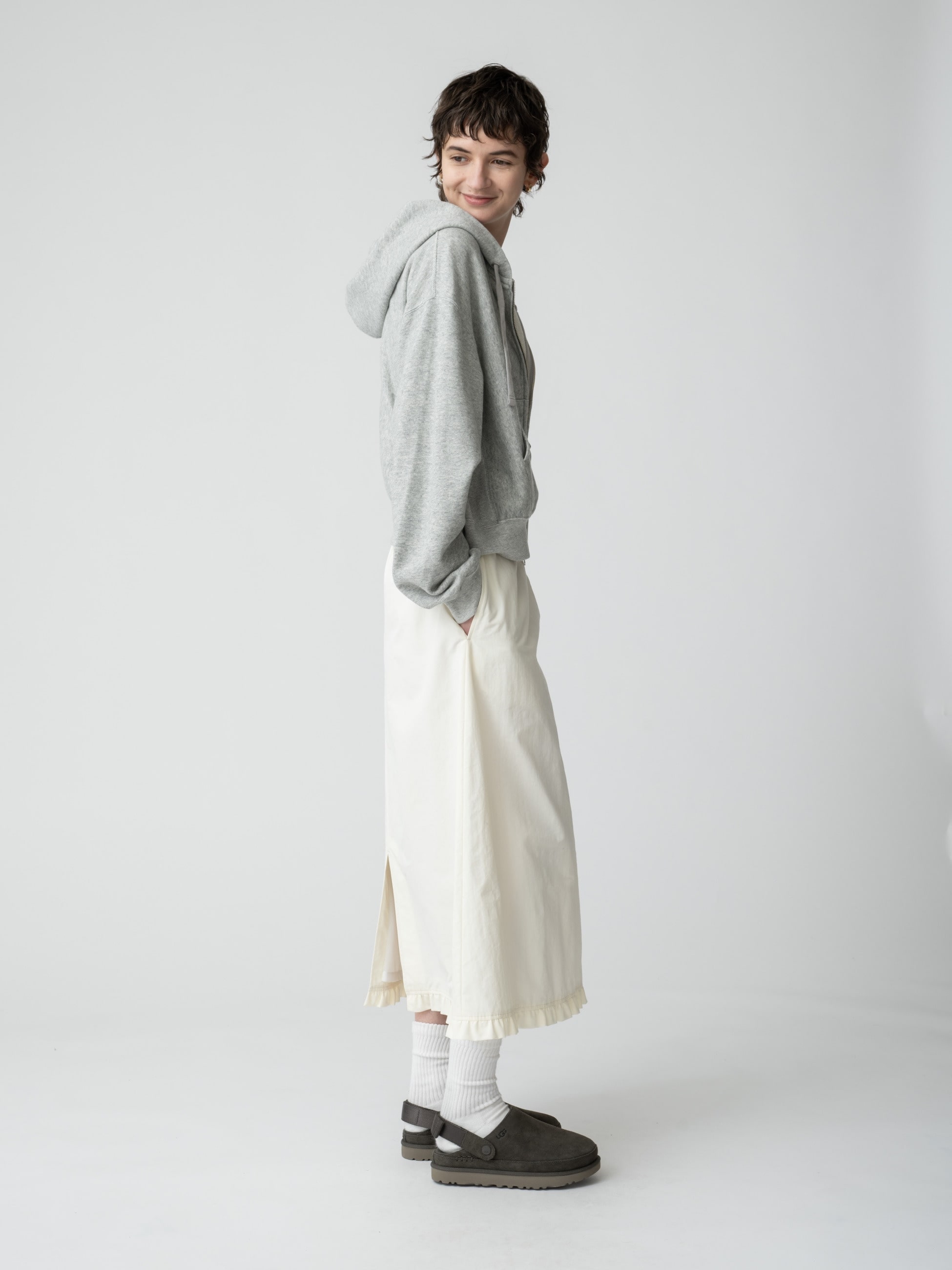毎シーズン好評の別注アイテムから、26SSシーズンはフェミニン&スポーティーがテーマのJANE SMITH for RHCらしいスカートが登場です。上品なシルエットに裾のフリルが可憐さをプラスし、バックスリットにより動きやすさもキープ。機能性素材を使用した着心地の良さも兼ね備えています。スウェットプルオーバーなど、カジュアルなアイテムと合わせたRHC ロンハーマンらしいスタイリングもおすすめです。