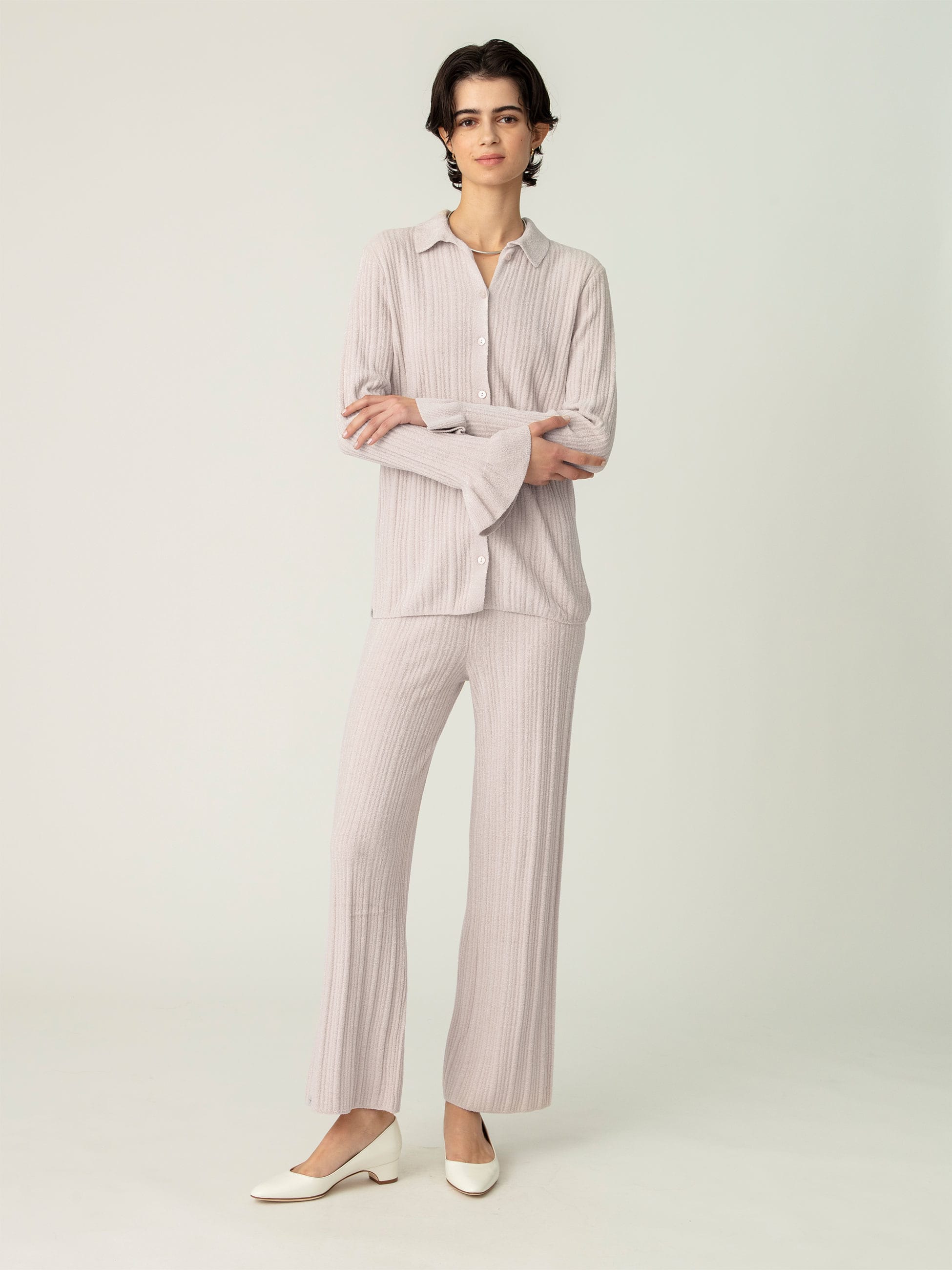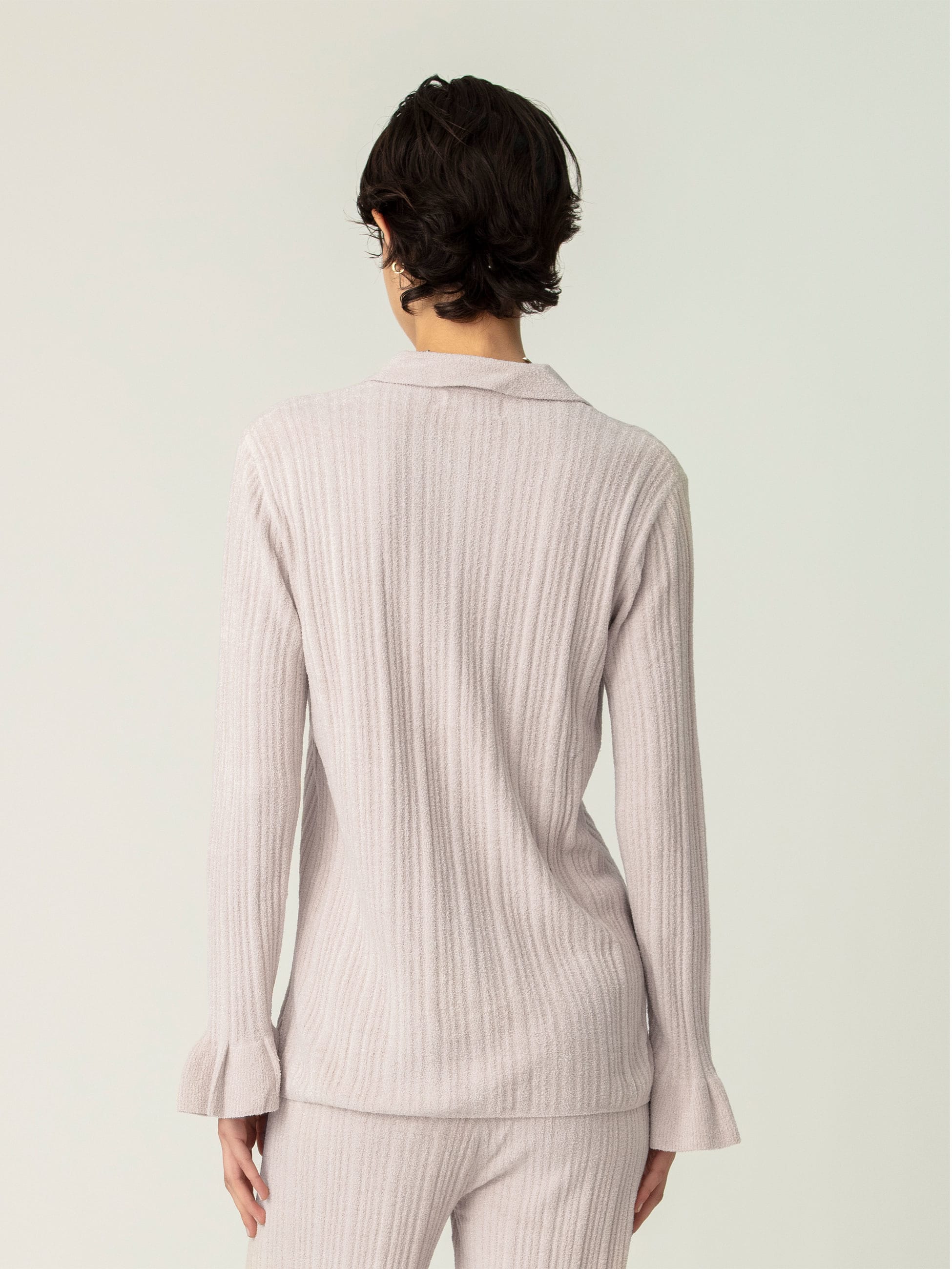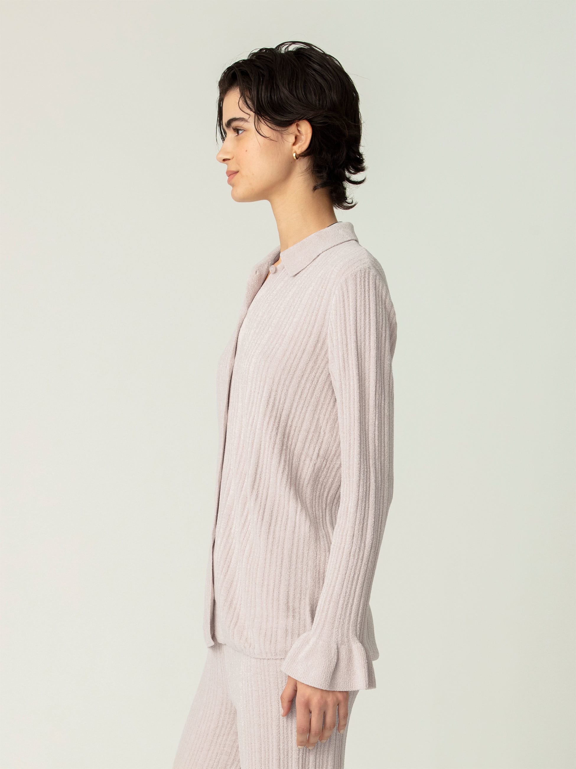 肌になじむような優しく涼しい肌触りが特徴のコージーシックウルトラライト素材を使用したリブカーディガンは、柔らかな着心地が快適で、クラシックなシャツデザインに、袖口のフリルがフェミニンな印象をプラスします。カジュアルにもフォーマルにも決まり、同シリーズのリブパンツとセットアップでも着用いただけます。