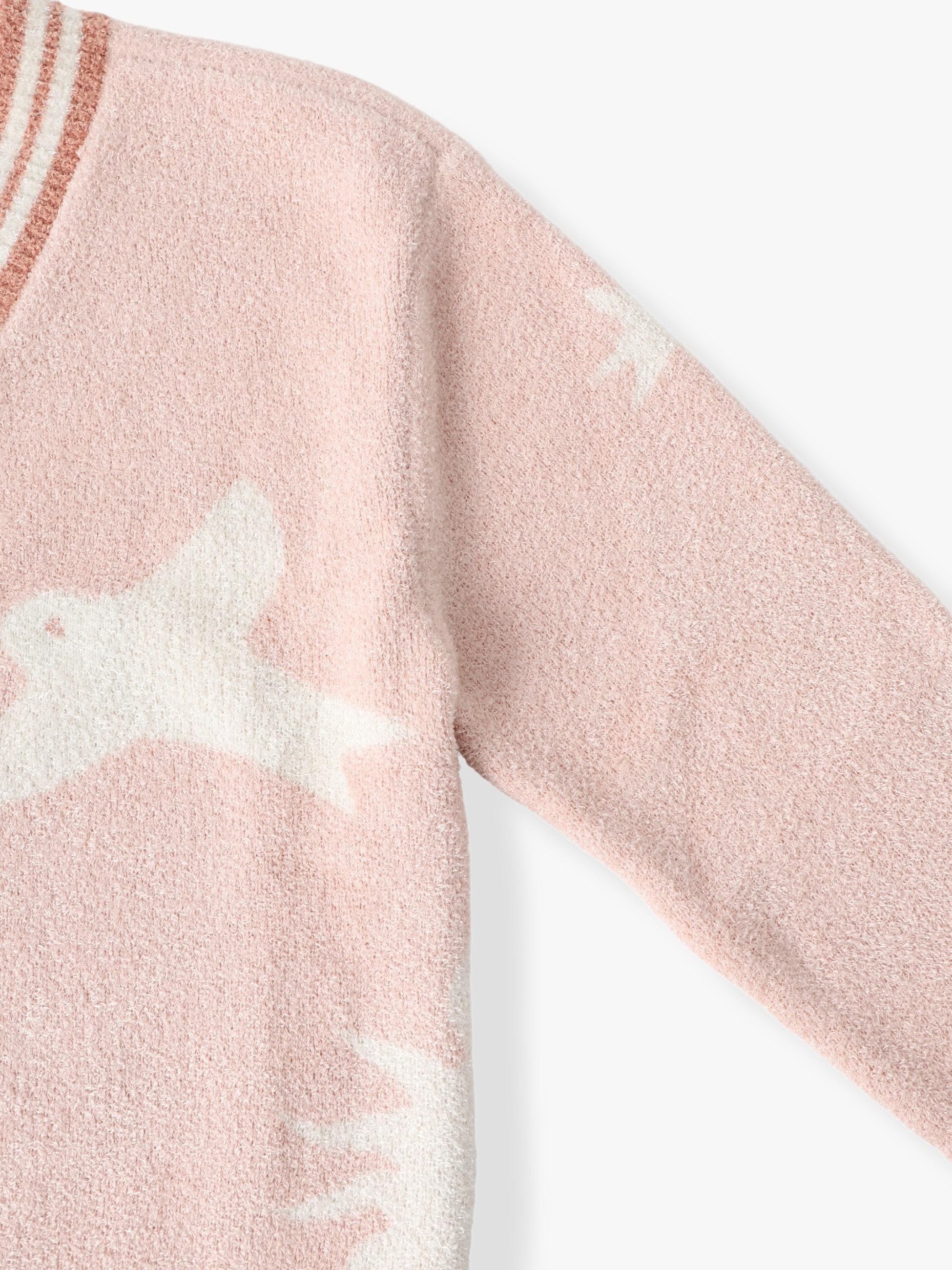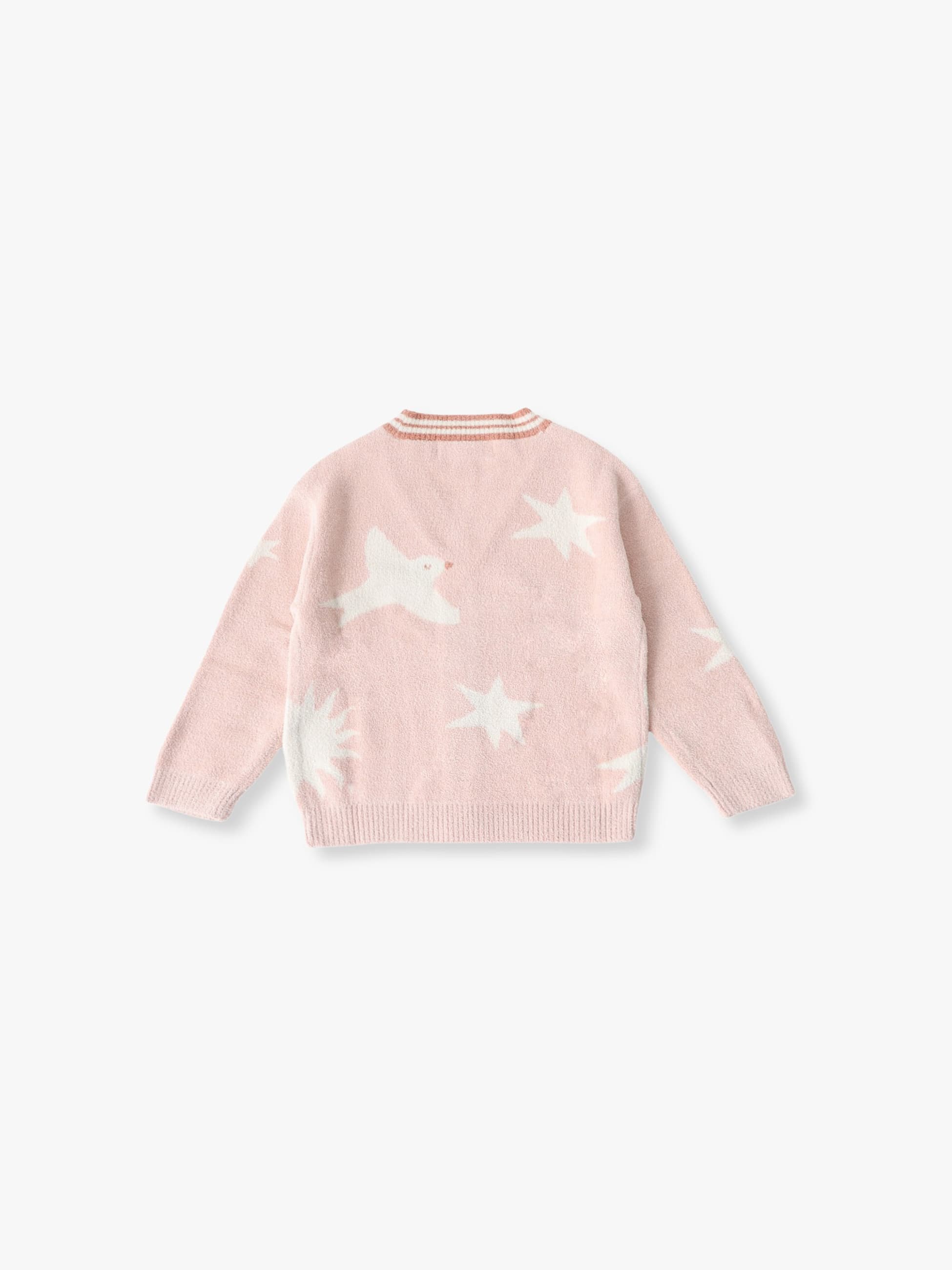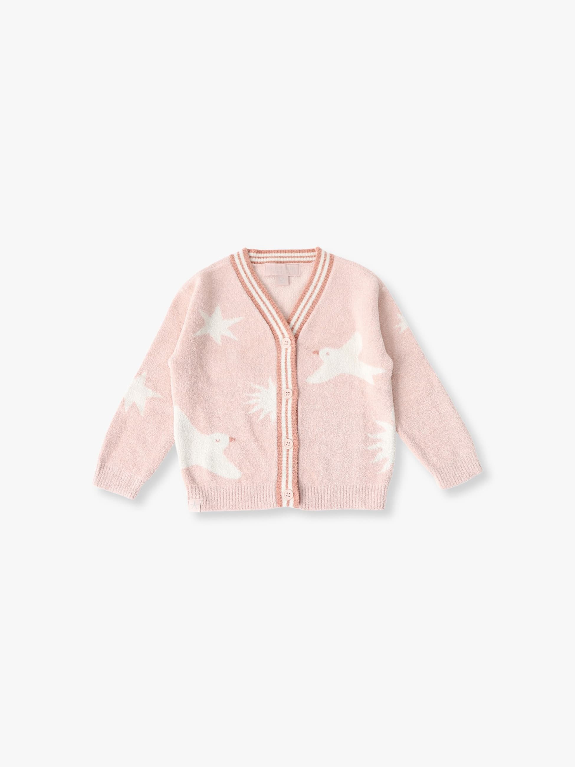 スパロウとスカイモチーフが全体に散りばめられたやさしいカラーリングのカーディガンは遊び心あふれるデザインです。柔らかな素材で仕立てられたVネックの前開きデザインのため、着脱も簡単でデイリー使いにぴったなアイテムです。
