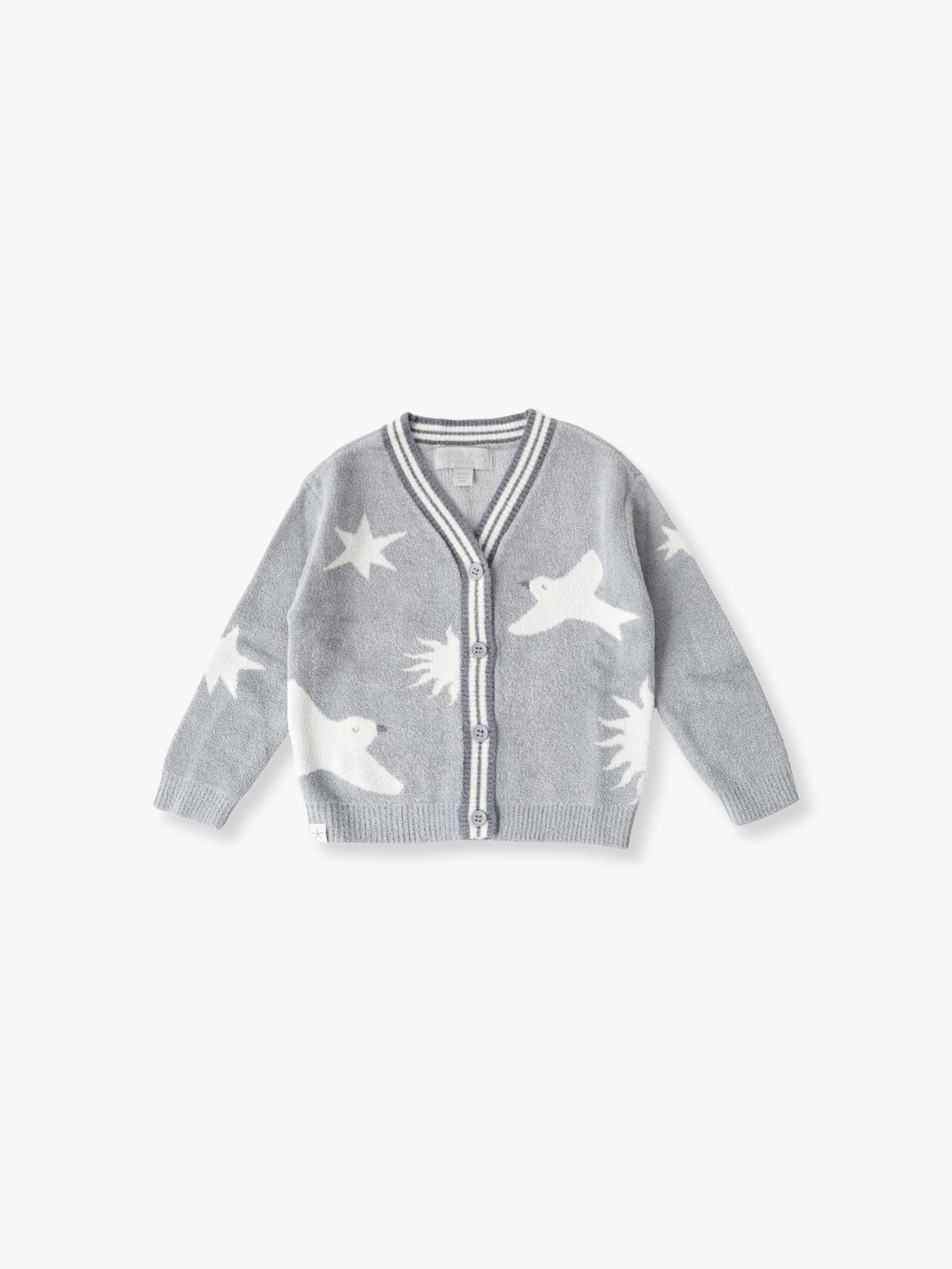 スパロウとスカイモチーフが全体に散りばめられたやさしいカラーリングのカーディガンは遊び心あふれるデザインです。柔らかな素材で仕立てられたVネックの前開きデザインのため、着脱も簡単でデイリー使いにぴったなアイテムです。