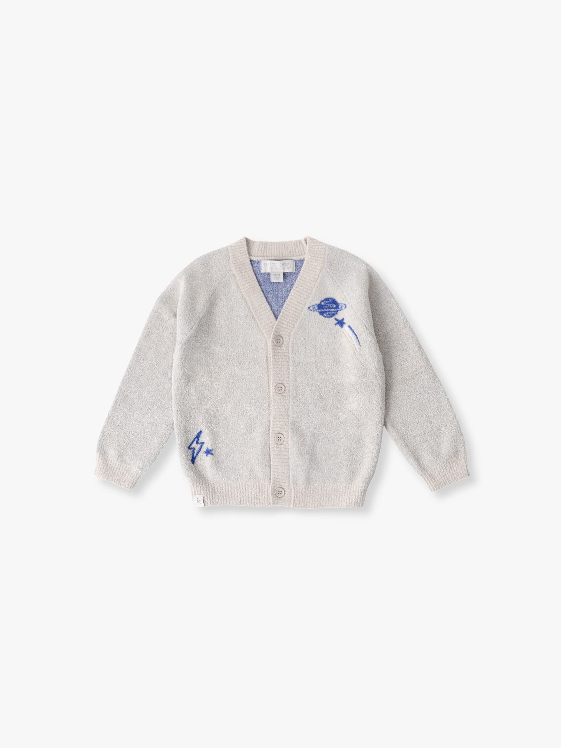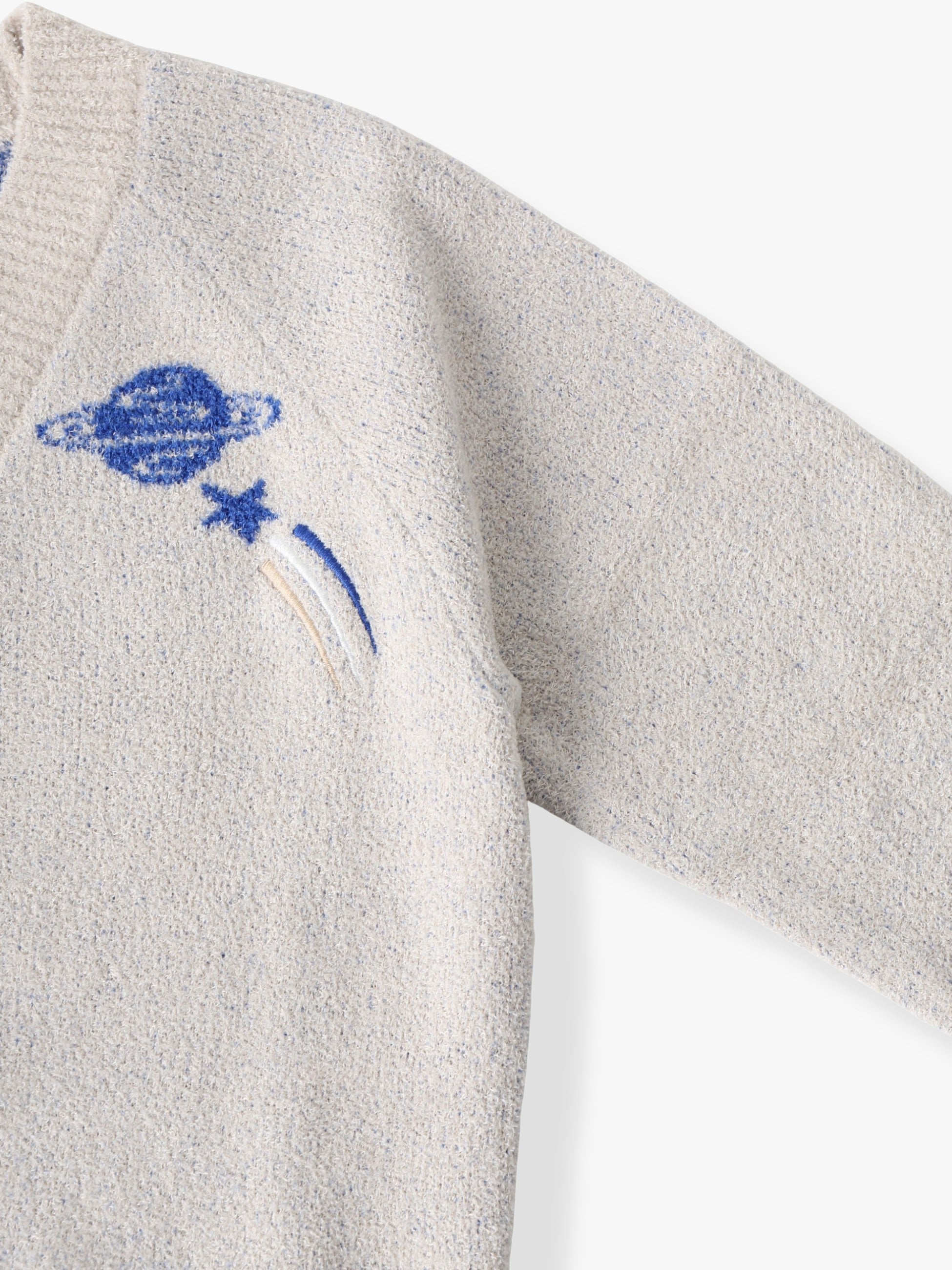 惑星モチーフが遊び心あるカーディガンは、軽くて通気性に優れたコージーシックウルトラライト素材を使用しているため快適な着心地です。ラグランスリーブで動きやすく、袖口と前立てにはリブ編みを施し、ほどよくフィットします。