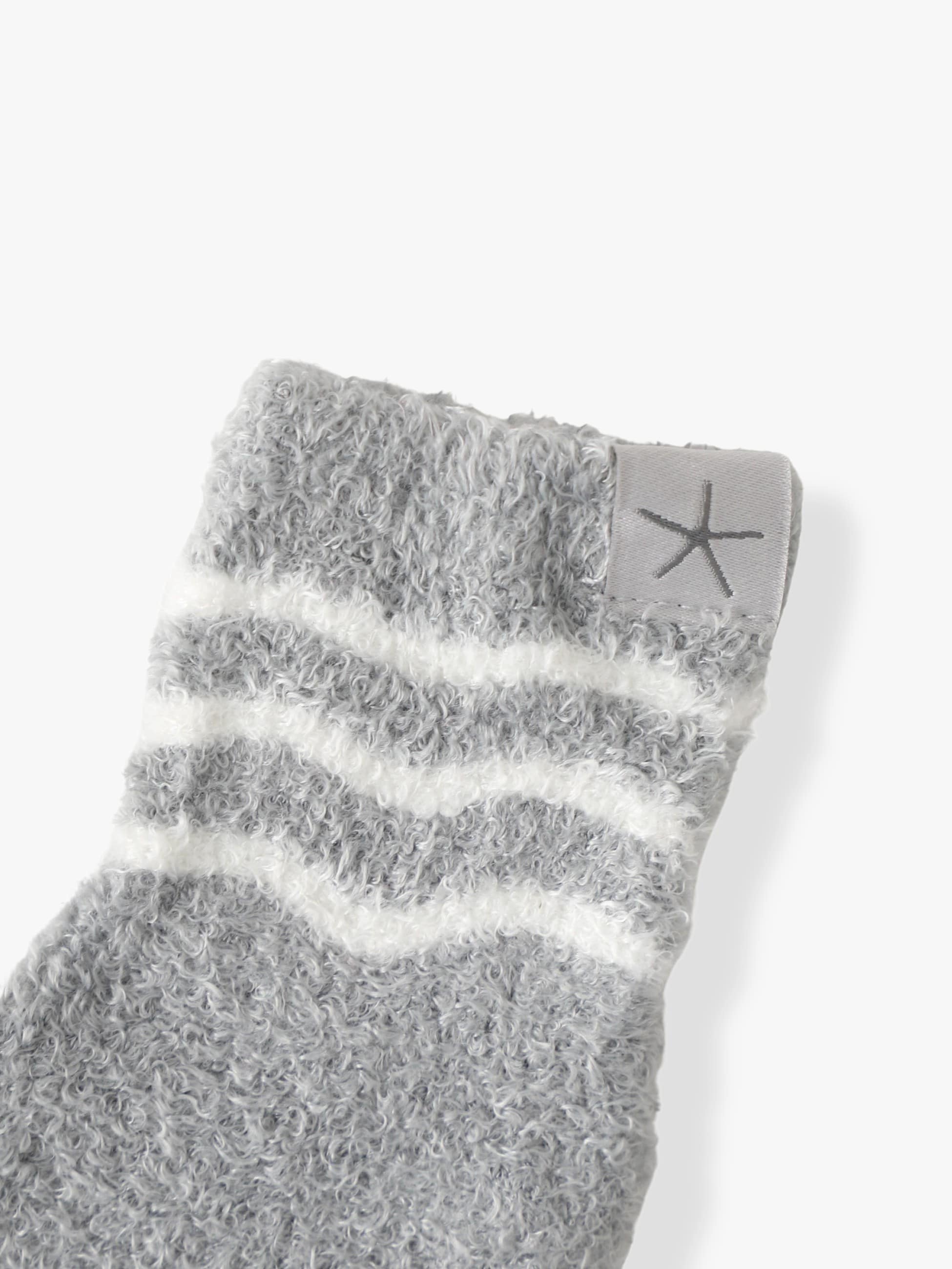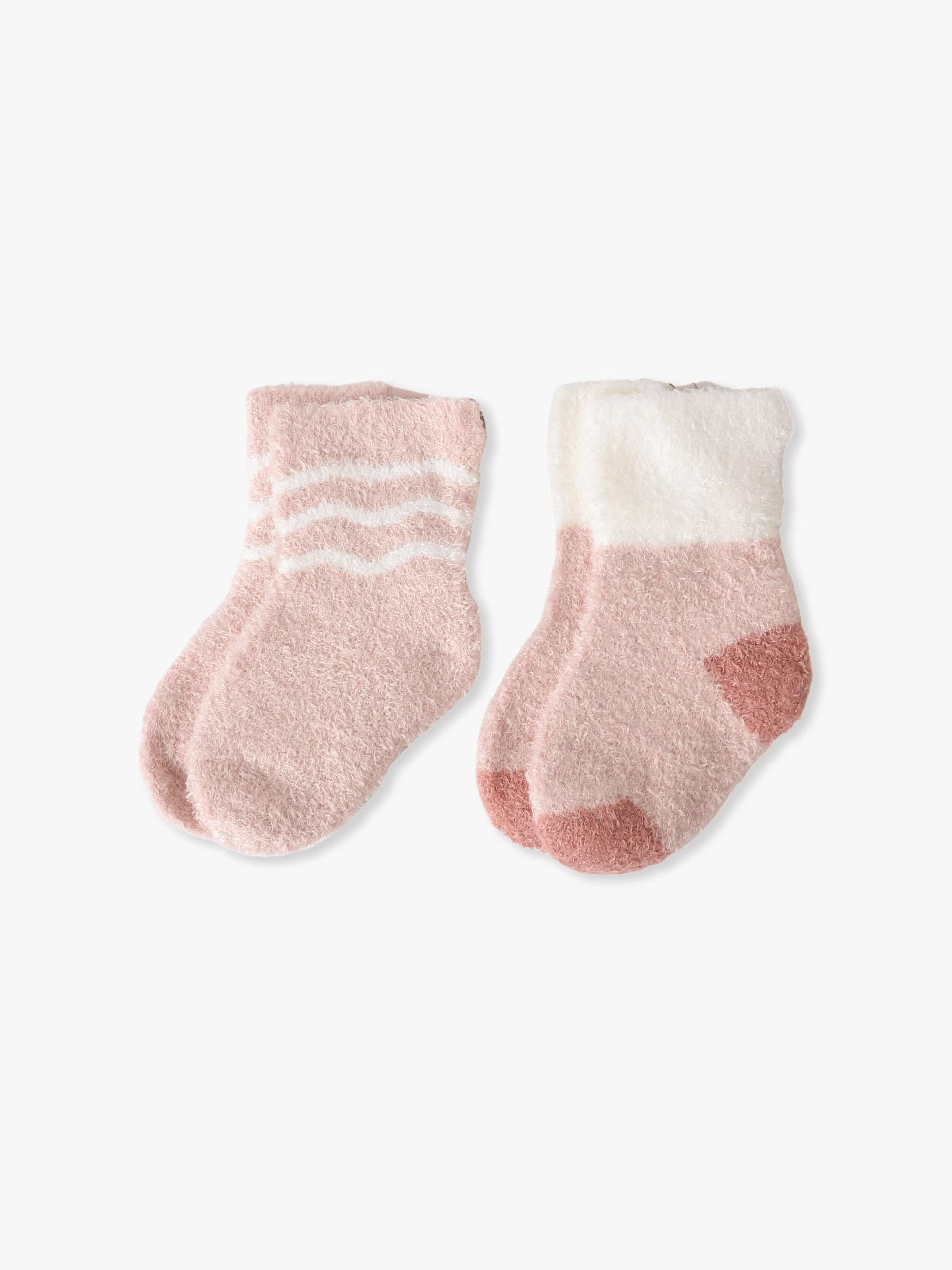 赤ちゃんの足元をやさしく包み込むベビーソックスセットは、1足はカラーブロック、もう1足は波のようなストライプが入っており異なる表情を楽しめるデザインです。軽やかで柔らかなコージーシックライトの素材が、赤ちゃんの肌に心地よくフィットします。