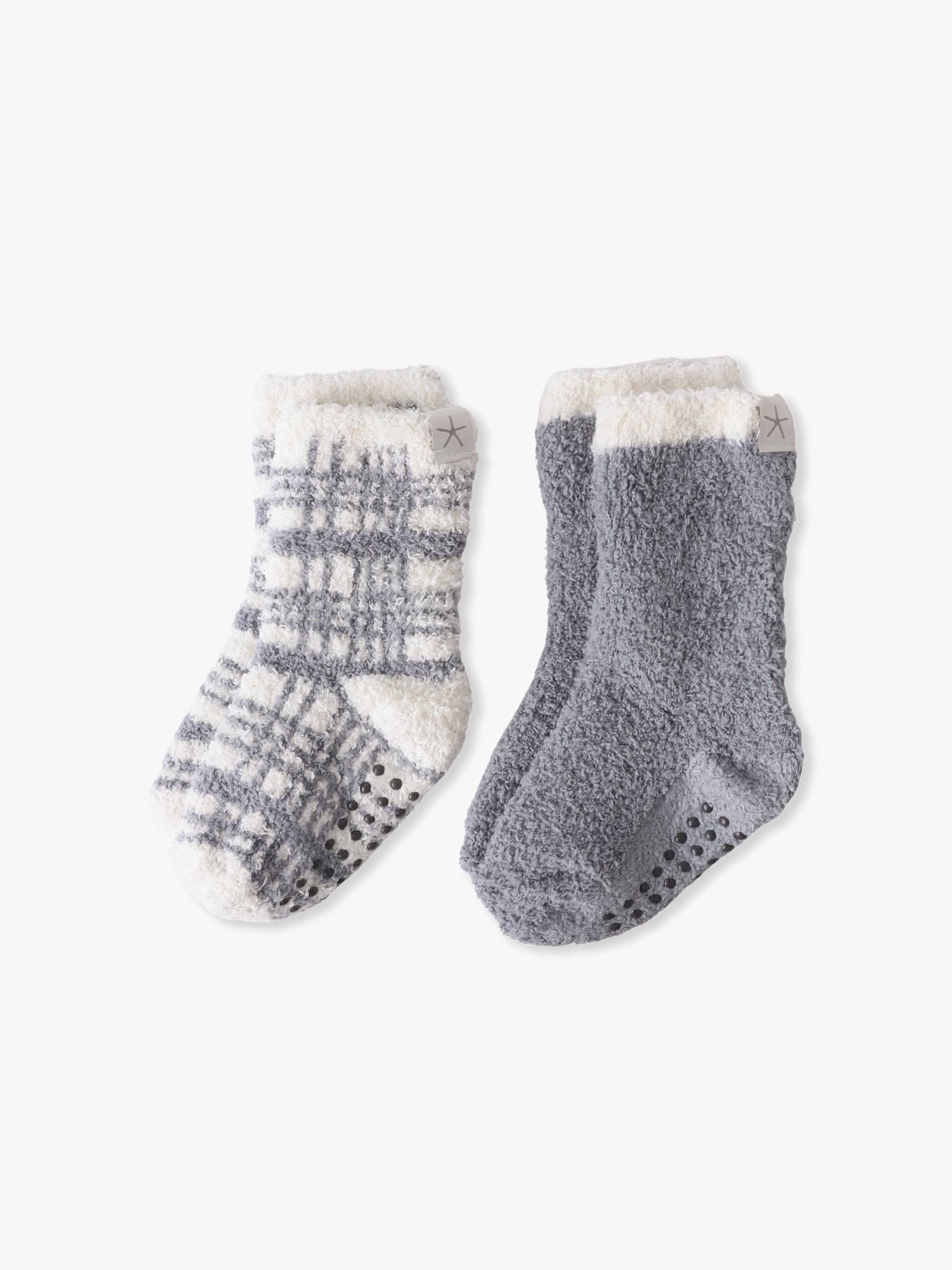 クラシックなチェック柄とラインがキュートなソックスセットは、足元にアクセントを添えるデザインで、デイリー使いはもちろん、ギフトにもおすすめです。BAREFOOT DREAMSならではの柔らかなコージーシック素材を使用し、快適な履き心地とあたたかさを両立します。どちらも足裏にはカラーを合わせた滑り止め付きで、歩き始めの元気いっぱいキッズも安心の仕様です。