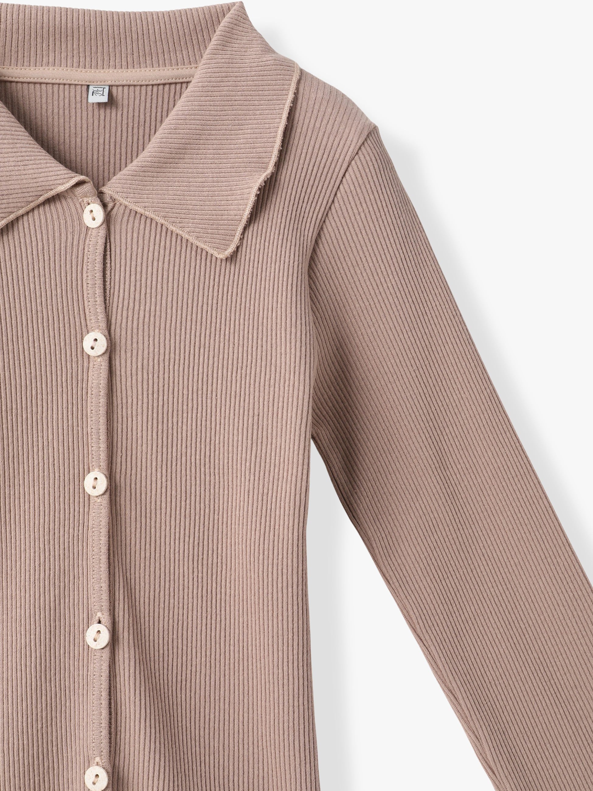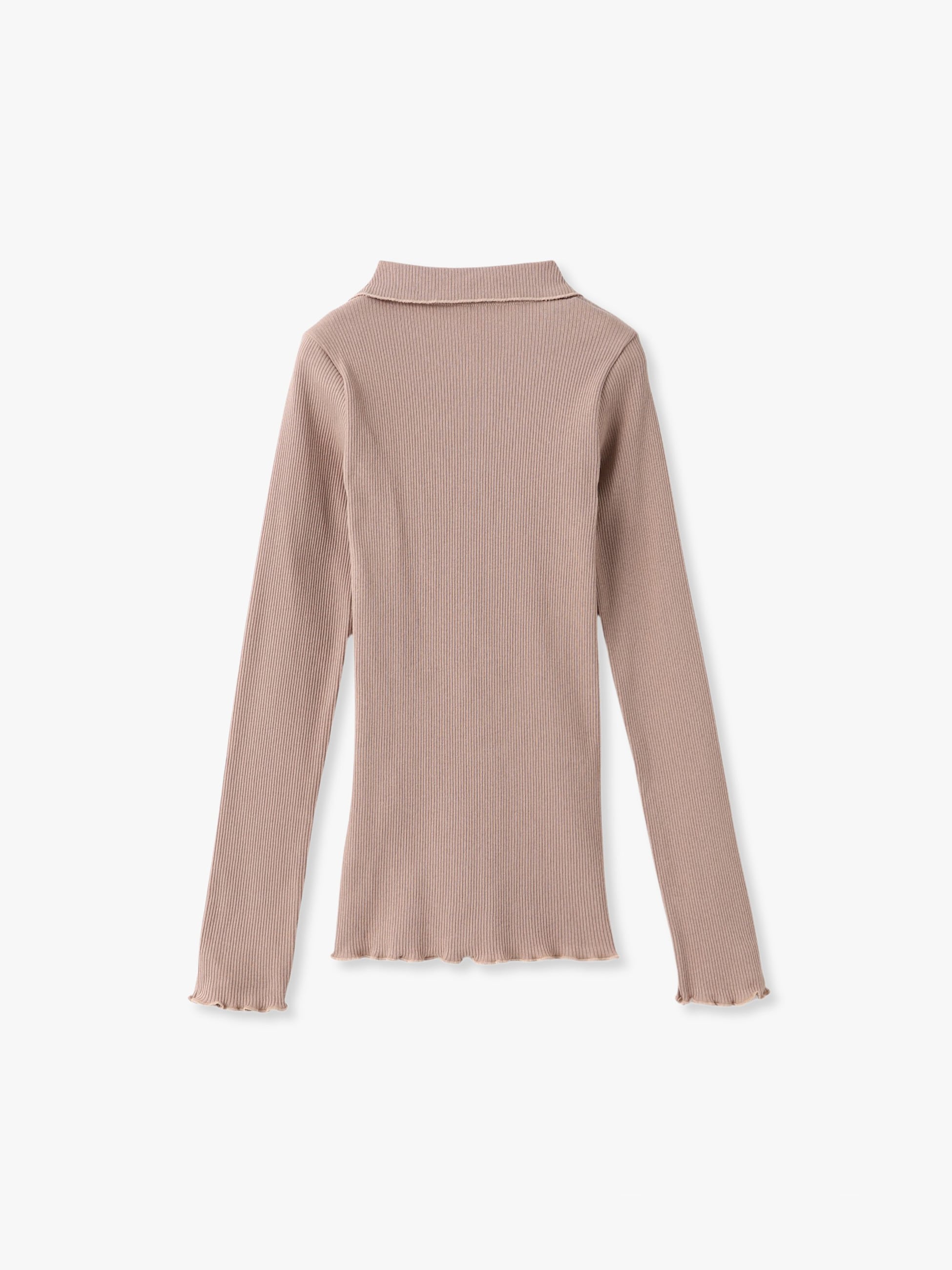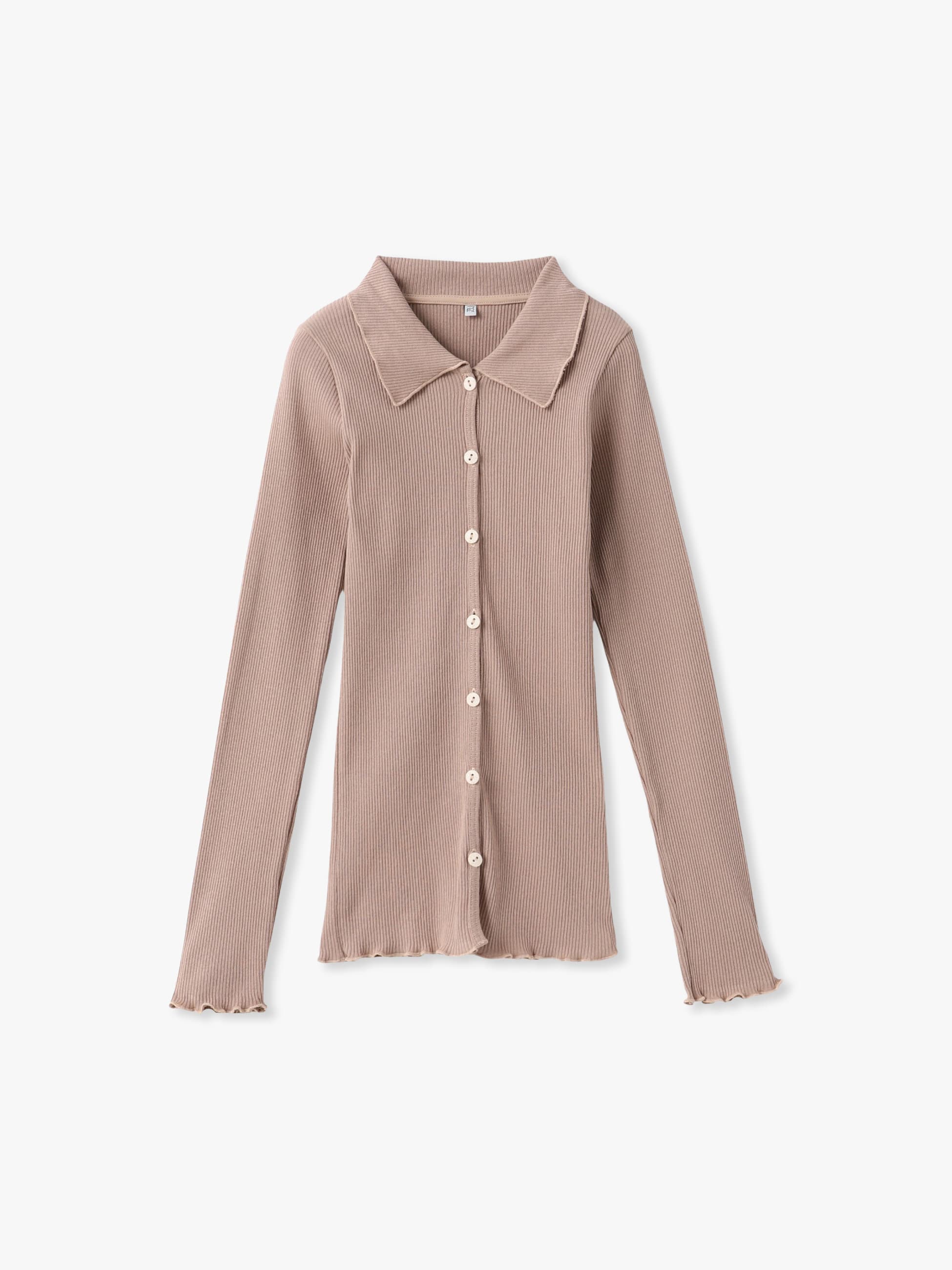 コットン製のリブシャツは、ボリュームのあるボトムともバランスが取りやすいコンパクトなフィット感で、袖口や裾のメロー仕様が可憐な印象を醸します。小ぶりなホワイトボタンもポイントに。ボタンを数個外してインナーを見せるレイヤードスタイルもおすすめです。