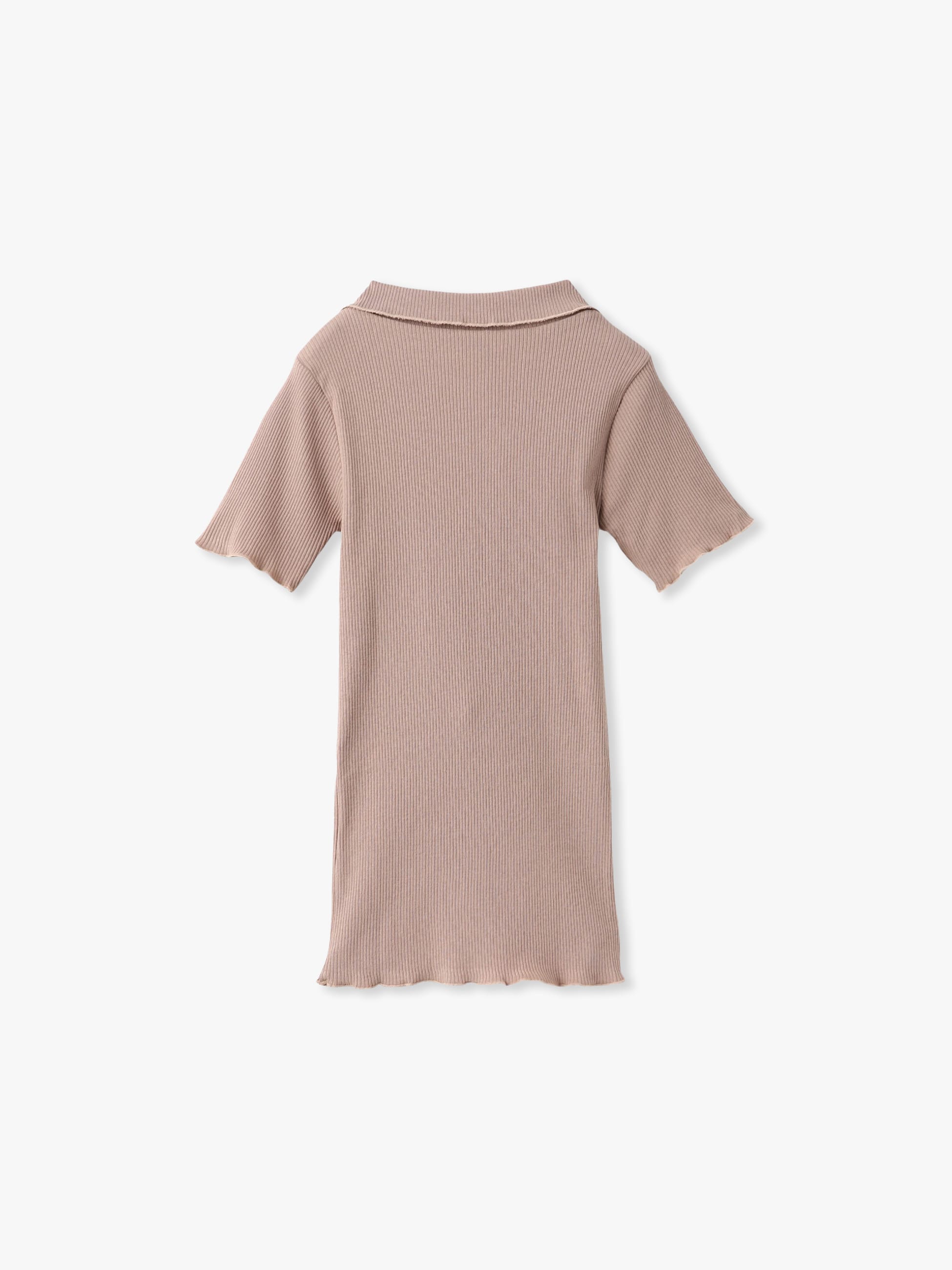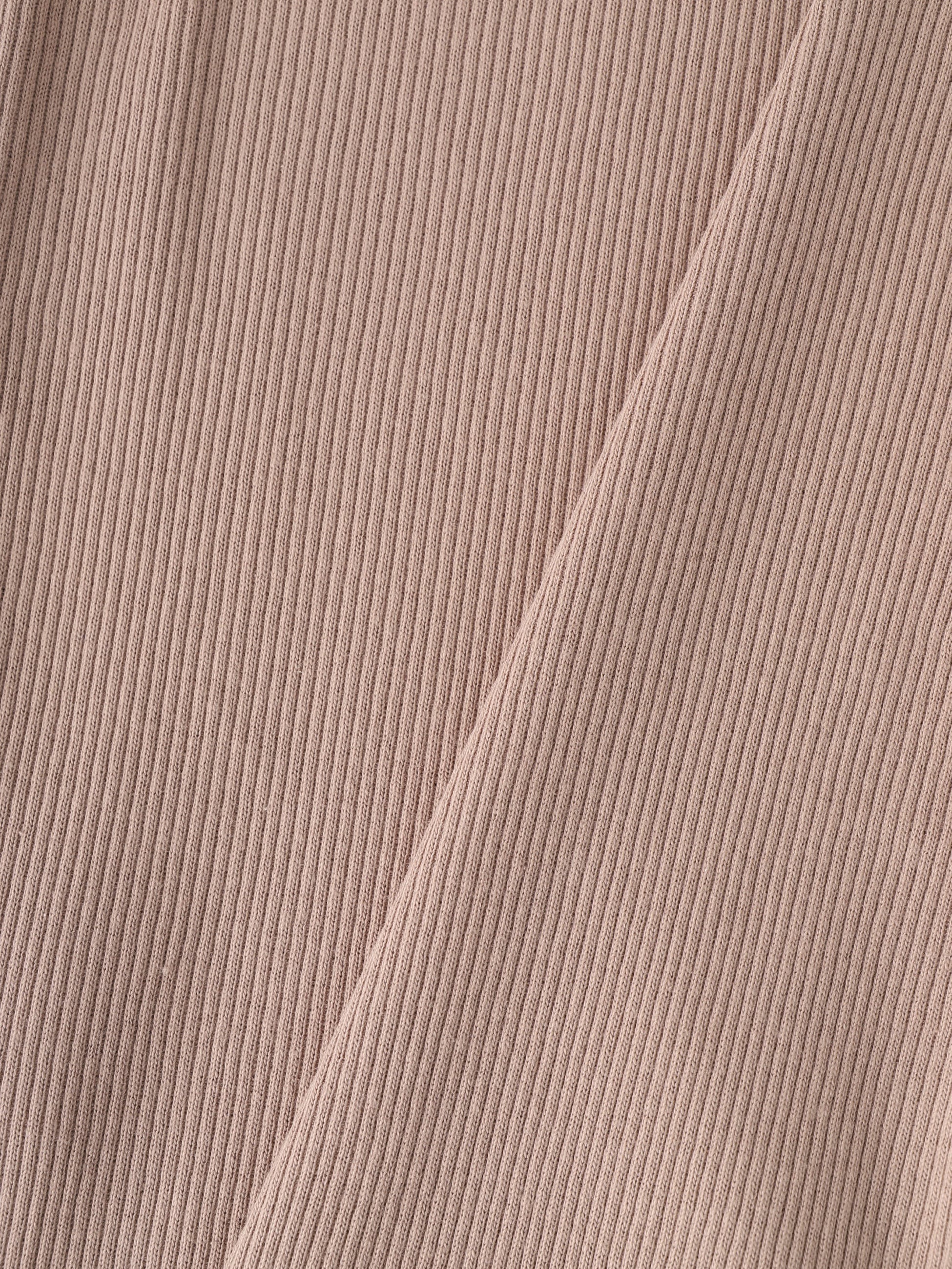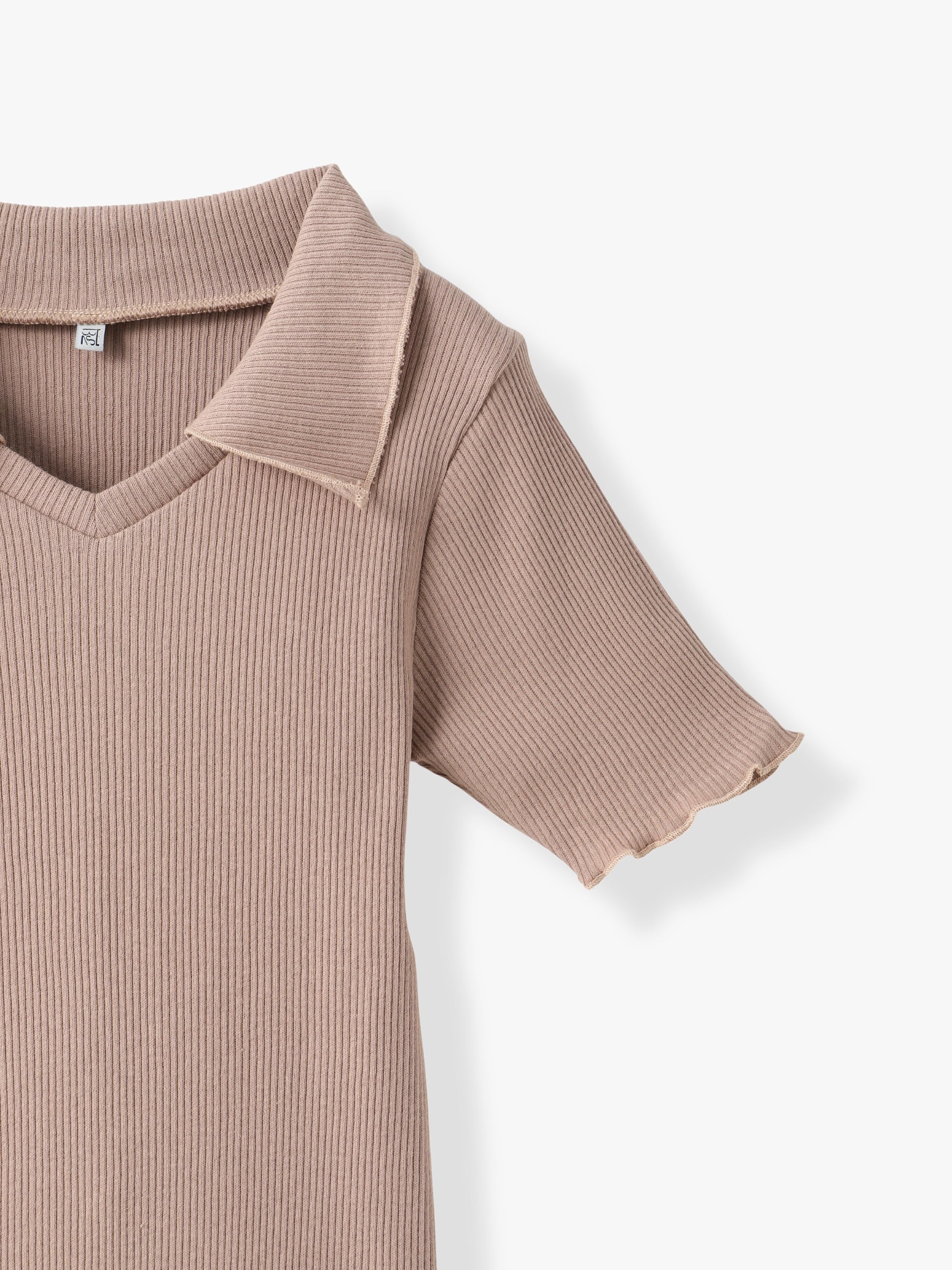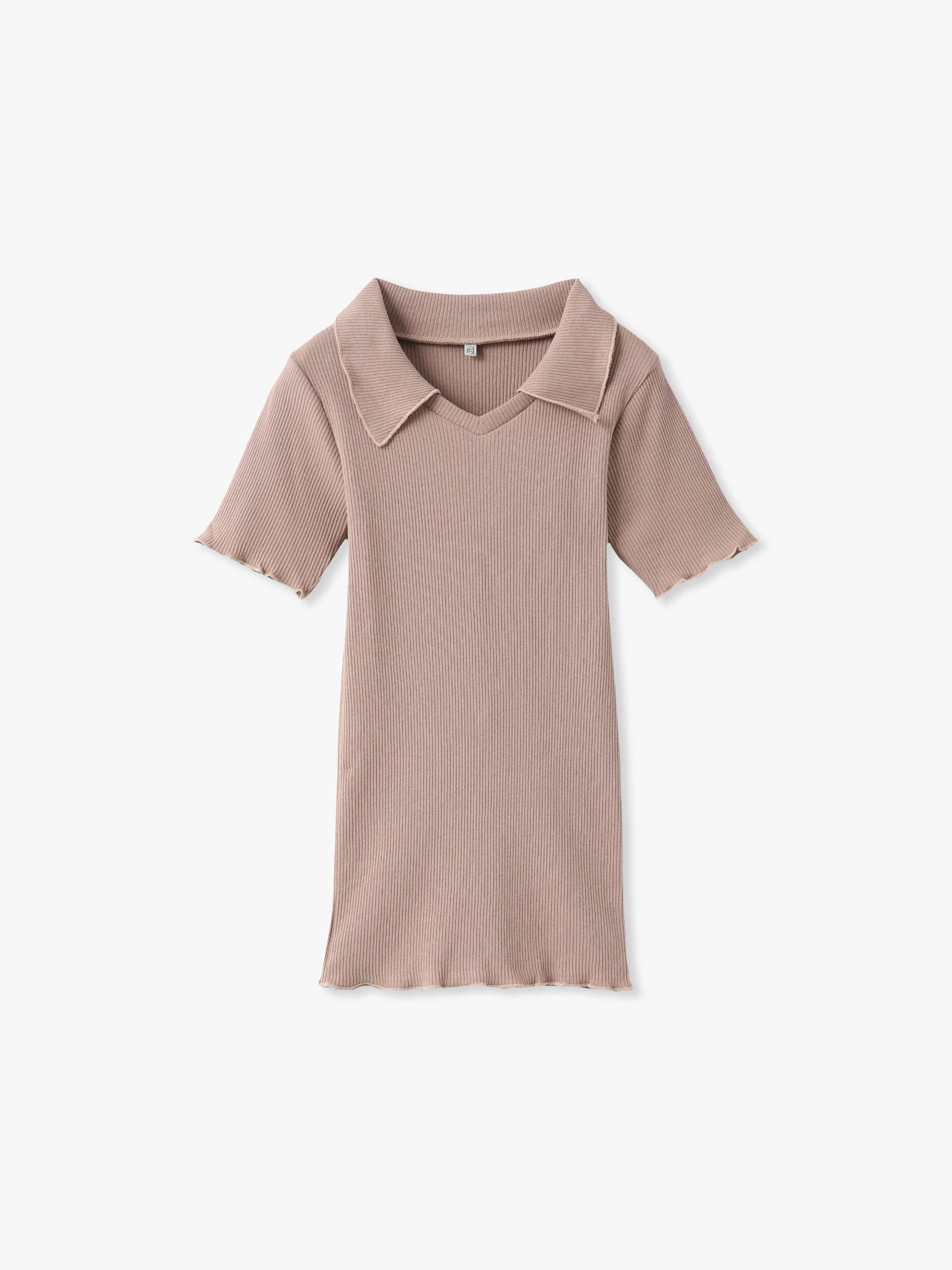 コットン製のVネックリブトップは、ボリュームのあるボトムともバンスが取りやすいコンパクトなフィット感で、袖口や裾のメロー仕様が可憐な印象を醸します。