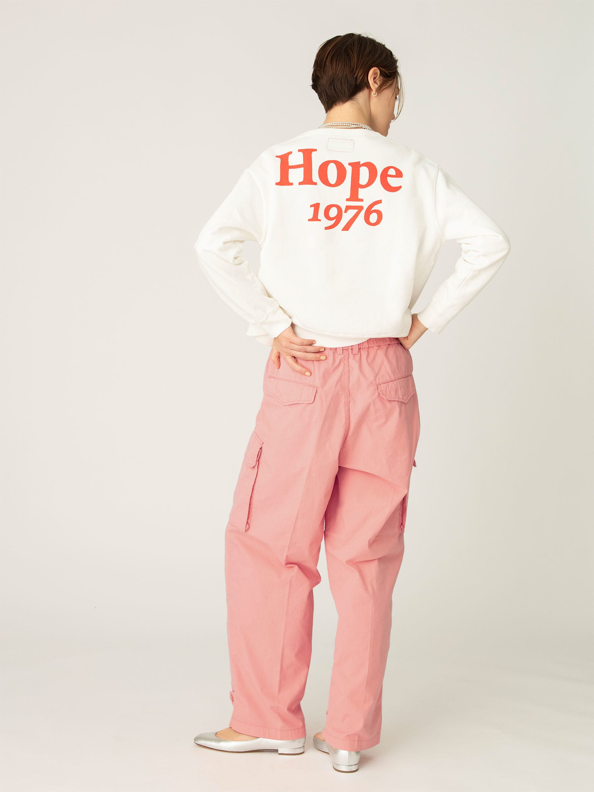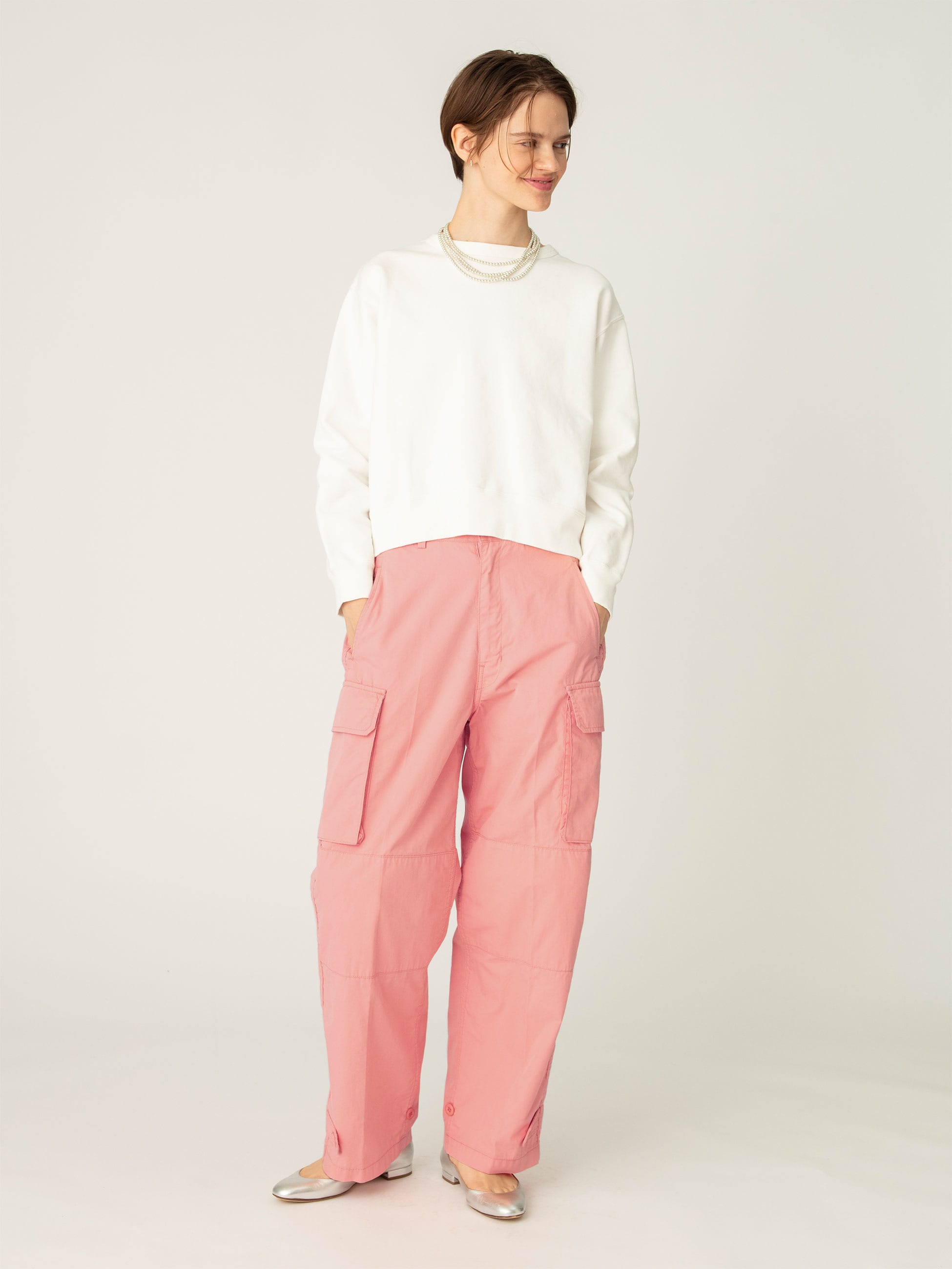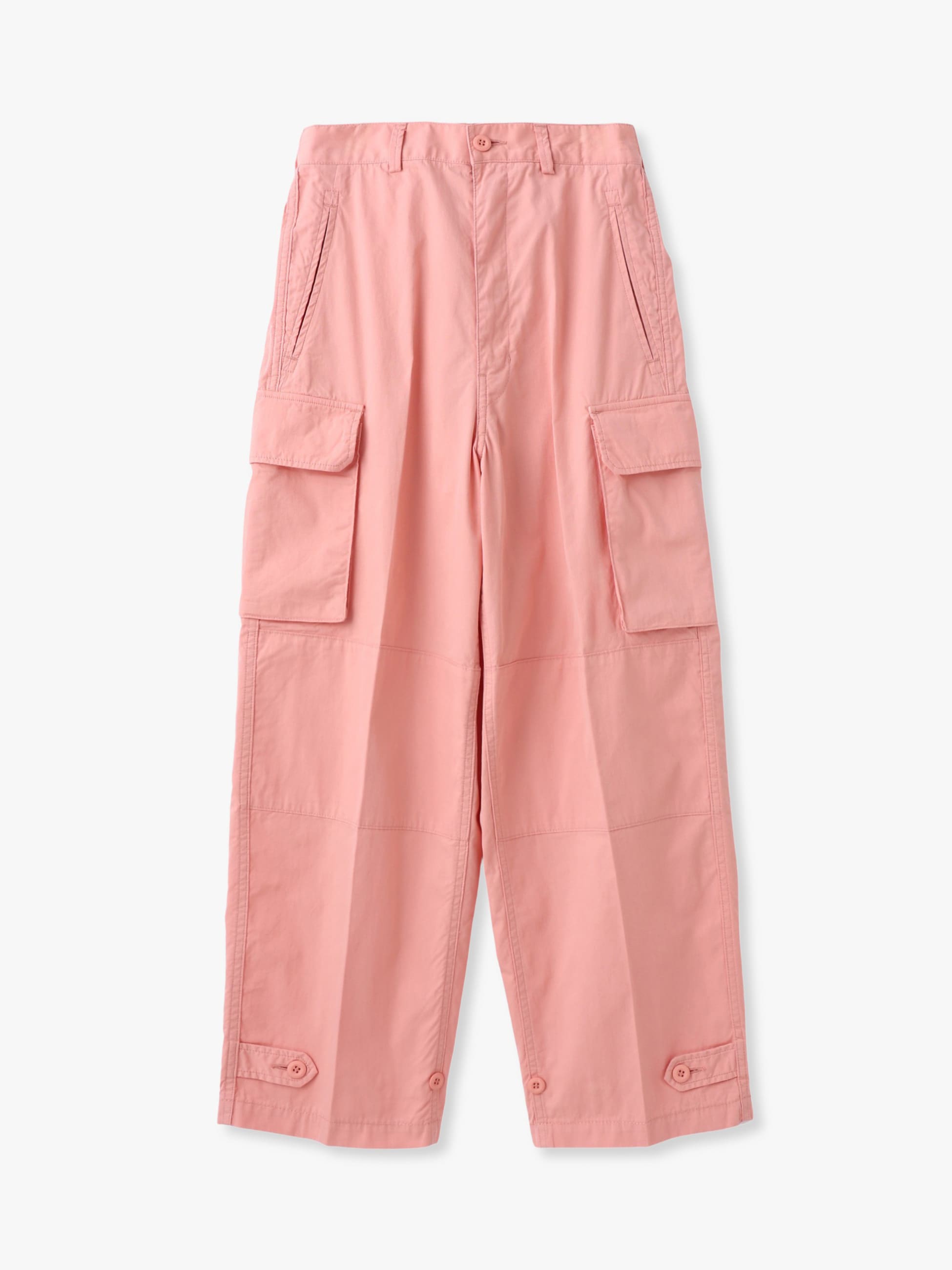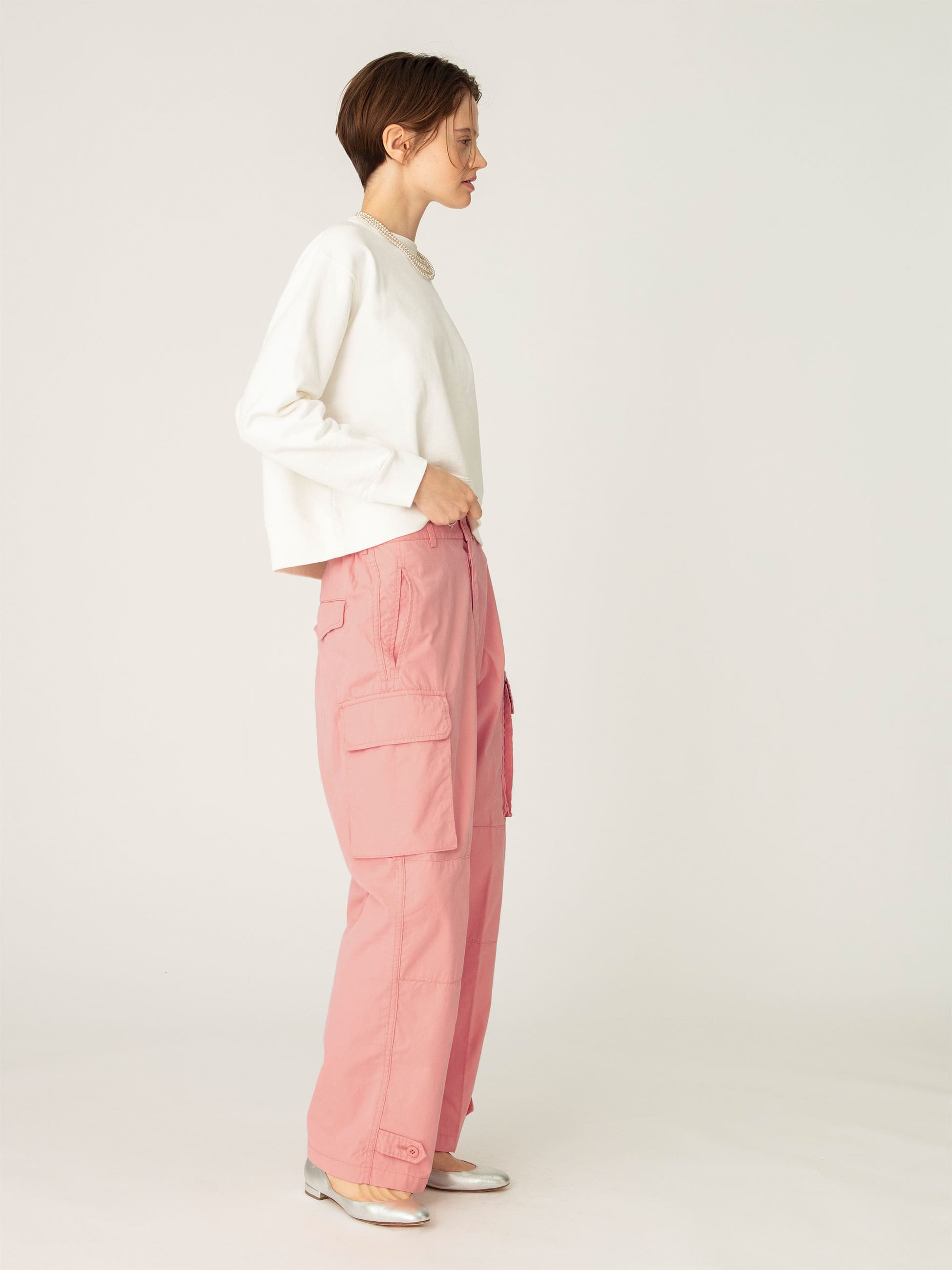 - フレンチミリタリーの名作であるM47から着想を得たカーゴパンツをロンハーマンで別注しました。素材には、タテ糸にインド産オーガニックコットン、ヨコ糸にリサイクルナイロンを使用した高密度ウェザーを採用し、起毛加工にワンウォッシュを加えることでビンテージ感を表現しています。ディテールや機能性はそのままに、女性らしいシルエットで、こだわりの詰まった1着です。