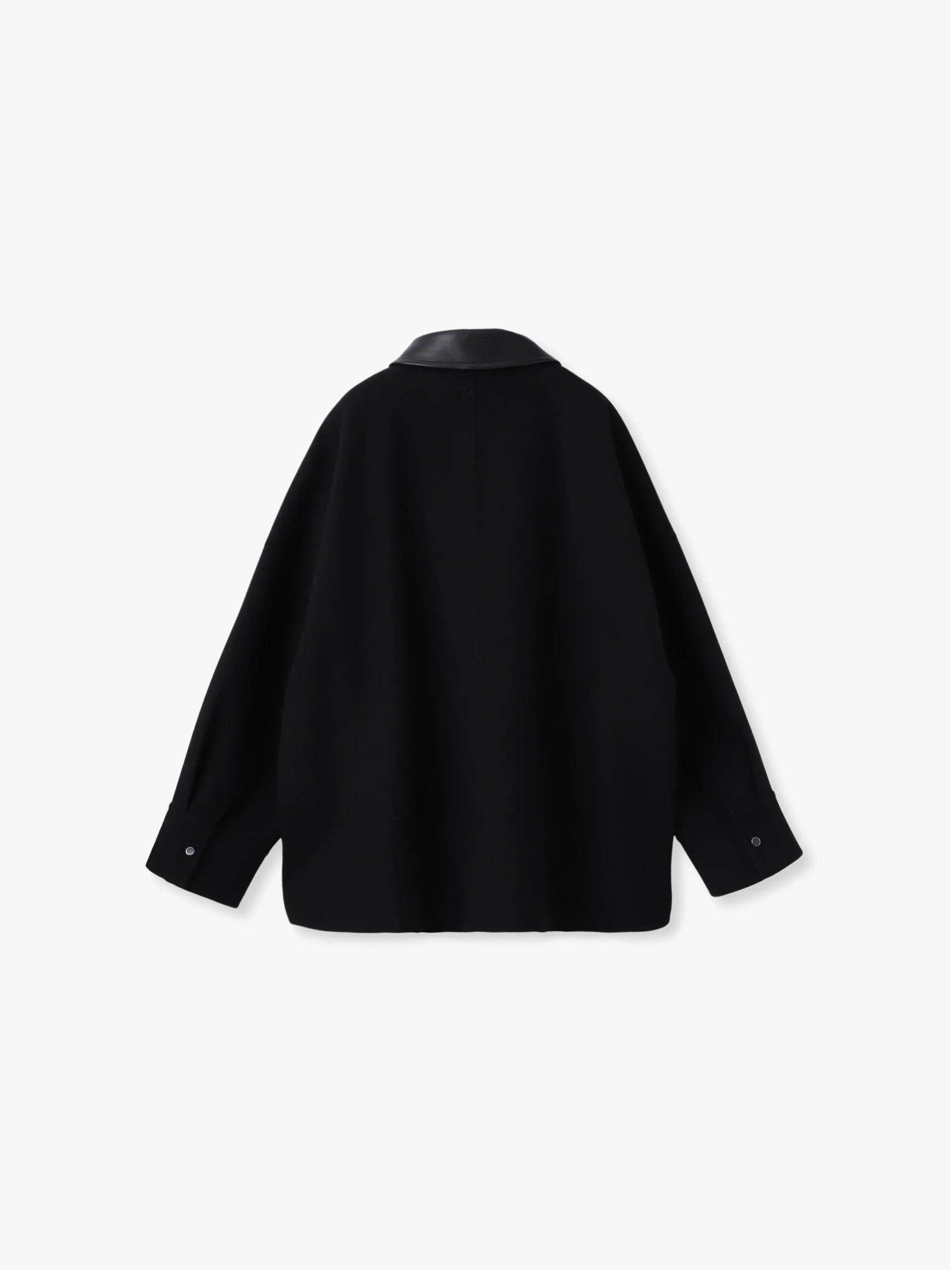 取り外しが可能なレザーの襟がついたシャツ型のショートジャケットは、上質なジロンラムウールを使用し、丁寧にメルトン仕上げを施すことでカシミアのような上品な光沢感と滑らかさを実現しています。マニッシュなディテールを取り入れながらも、ドロップショルダーのゆとりのあるパターンとサイドスリットが女性らしい雰囲気を醸し、ebureらしい洗練された一着に仕上がっています。