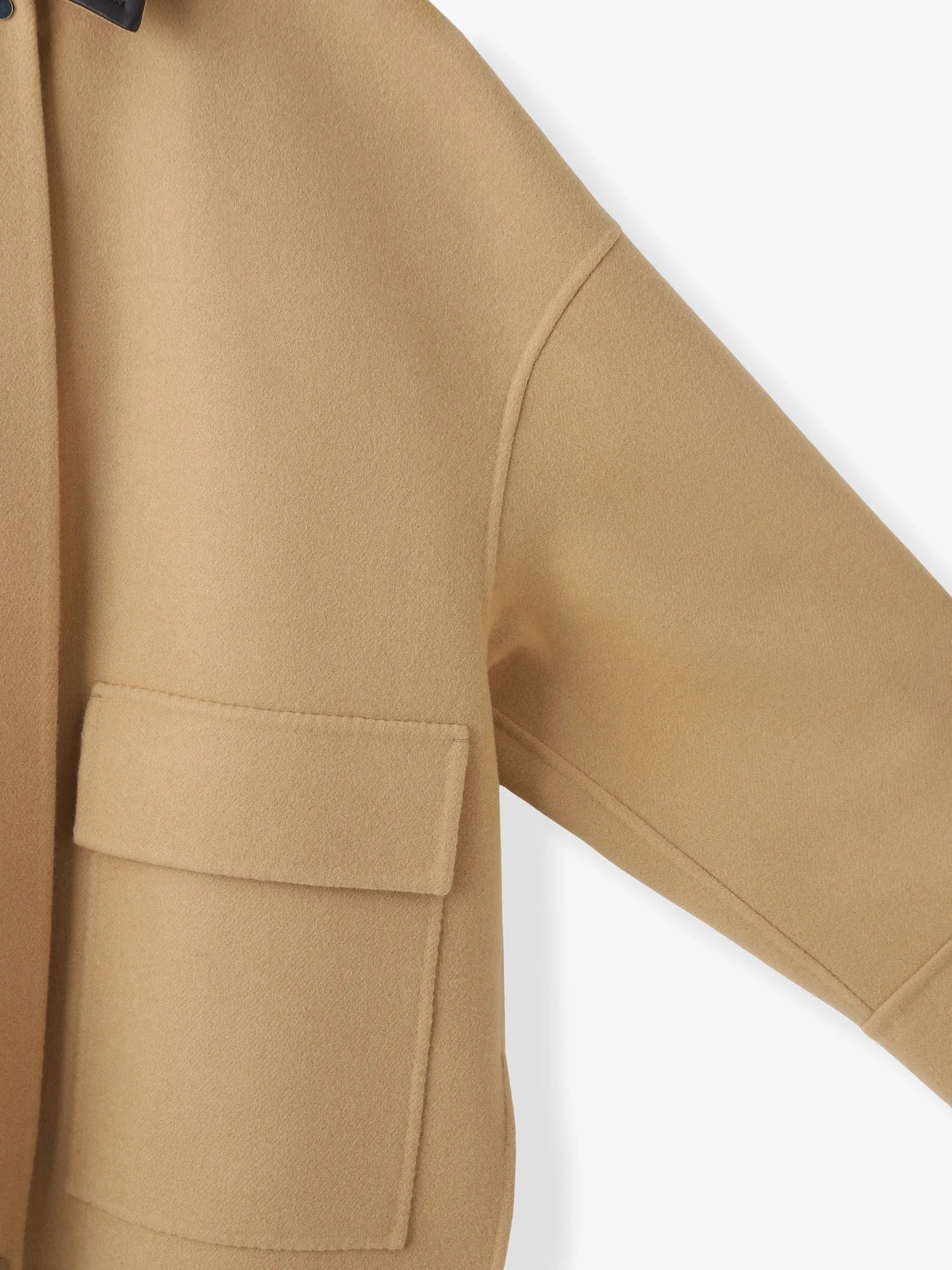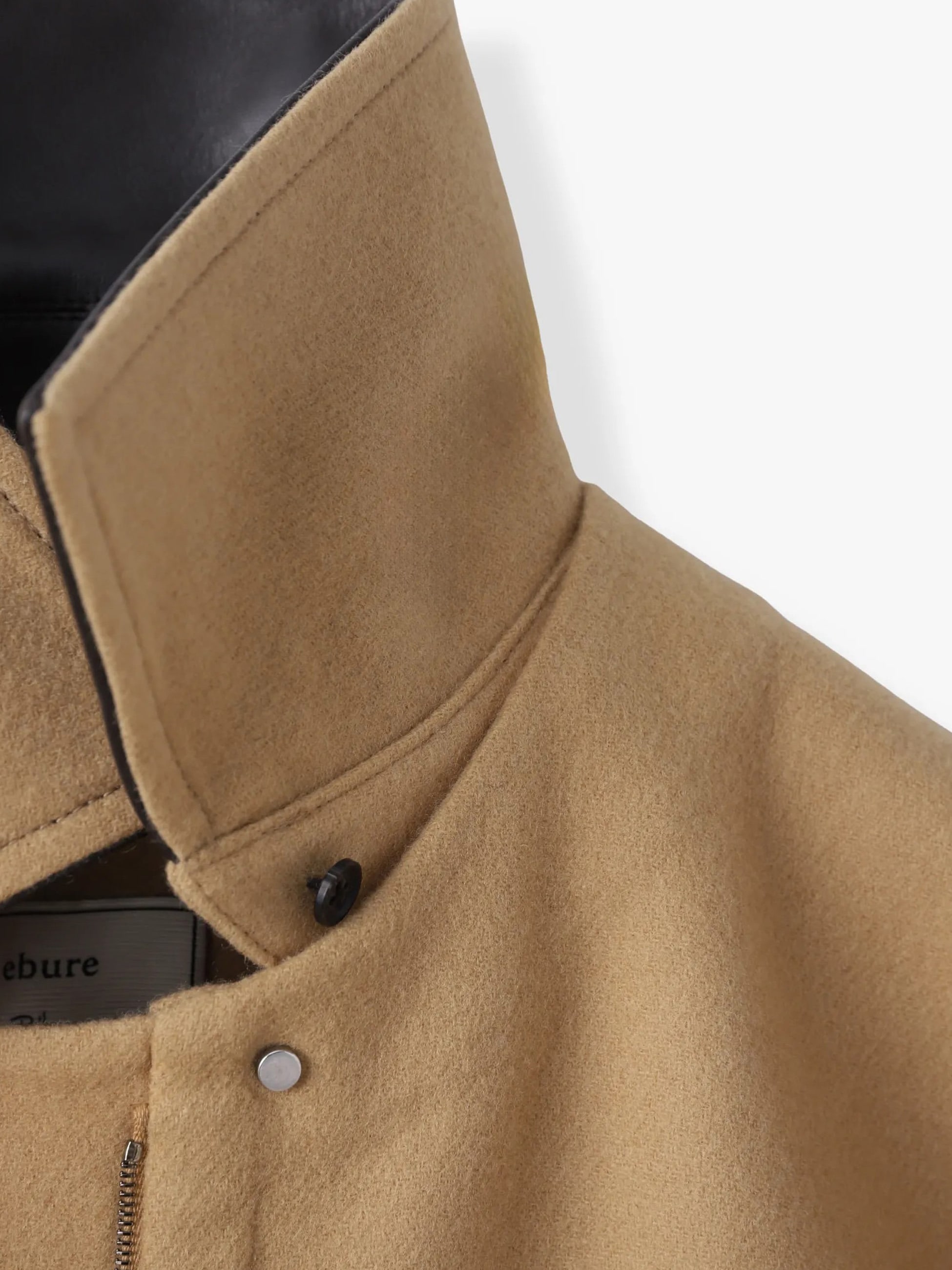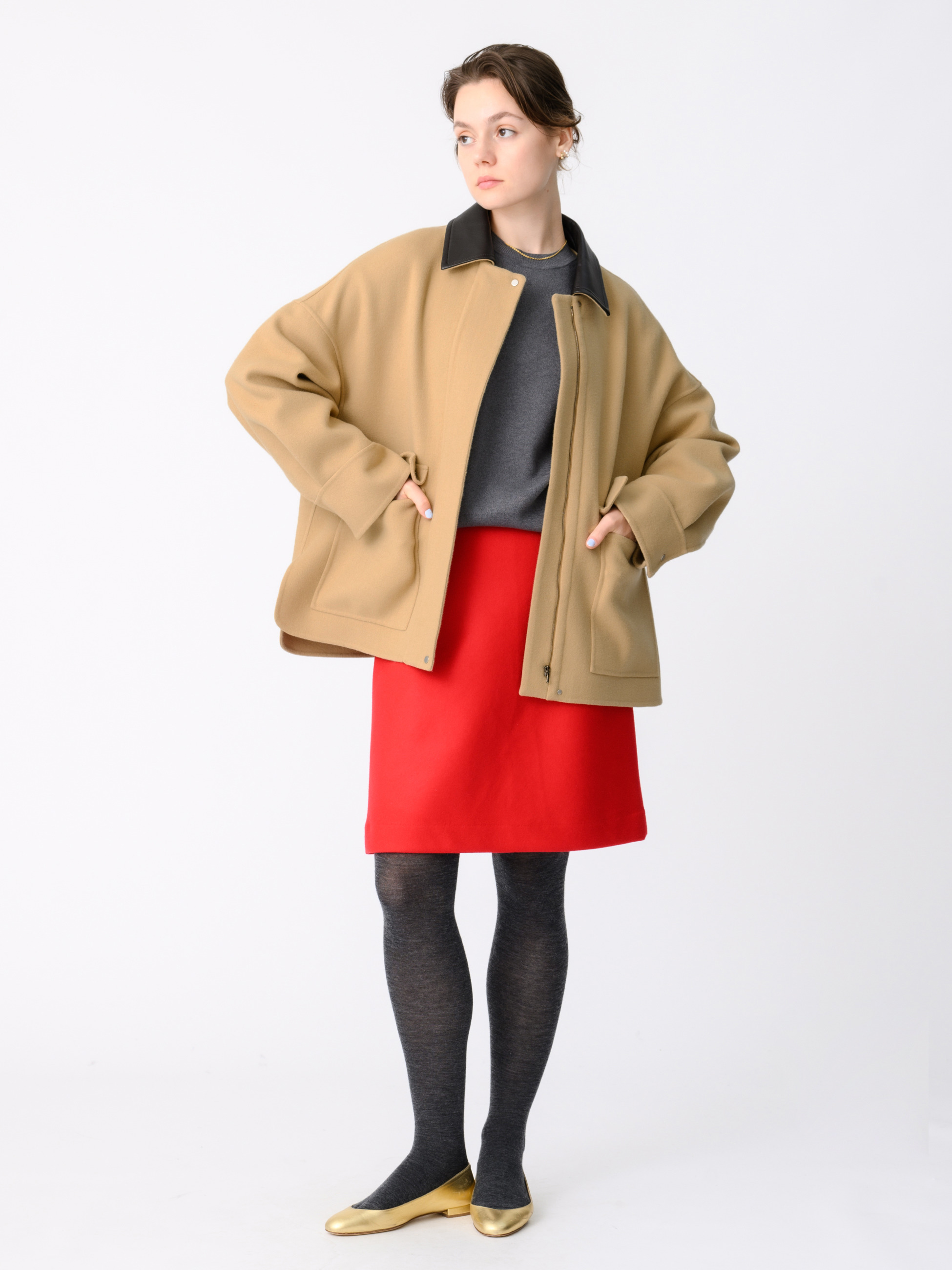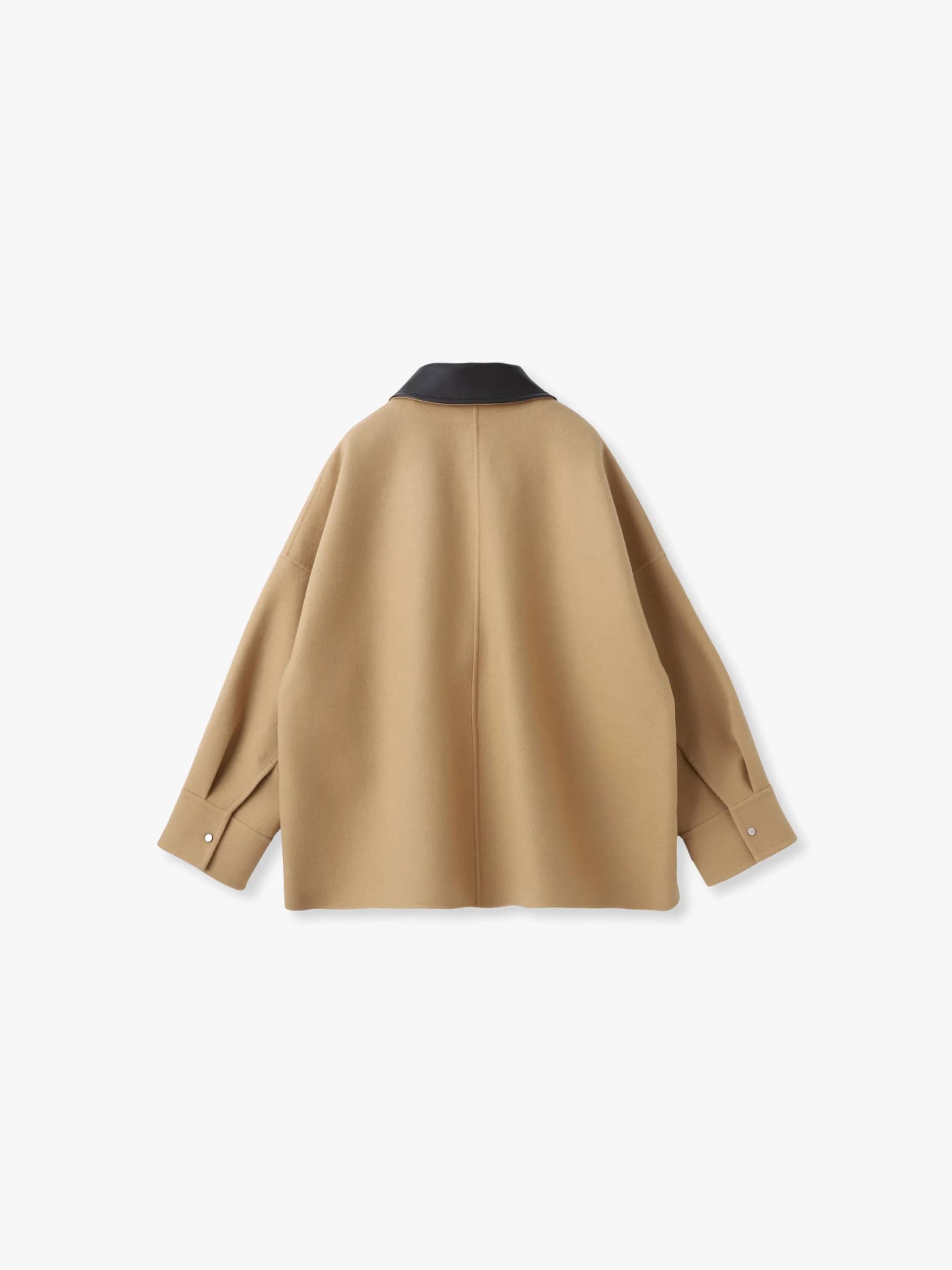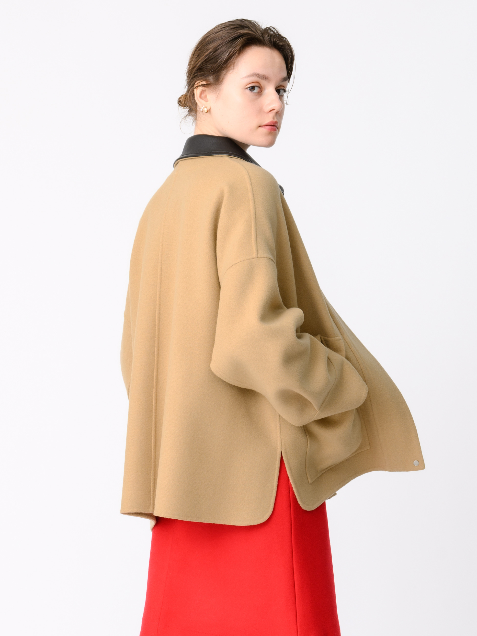 取り外しが可能なレザーの襟がついたシャツ型のショートジャケットは、カバーオールのような雰囲気が出るようベージュでカラー別注しました。上質なジロンラムウールを使用し、丁寧にメルトン仕上げを施すことでカシミアのような上品な光沢感と滑らかさが実現。マニッシュなディテールを取り入れながらも、ドロップショルダーのゆとりのあるパターンとサイドスリットが女性らしい雰囲気を醸し、ebureらしい洗練された一着に仕上がっています。