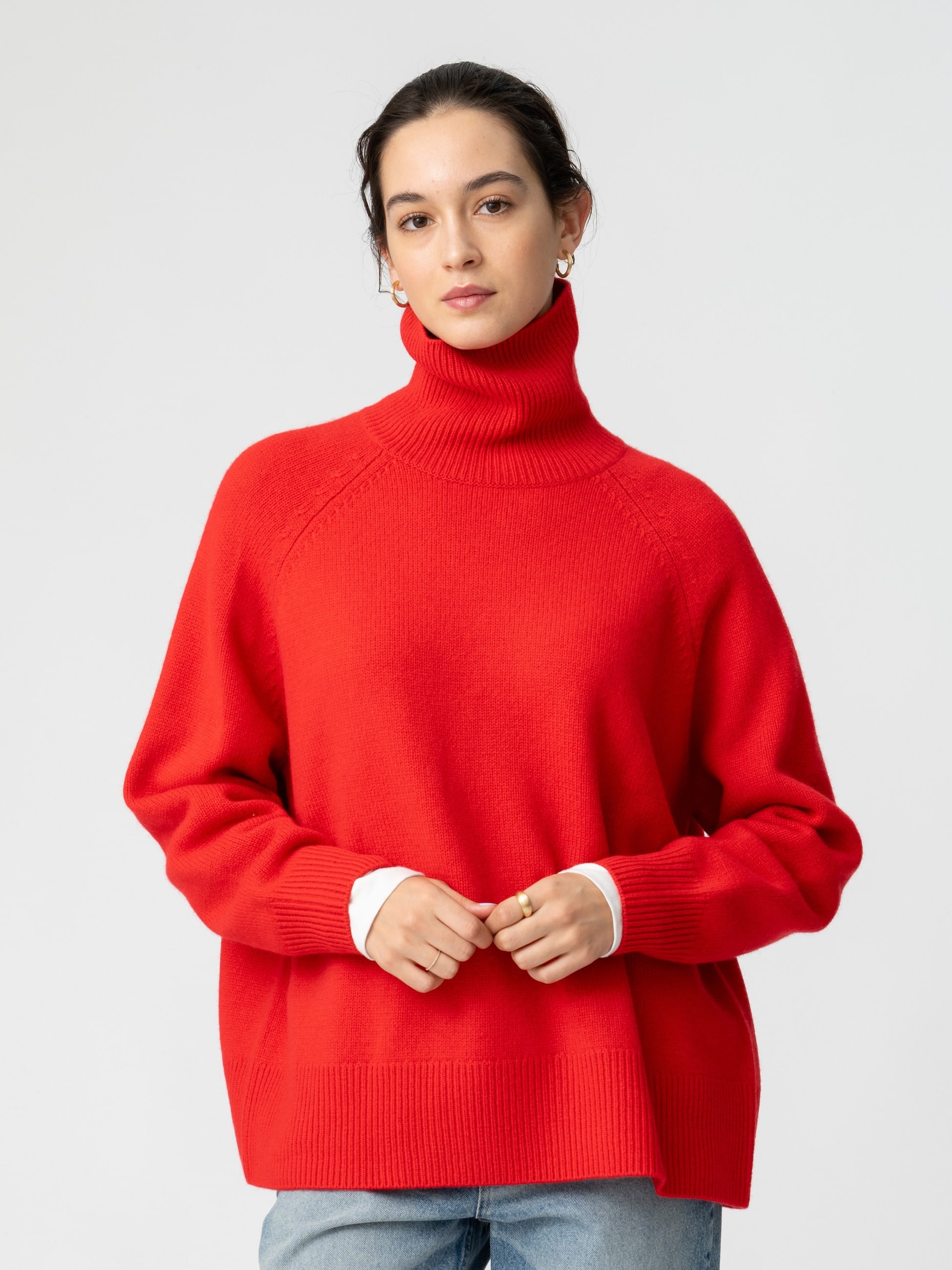 上質なウールの膨らみと、カシミアのふんわりとした風合いを感じるタートルネックニットトップスを、鮮やかなレッドでカラー別注しました。極細のエクストラスーパーファインラムウールとカシミアのブレンド紡毛糸を使用し、毛羽立ちや型崩れも少なく長く愛用していただけます。ボトムスを選ばずバランスよくきまるサイジングで、コートやジャケットのインナーとしても重宝し、スタイリングの差し色としてもぴったりです。同シリーズのクルーネックプルオーバーもございます。