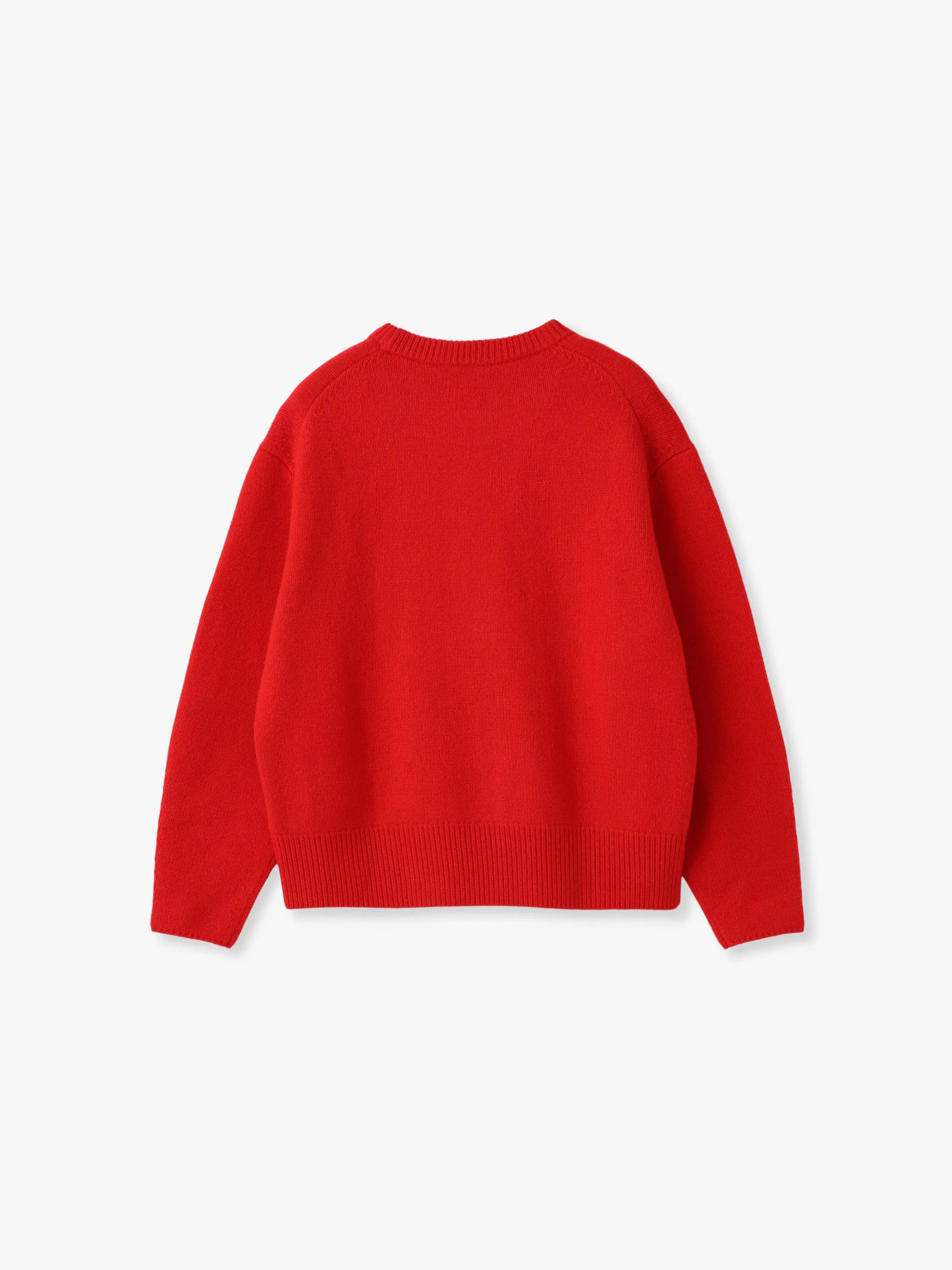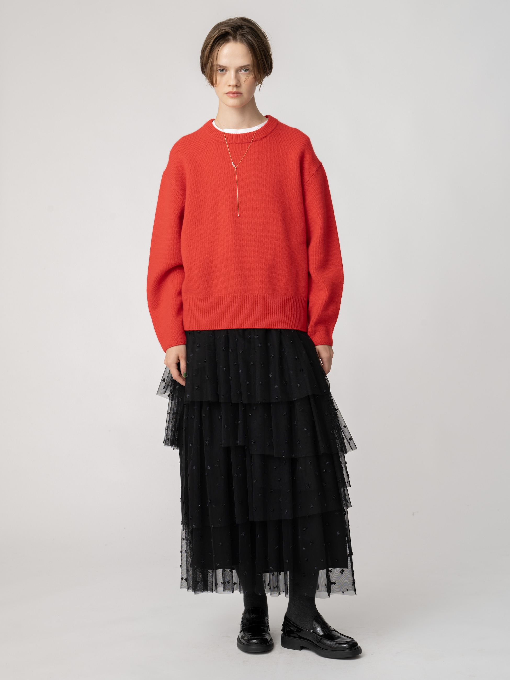 上質なウールの膨らみと、カシミアのふんわりとした風合いを感じるクルーネックニットトップスを、鮮やかなレッドでカラー別注しました。極細のエクストラスーパーファインラムウールとカシミアのブレンド紡毛糸を使用し、毛羽立ちや型崩れも少なく長く愛用していただけます。ボトムスを選ばずバランスよくきまるサイジングで、コートやジャケットのインナーとしても重宝し、スタイリングの差し色としてもぴったりです。同シリーズのタートルネックニットもございます。