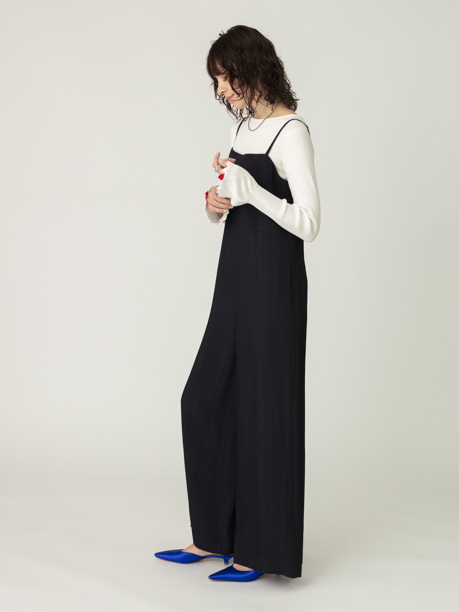 ビスコース100%のスラブ糸で仕立てたブッチャー素材のオールインワンは、弾力があり艶感のある生地が上品な印象で、シーズンレスに活躍します。サイドポケット付きで、機能性を兼ね備えているのも嬉しいポイント。パンツ部分はワイドなシルエットで体のラインを拾いにくくリラックス感のある着心地です。