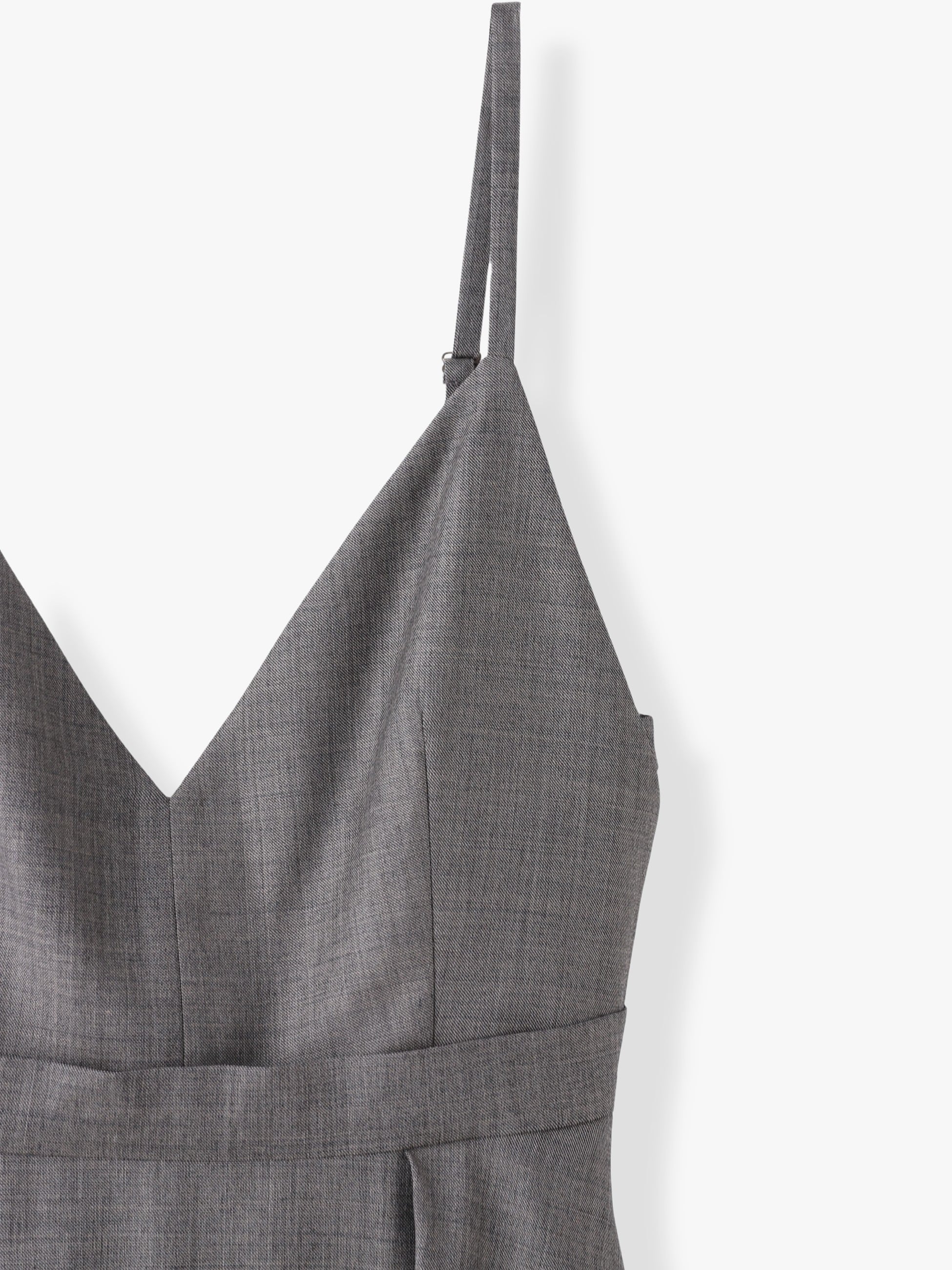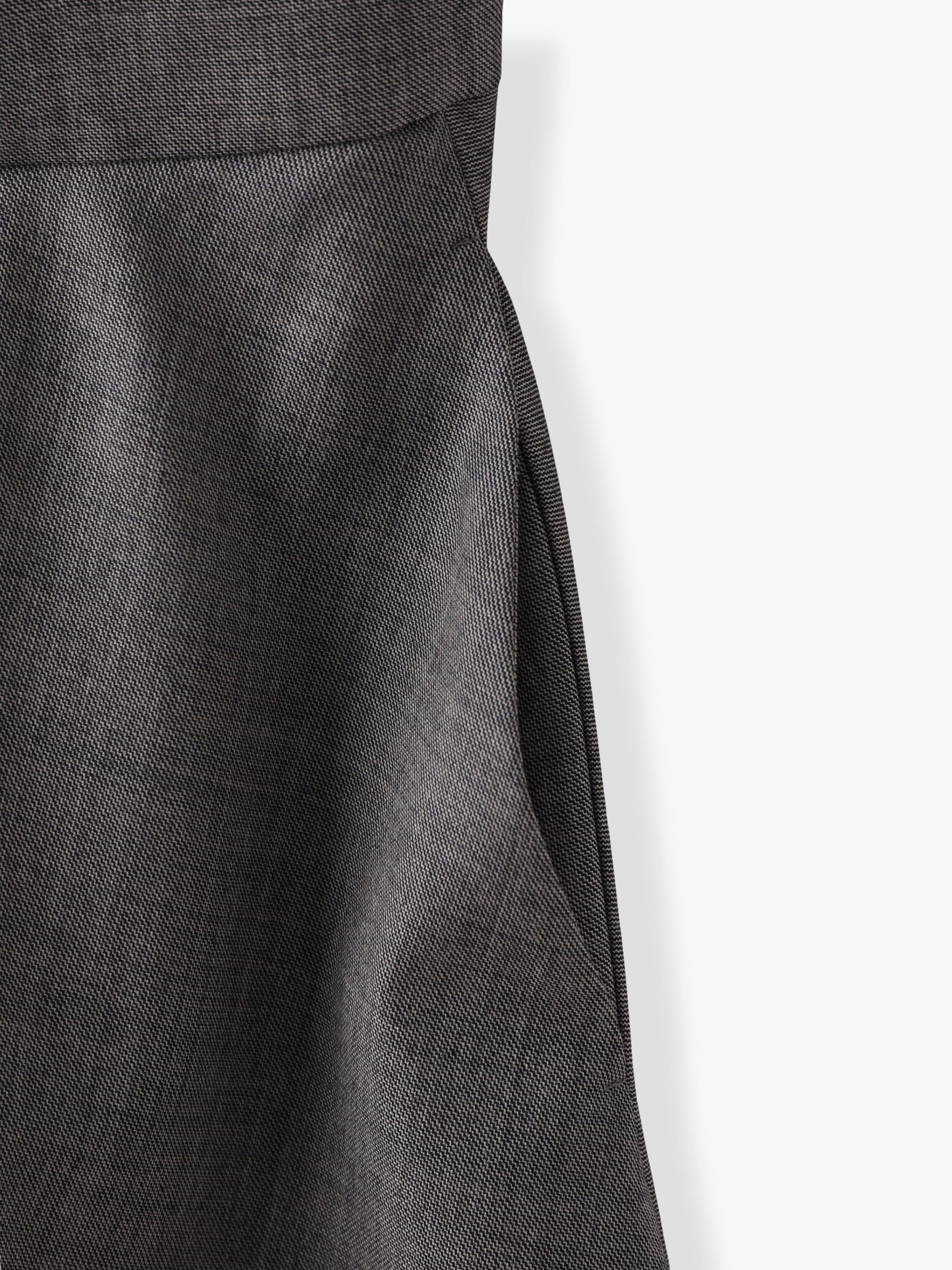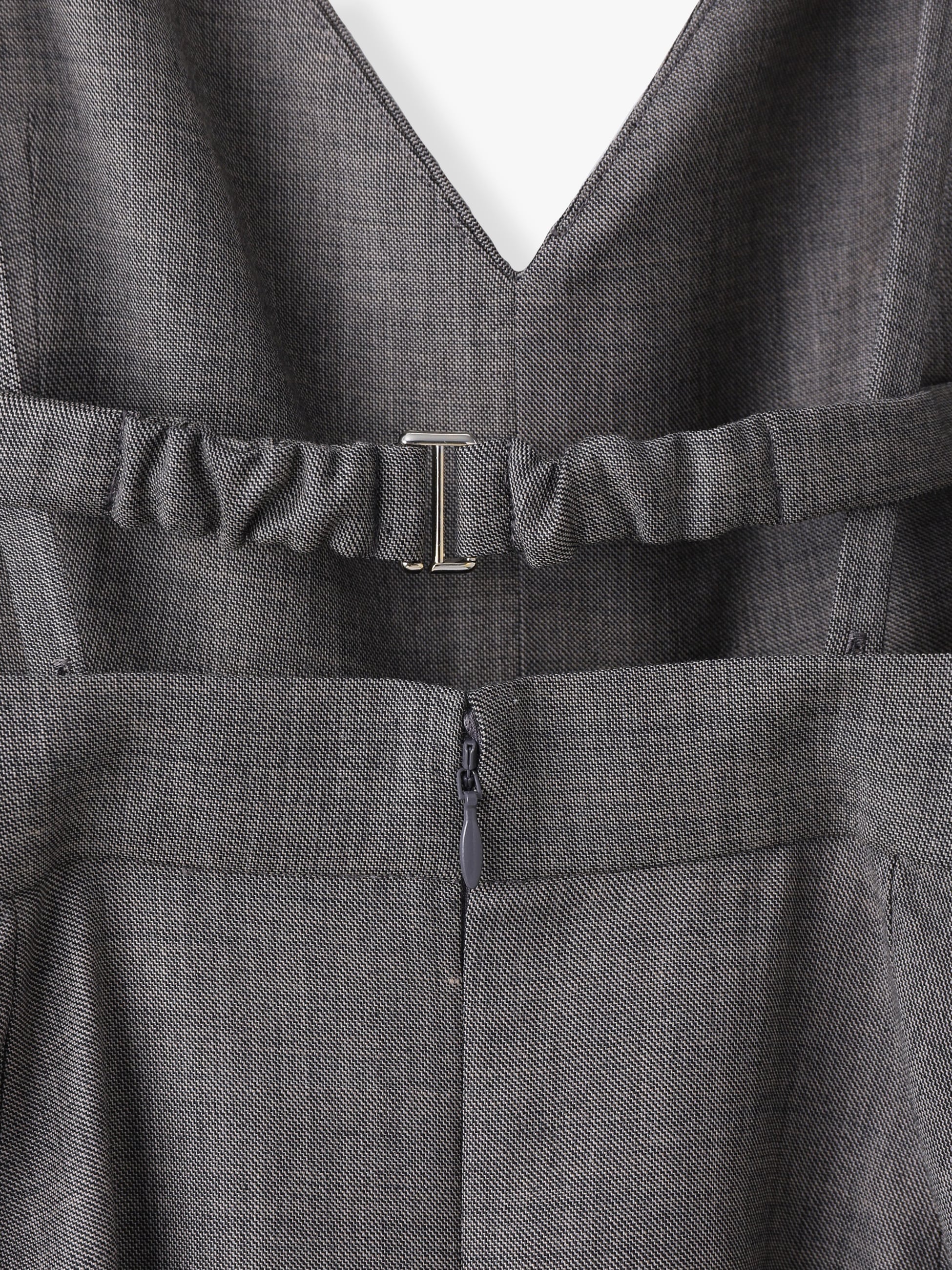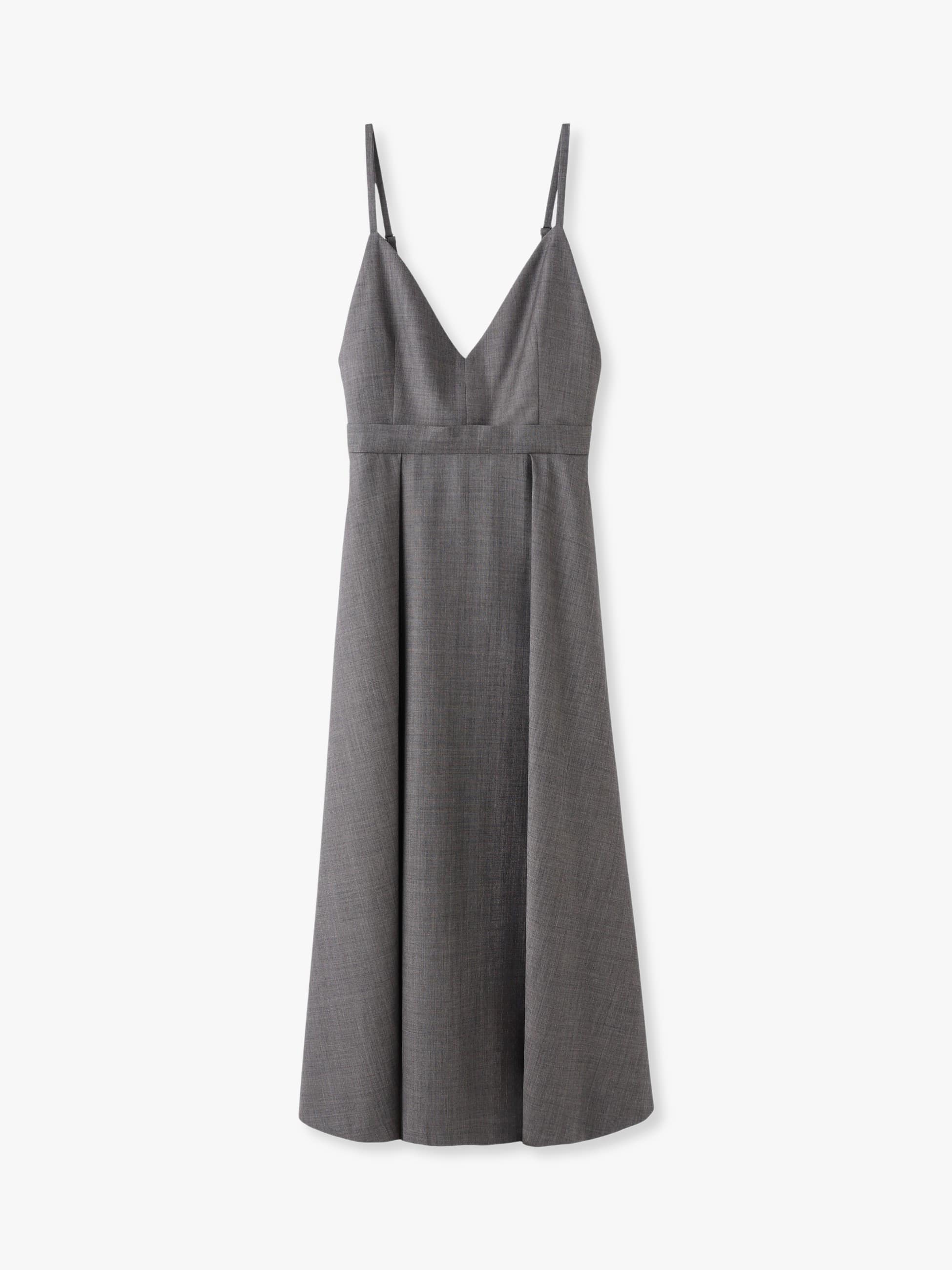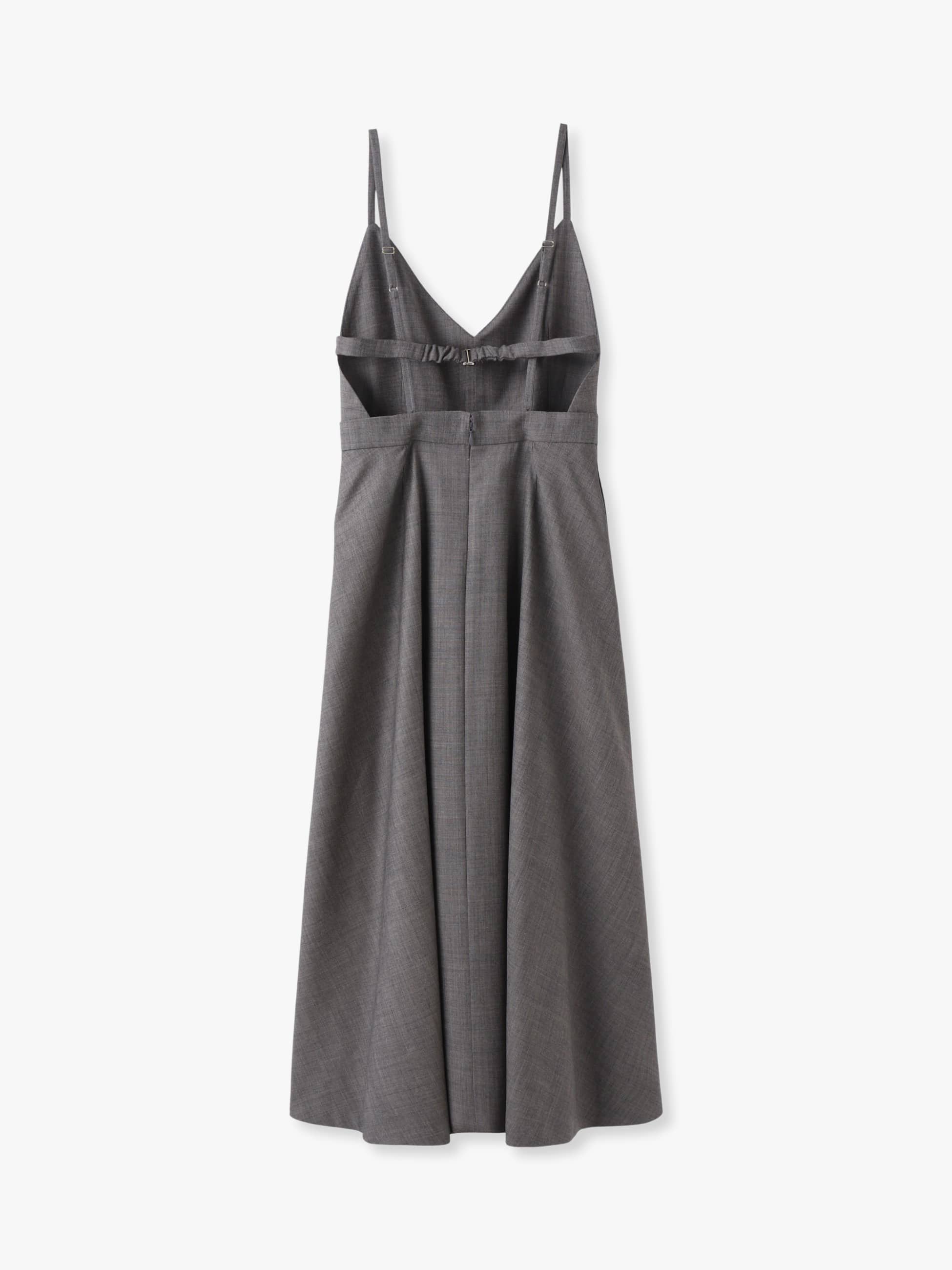 - キャミソール部分は取り外しができ、シンプルなフレアスカートとして2WAYで着用いただけけるジャンパースカートは、細番手のウールを使用した薄手のシャークスキンを使用し、シャンブレーの深みのある色合いで、毛羽の少ないきれいな表面感と上品な光沢感を引き立てます。キャミソール部分は後ろのランジェリーライクなディテールがデザインポイント。薄手のニットやTシャツ、タンクトップなど、インナーを変えると長いシーズンでお楽しみいただけます。