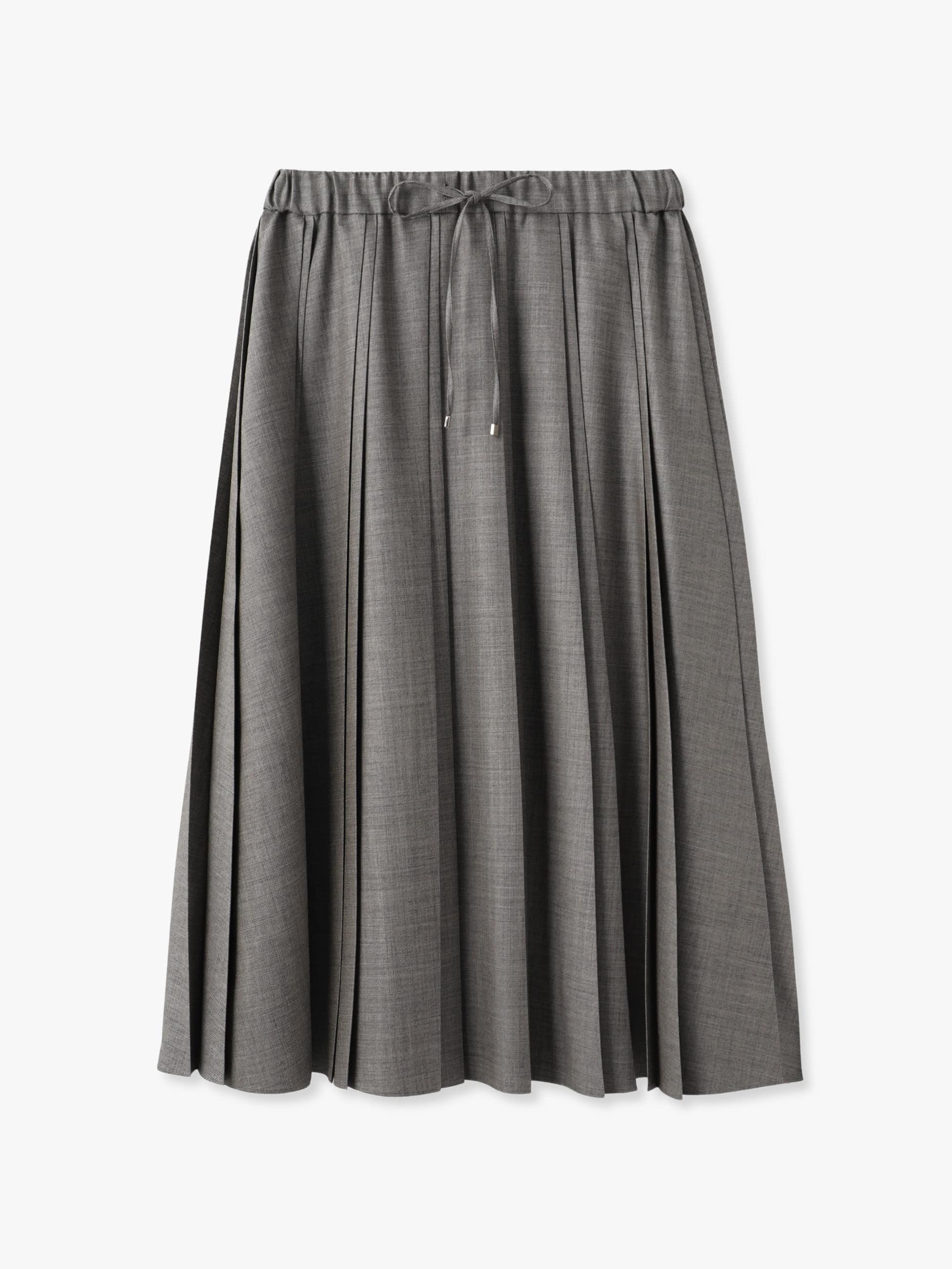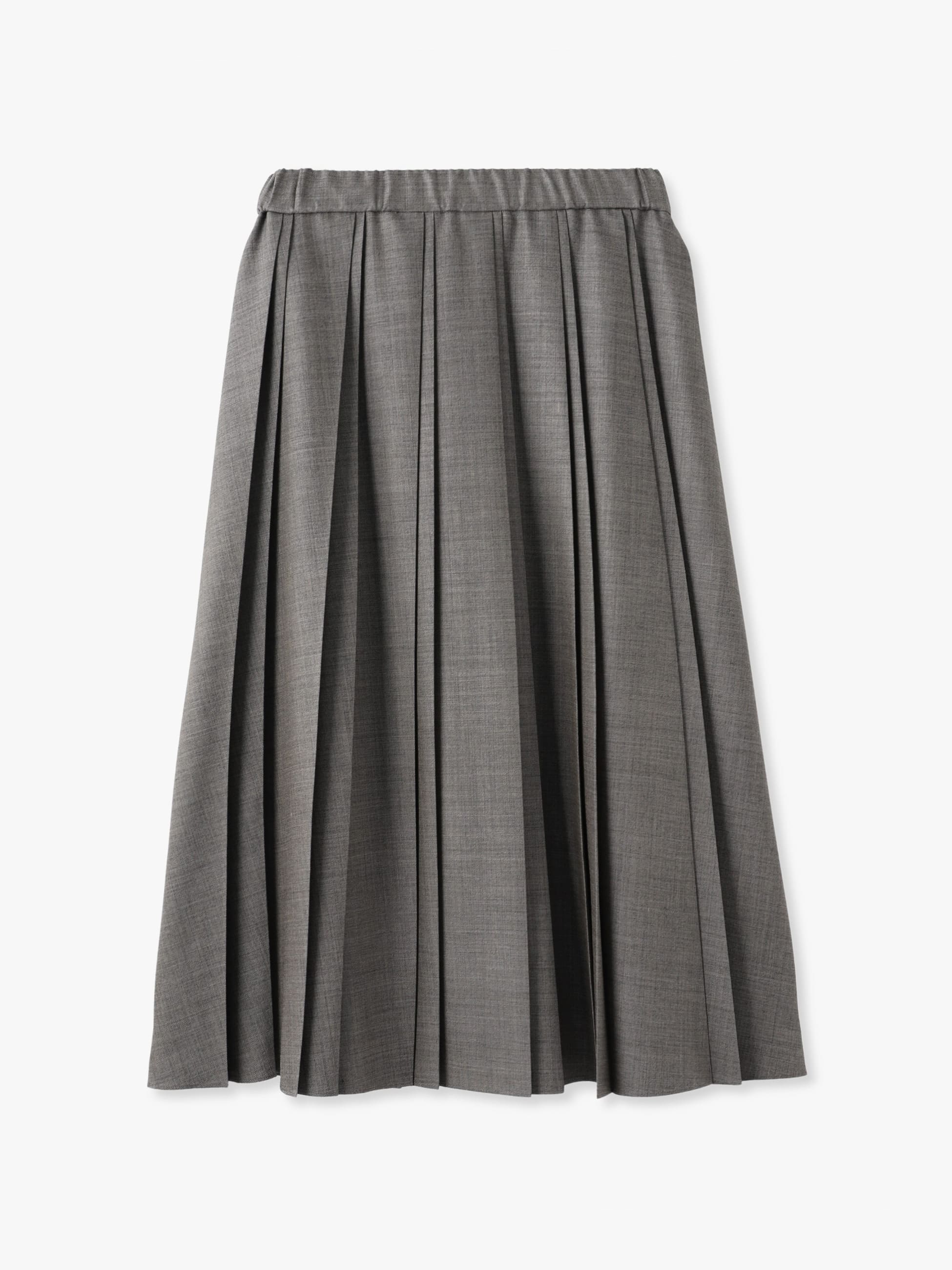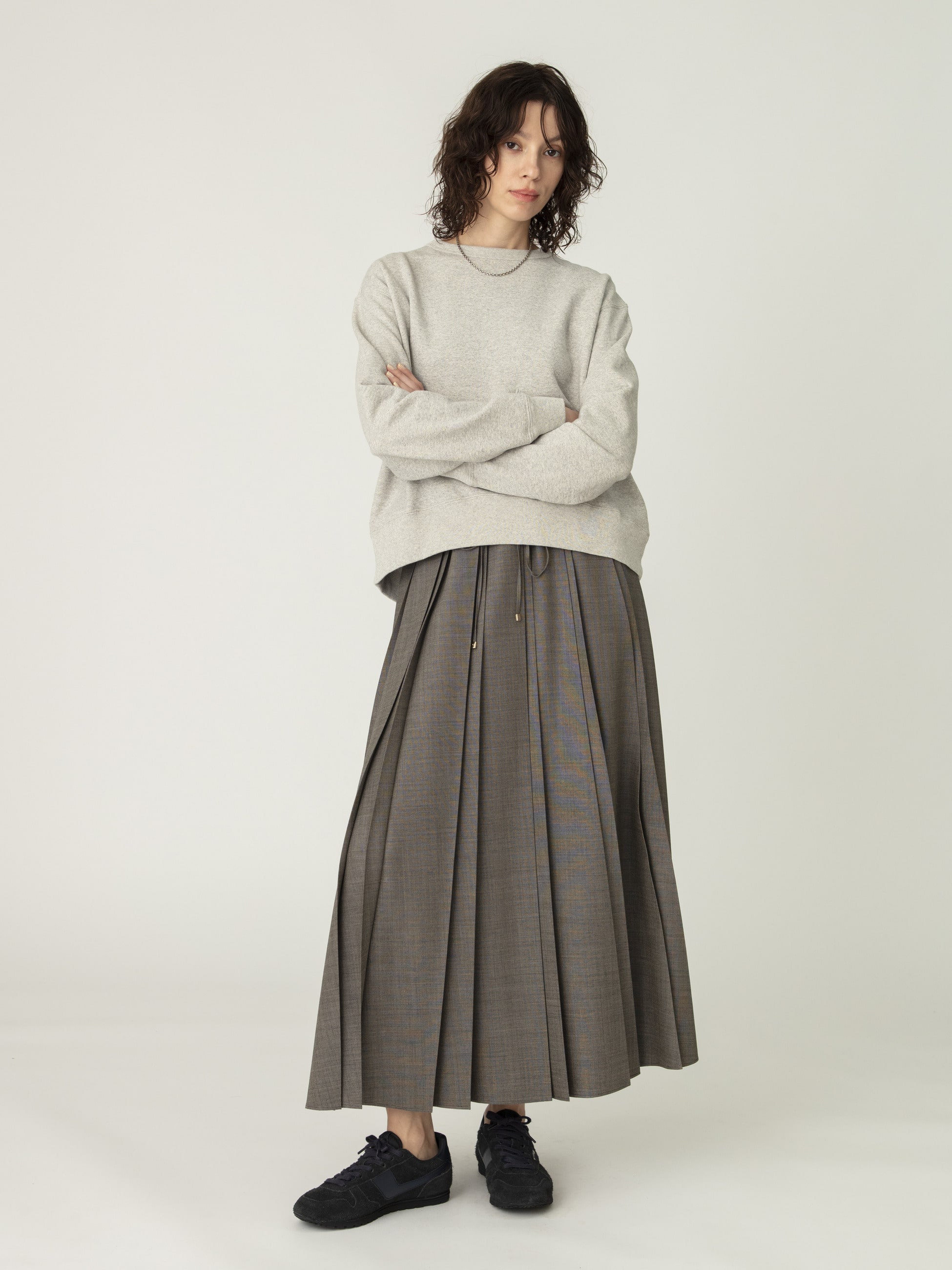 ebureオリジナルで型から仕立てたランダムプリーツのスカートは、細番手のウールを使用した薄手のシャークスキンを使用し、シャンブレーの深みのある色合いで、毛羽の少ないきれいな表面感と上品な光沢感を引き立てます。ウエストはイージーなゴム仕様なのも嬉しいポイントに。同素材のジャケットとのセットアップで、女性らしい洗練されたスタイルが完成します。