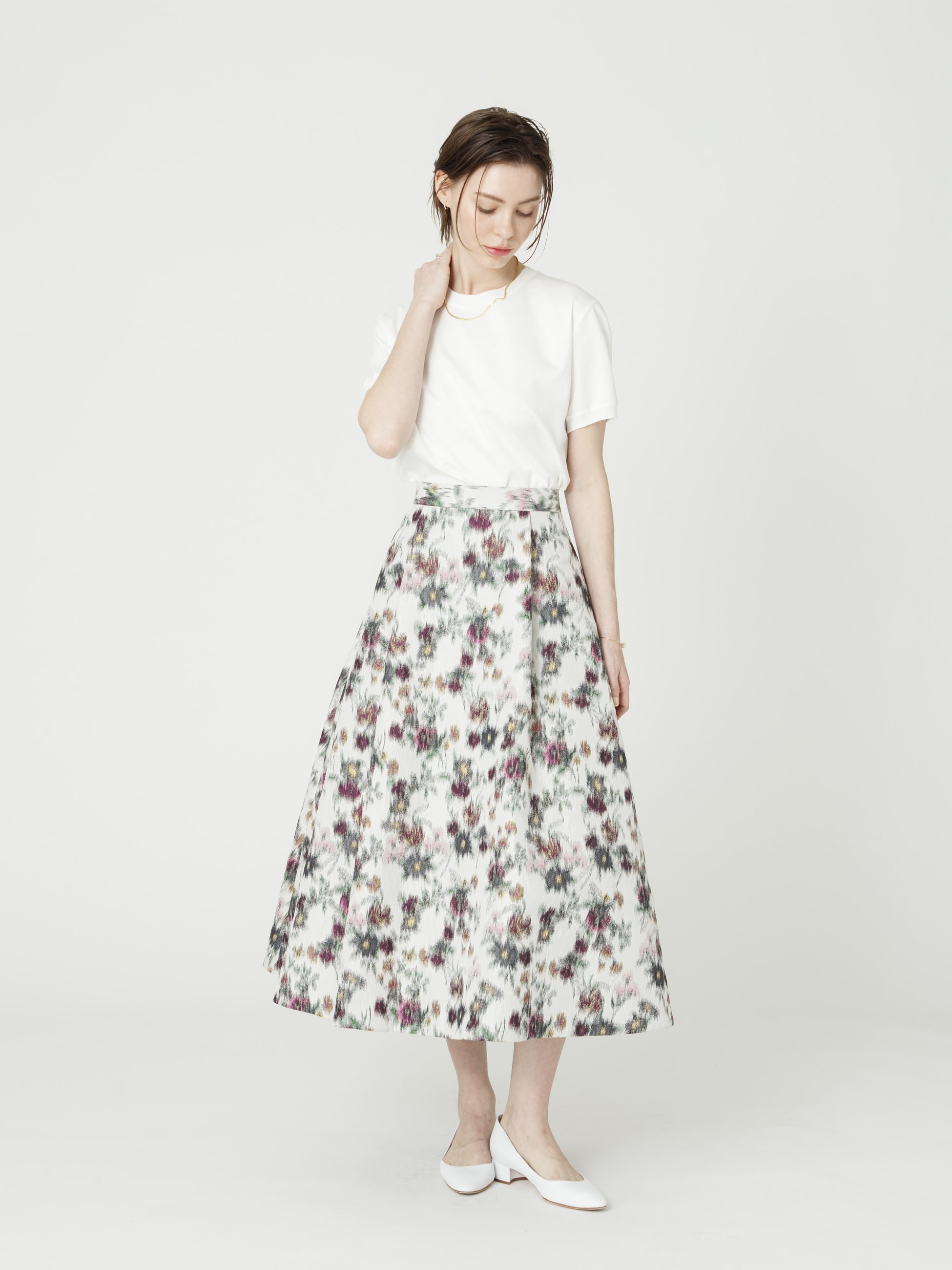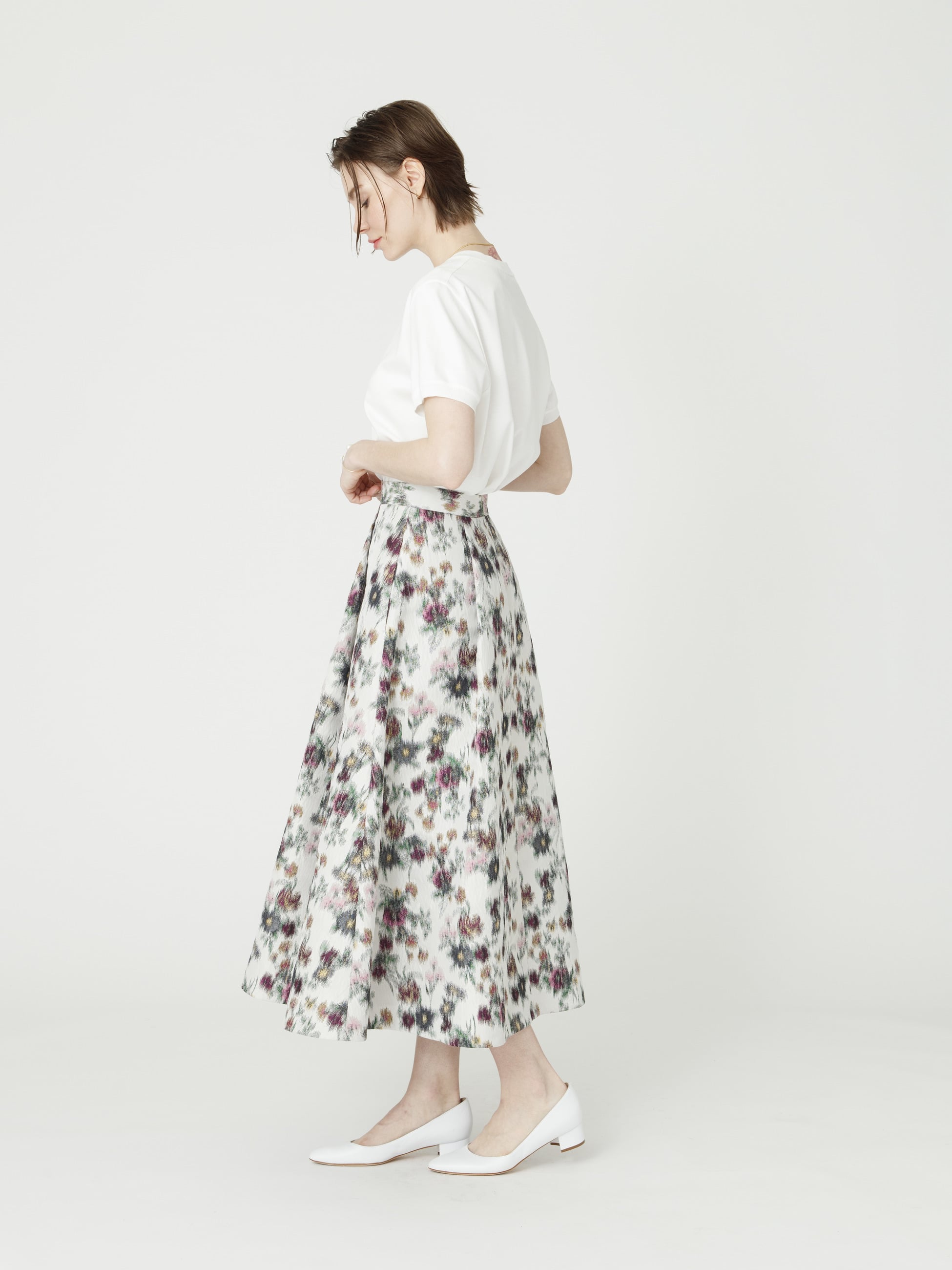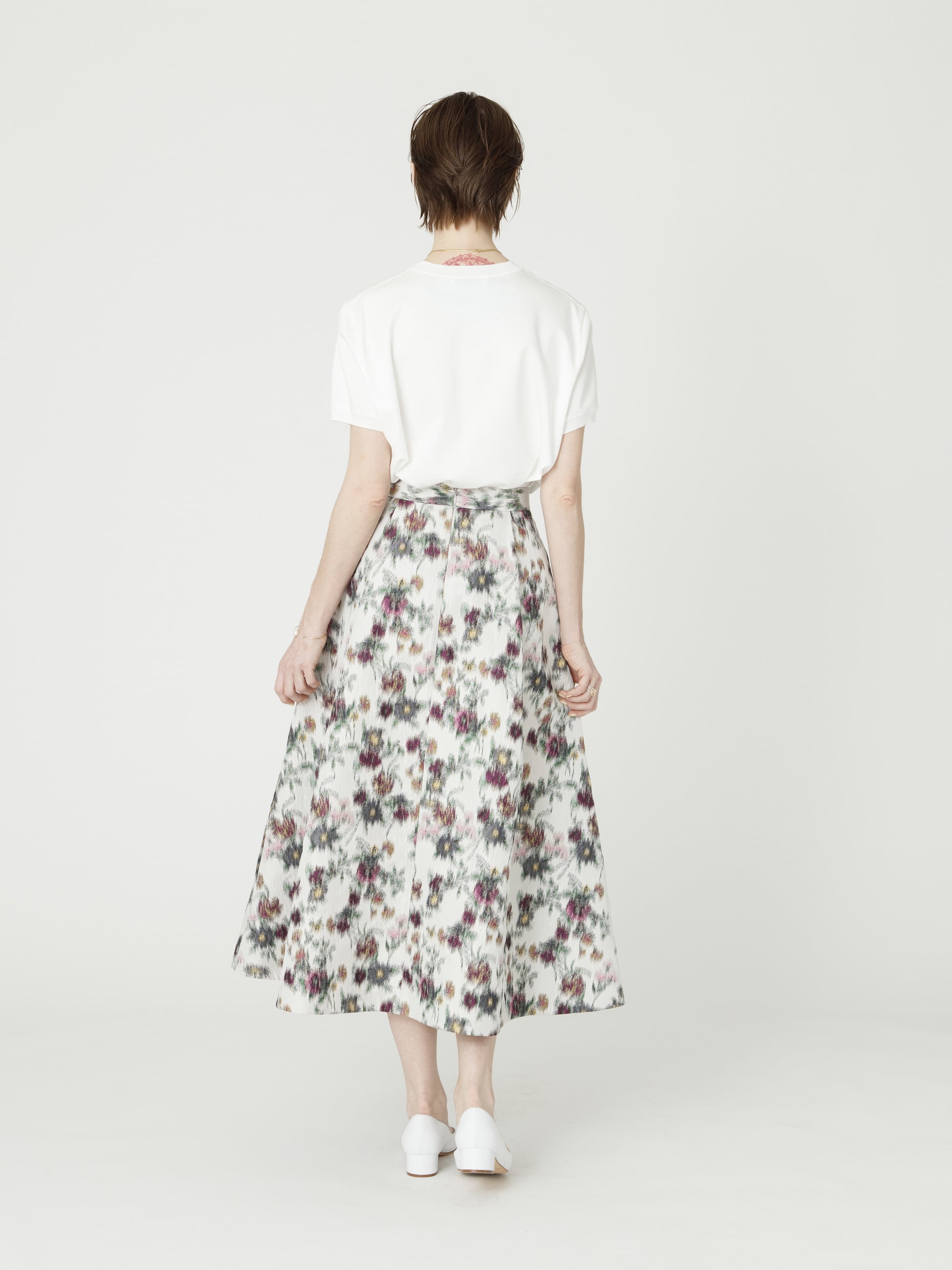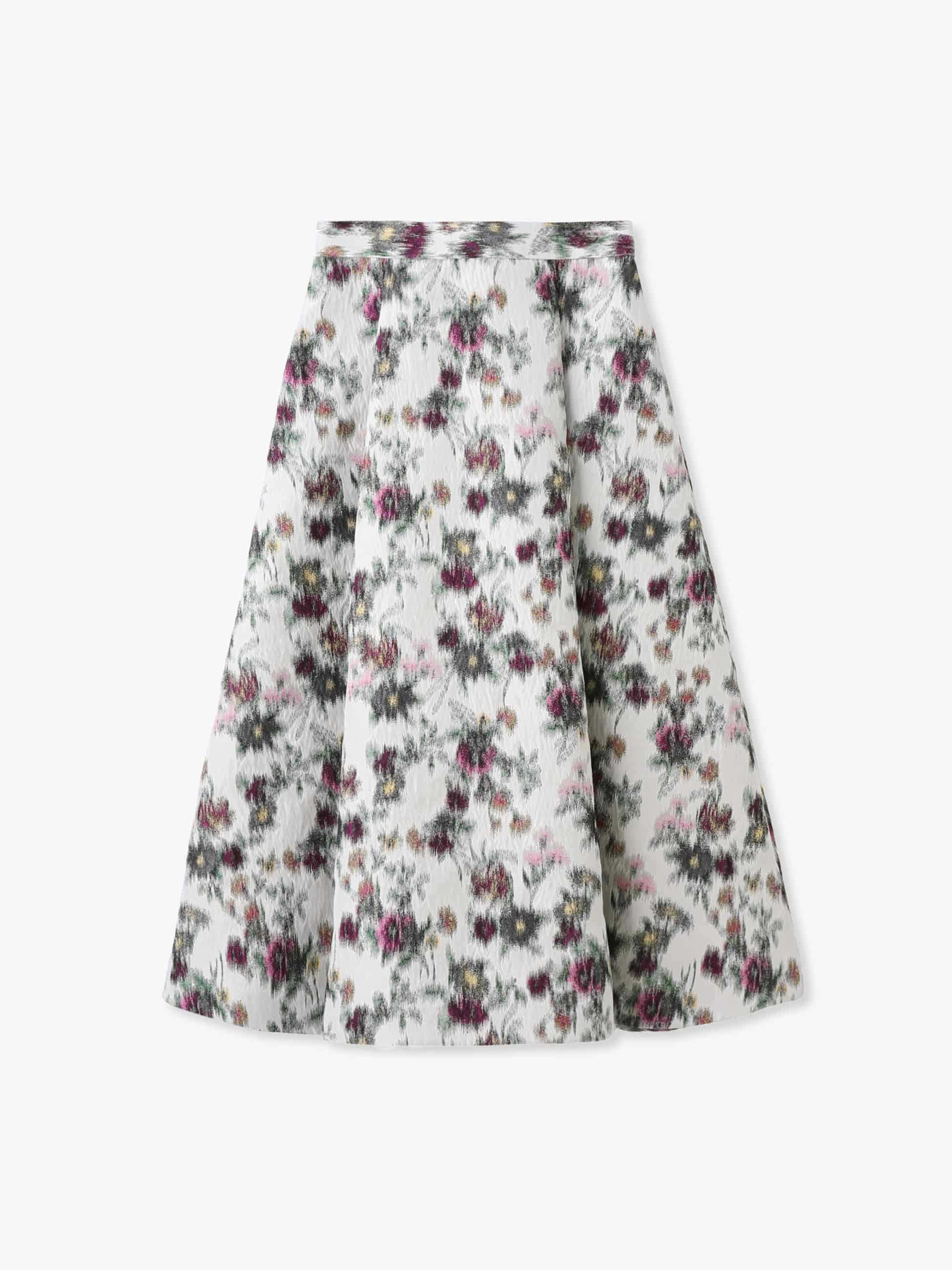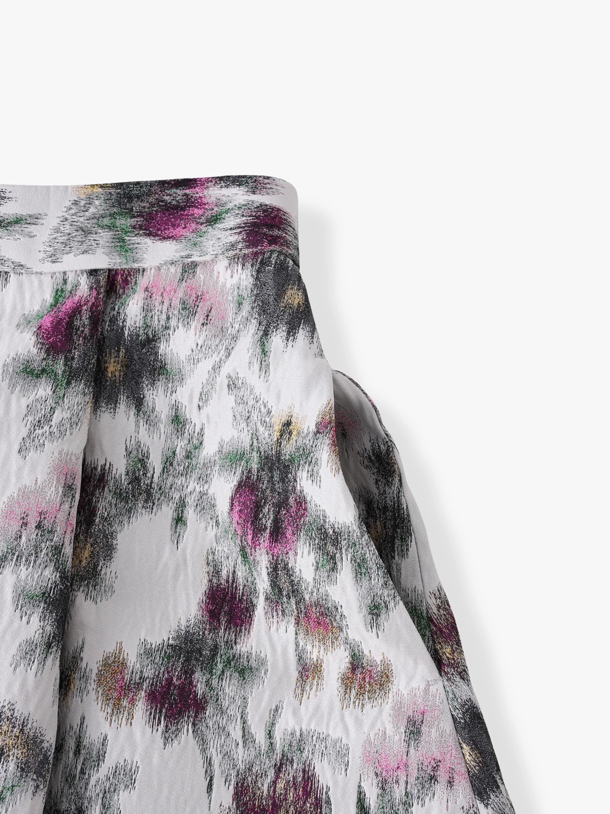 - 大胆な花柄が抜群の存在感を醸す、ジャカード生地のフレアスカートは、深めのタックプリーツですっきりとしたシルエットを引き立て、ブラックやグレーでぼかすことで落ち着いた印象もプラスします。シンプルなトップスを合わせるだけでスタイリングが華やぎます。
